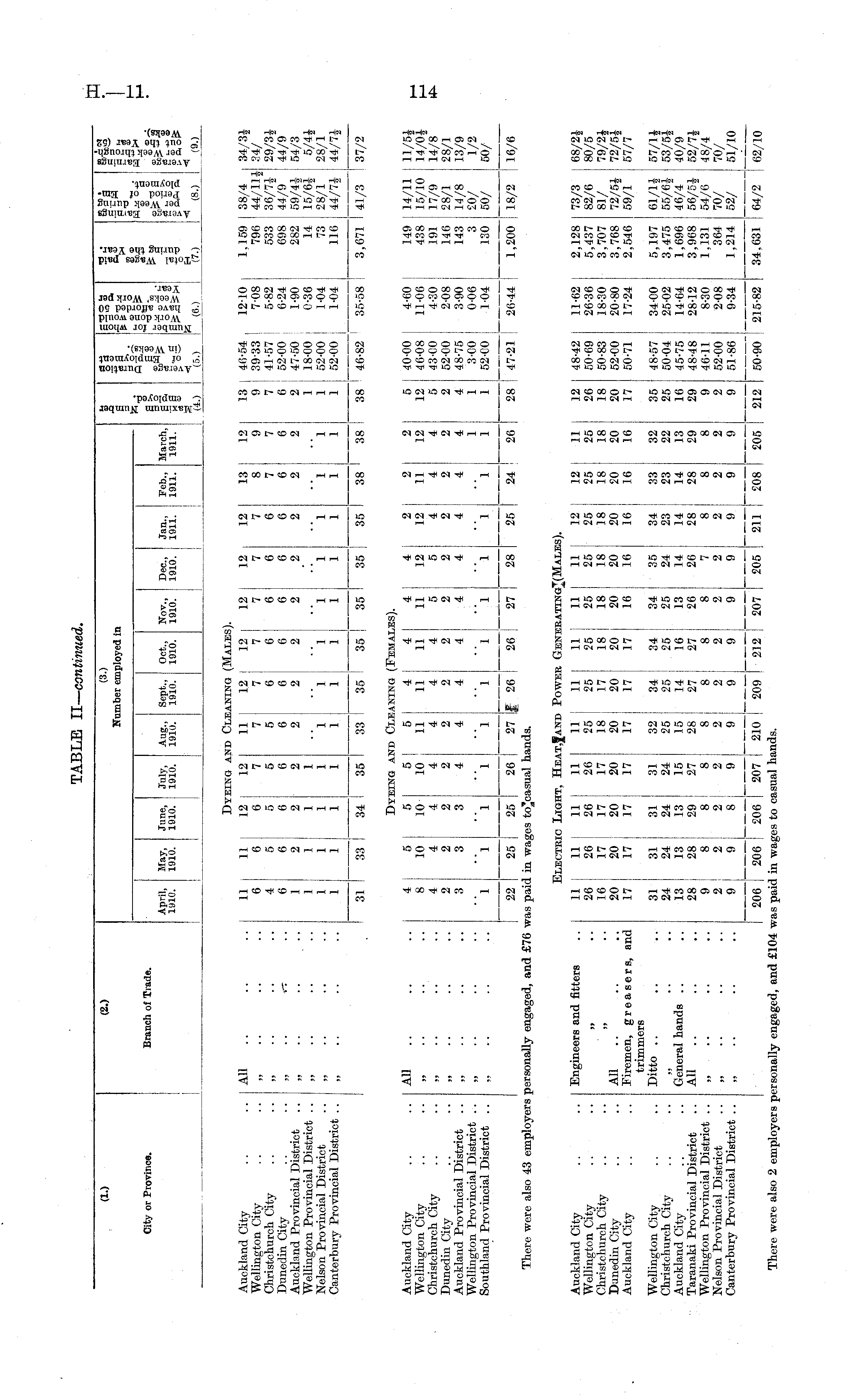 (1.) (2.) (3.) Kumber employed in 1 ■8 9 lisa £ f «-a It i> « to • Ha o-g "tp- s 6. If! Hi a> o s>. ■a) City or Province. Branch of Trade. April, May, June, July, Aug., Sept., Oct., Nov., Dec, Jan., Feb., March, 1010. 1910. 1910. 1910. 1910. 1910. 1910. 1910. 1910. 1911. 1911. 1911. (4.) 28 g'oS fit (6.) (8.) (9.) Dyeing aj nd Cleaning (Males). Auckland City .. .. All .. .. 11 11 12 ] 12 Wellington City .. .. „ .. .. .. 6 6 6 7 Christchurch City .. .. .. 4 5 5 j 5 Dunedin City .. .. „ .. i-r .. 6 6 6| 6 Auckland Provincial District .. „ .. .. .. 1 2 j 2 2 Wellington Provincial District .. ,, .. .. .. 1 1 1 1 Nelson Provincial District „ .. ,. .. 1 i 1 1 1 Canterbury Provincial District .. „ .. .. .. 1 1 1 1 11 12 j 12 12 12 7 7 J 7 7 7 5 6 6 6 6 6 6 6 6 6 2 2 2 2 2 1 1 1 I ' 1 1 1 1 1 j 1 1 12 7 6 6 2 13 12 8 9 7 7 j 6 6 2 2 13 I 46-54 , 12-10 1 9 39-33 ! 7-08 j 7 41-57 I 5-82 6 ! 52-00 : 6-24 j 2 I 47-50 : 1-90 1 18-00 : 0-36 ] 1 52-00 , 1-04 1 1 52-00 : 1-04 38 ! 46-82 ' 35-58 | 1 1,159 796 533 698 282 116 38/4 ; 44/111 36/7J 44/9 59/41 15/6J 28/1 44/71 i 34/31 34/ 29/3J 44/9 54/3 28/1 44/7J "l 1 "l "l 1 M I 1 31 33 ! 34 ! 35 I I ! I 33 I 35 i 35 ! 35 35 I 35 ! 38 ' 38 3,671 ! I 41/3 I 37/2 Dyeing ai nd Cleaning (Females). 2 12 4 2 4 2 ! 2 1 11 12 4 4 2 2 4 4 1 1 1 . ■ - I 5 40-00 ! 4-60 12 46-08 11-06 J 5 43-00 4-30 i 2 52-00 I 2-08 4 48-75 ! 3-90 | 1 3-00 I 0-06 1 52-00 i 1-04 j 149 438 191 146 143 130 14/11 15/10 17/9 28/1 I 14/8 20/ 50/ 11/51 14/OJ 14/8 28/1 I 13/9 1/2 I 50/ Auckland City .. .. All .. .. 4 | 5 5 5 Wellington City .. .. „ .. .. .. 8 10 10 10 Christchurch City .. „ .. .. .. 4 4 4 4 Dunedin City .. „ .. .. .. 2 2 2 2 Auckland Provincial District .. „ .. .. .. 3 3 3 4 Wellington Provincial District .. „ Southland Provincial District „ ... .. .. 1 1 1 1 22 25 25 26 | There were also 43 employers personally engaged, and £76 was paid in wages to]casual hi I 5 I 4 4 ! 4 4 11 11 11 J 11 12 j 4 4 4 ! 5 5 2 2 2 i 2 ! 2 4 4 4 j 4 4 11111 . j 27 if 26 26 I 27 j 28 ands. "' J hs" I 16/6 I 24 ! 26 28 J 47-21 j 26-44 1,200 18/2 I Electeic Light, Hea lt,Jand Power GeneratingJ(Male 11 I 11 I 11 I 11 j 11 25 25 25 ! 25 25 18 17 18 18 18 20 20 20 i 20 20 17 I 17 17 16 16 32 34 I 34 34 I 35 25 25 j 25 i 25 i 24 15 I 14 I 16 ! 13 ! 14 28 I 27 I 27 I 26 26 8 I 8 ! 8 8 7 2| 2 2 j 2 2 9 J 9 9 J 9 j 9 I 210 I 209 212 ] 207 | 205 | inds. (S). 12 11 25 25 18 18 20 20 16 16 12 I 48-42 11-62 26 50-69 26-36 18 50-83 18-30 20 52-00 20-80 17 50-71 17-24 2,128 5,437 3,707 3,768 2,546 73/3 82/6 81/ ! 72/51 i 59/1 68/2J 80/5 79/2* 72/51 57/7 Auckland City .. .. Engineers and fitters .. 11 I 111 11 | 11 I Wellington City .. .. „ .. 26 26 I 26 [ 26 I Christchurch City .. .. „ .. 16 | 17 | 17 i 17 Danedin City .. .. All .. .. .. 20 j 20 j 20 | 20 Auckland City .. .. Firemen, greasers, and 17 I 17 I 17 17 trimmers Wellington City .. .. Ditto .. .. .. 31 31 I 31 31 Christchurch City .. .. „ .. .. 24 24 | 24 i 24 Auckland City .. .. General hands .. .. 13 13 13 15 Taranaki Provincial District .. All .. .. .. 28 j 28 ! 29 i 27 Wellington Provincial District .. „ .. .. .. 9 8 j 8 1 8 i Nelson Provincial District .. „ . ■ . • .. 2 2 J 2 2 Canterbury Provincial District .. „ .. .. .. 9 > 9 '■ 8 : 9 _. I I L 206 ] 206 I 206 | 207 There were also 2 employers personally engaged, and £104 was paid in wages to casual ha 12 25 18 20 16 34 23 14 28 8 2 9 33 32 23 22 14 13 28 29 8 8 2 2 9 9 i 35 48-57 i 34-00 25 50-04 I 25-02 16 45-75 14-64 29 48-48 28-12 9 46-11 ! 8-30 ! 2 52-00 I 2-08 J 9 51-86 9-34 5,197 3,475 1,696 I 3,968 1,131 364 1,214 61/11 55/6J ! I 46/4 56/5J 54/6 70/ 52/ 64/2 57/1J ! 53/51 40/9 52/7* 48/4 70/ 51/10 211 I ! 208 205 _. I 212 50-90 215-82 ! ! 34,631 i 62/10