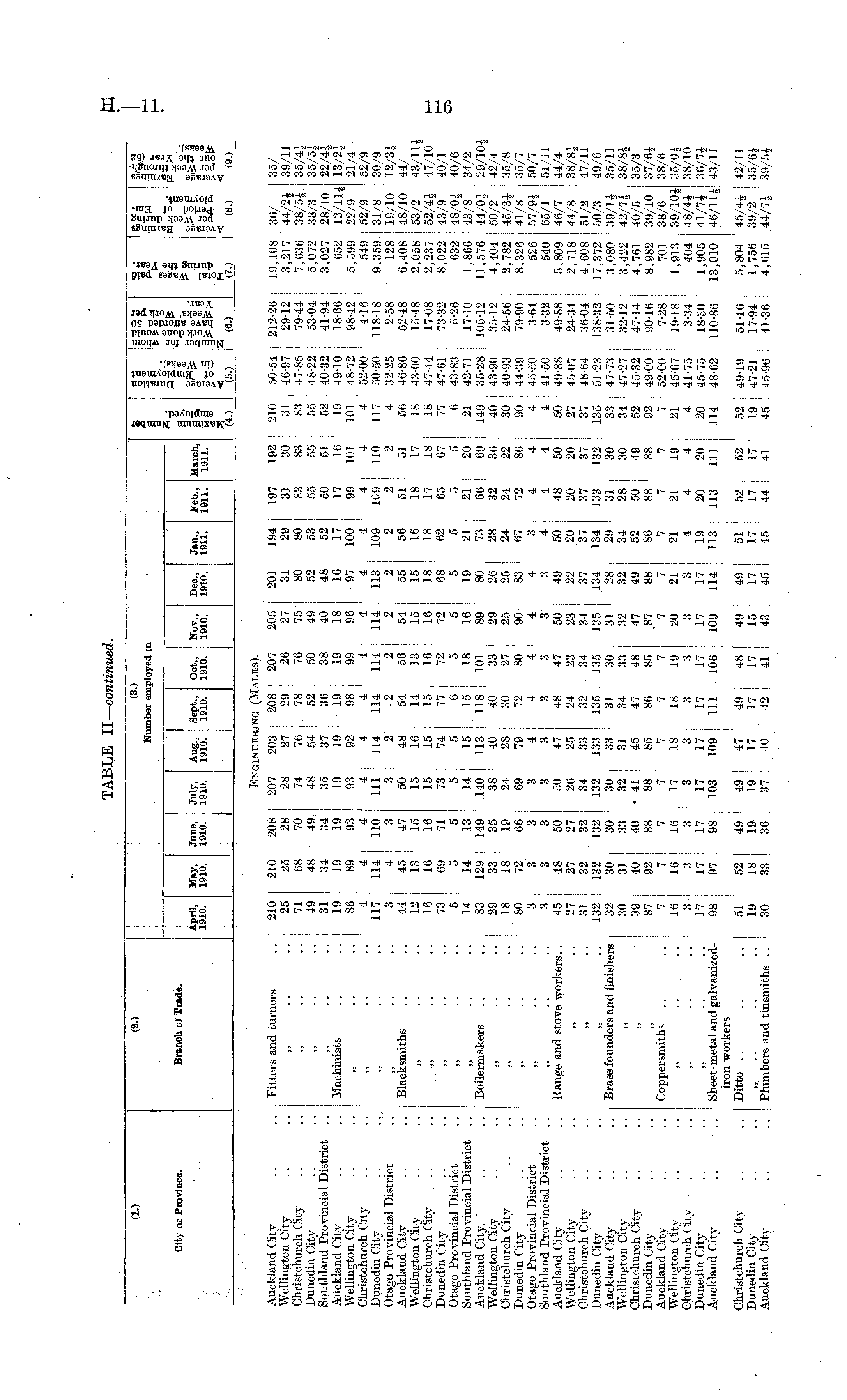 tt.) City or Province. (2.) Branch of Trade. May, June, Julv, Aug., Sept., Oct., 1910. 1910. 1910. 1910. ; 1910. 1910. i (3.) Number employed in Feb., March, 1911. 1911. '*§ f estS 'r*r a g o'SS (5.) £ o a a. t (6.) °l£ r* "eS fl ■g* (7.) a-g| I.?- — i-h h a -8 &r=|s sgsa SS.O S%-r$ (-■) i (9.) April, 1910. Nov., 1910. Dee., 1910. Jan., 1911. Auckland Citv .. .. ; Fitters and turners .. 210 210 208 Wellington City . . .. „ .. .. 25 25 . 28 Christchurch City .. .. „ .. .. 71 68 70 Dunedin City * .. .. j „ .. .. 49 48 ; 49 Southland Provincial District .. ' „ .. .. 31 34 34 Auckland City . T . . Machinists .. .. 19 19 ! 19 i Wellington City .. . . „ .. .. 86 89 93 Christchurch City .. . . „ .. .. 4 4 4 Dunedin City .. ,,, „ .. 117 114 [ 110 ! Otago Provincial District .. „ .. ,. 3 4 ' 3 | Auckland City .. .. Blacksmiths .. .. 44 45 | 47 Wellington City .. .. „ .. .. 12 13 15 Christchurch Citv .. .. .„ .. .. 16 16 | 16 Dunedin City . . . . „ .. .. 73 69 [ 71 j Otago Provincial District .. „ .. .. 5 5 i 5 i Southland Provincial District .. „ .. .. 14 14 ! 13 Auckland City " .. .. Boilermakers .. .. 83 129 149 ; Wellmgton City . . .. „ .. .. 29 [ 33 | 35 Christchurch Citv .. .. „ .. .. 18 18 19 Dunedin City .. .. „ .. .. 80 ; 72 66 Otago Provincial District .. „ .. .. 3 3 3 Southland Provincial District .. „ .. .. 3 3 3 Auckland City .. .. Bange and stove workers.. 45 48 50 Wellington City ... .. „ 27 27 27 Christchurch Citv .. .. „ 31 32 32 i Dunedin City .. .. „ 132 132 132! Auckland City .. .. Brass founders and finishers 32 30 30 , Wellington City .. .. „ 30 31 33 Christchurch City . . .. „ 39 40 , 40 Dunedin City .. .. „ 87 92 88 Auckland City .. .. Coppersmiths .. .. 7 7 ! 7 Wellington City .. .. ,. .. ..16 16 I 16 | Cliristchurch City .. .. „ .. .. 3 3 3 Dunedin City .. .. „ .. .. 17 17 17 Auckland City .. - .. Sheet-metal and galvanized- 98 97 , 98 iron workers Christchurch City .. .. Ditto . . .. .. 51 52 [ 49 j Dunedin City .. .. „ .. .. ... 19 18 j 19 Auckland City .. .. | Plumbers and tinsmiths .. 30 33 36 Engineering (Males). 207 203 208 207 205 201 194 I 197 192 I 210 50-54 212-26 19,108 36/ 28 27 [29 26 i 27 31 29 31 30 31 , 16-97 j 29-12 ! 3,217 44/2* 74 76 78 76 75 80 i 80 83 83 83 47-85 ' 79-44 ! 7,636 38/5} 48 54 ! 52 ! 50 49 52 53 55 55 55 48-22 53-04 ! 5,072 38/3 35 37 36 38 40 48 52 50 51 : 52 40-32 41-94 3,027 28/10 19 19 19 19 18 ! 16 17 17 16 19 49-10 18-66 652 13/11} 93 92 98 99 96 97 100 99 101 101 48-72 98-42 5.599 22/9 4 444444444 52-00 4-16 ' 549 I 52/9 111 114 114 114 114 113 109 1C9 110 117 50-50 118-18 ! 9,359.! 31/8 3 2-2 2 2 2 2 2 2.4 32-25 : 2-58 128 ! 19/10 ! 50 48 i 54 56 54 55 56 51 51 56 46-86 ; 52-48 , 6,408 48/10 15 16 '• 14 13 15 ! 15 16 18 17 18 ; 43-00 ! 15-48 I 2,058 i 53/2 15 15 15 16 16 [ 18 18 17 18 18 47-44 : 17-08 ! 2,237 ! 52/4* 73 74 ! 77 72 72 ; 68 62 65 67 77 I 47-61 ' 73-32 : 8,022 43/9 5 5 6 5 5 5 5 5 5! 6 43-83 5-26 ! 632 48/0} 14 15 15 18 16 19 21 2] 20 2] 42-71 17-10 1,866 ' 43/8 140 113 118 101 89 80 73 66 69 149 35-28 10512 ■ 11,576 44/0} 38 40 40 33 29 26 28 32 36 40 43-90 35-12 4,404 50/2" 24 28 30 27 25 25 24 24 22 30 40-93 24-56 2,782 45/3} 69 79 72 ! 80 ! 90 83 67 72 86 90 44-39 79-90 I 8,326 j 41/8 3 4 4 4 41 4 3 4 4 4 45-50 : 3-64 | 526 57/9} 3 3 3 3 3 3|4j4 4 4 41-50 ! 3-32 '■ 540 65/1 50 47 48 47 i 50 49' 50 48 50 50 i 49-88 | 49-88 5,809 46/7 26 25 24 23 23 22 20 20 20 27 45-07 24-34 2,718 44/8 34 33 32 34 34 37 : 37 37 37 37 48-64 36-04 4,608 51/2 132 133 135 135 135 134 134 : 133 132 135 51-23 138-32 17,372 50/3 30 33 31 30 31 28 29 31 30 33 47-73 31-50 3,080 39/1} 32 31 34 33 32 32 34 28 30 34 47-27 32-12 3,422 42/7* • 41 45 47 48 47 49 52 50 49 52 45-32 ; 47-14 4,761 40/5 88 85 86 85 87 : 88 86 88 88 ■ 92 49-00 9016 ' 8,982 ! 39/10 7 7 7 7 7 717 7 7J7 52-00 7-28 ! 701 [ 38/6 17 18 18 19 20 j 21 : 21 21 19 I 21 45-67 1918 I 1,913 39/10* 3 3 ] 3 3 3!3 4 4 414 41-75 3-34 404 : 48/4* 17 17 17 ; 17 17 17 19 20 20 20 45-75 18-30 ! 1,905 41/7* 103 109 ' 111 106 109 114 113 113 111 114 48-62 110-86 13,010 ! 46/11} 49 47 49 48 49 49 51 52 52 52 49-19 51-16 5,804 45/4} 19 17 , 17 17 15 17 17 17 17 19 47-21 17-94 1,756 39/2 37 40 42 41 43 45 ! 45 44 I 41 45 45-96 41-36 4,615 44/7} 35/ 39/11 35/4} 35/5} 22/4} 13/2} 21/4 52/9 1 30/9 . 12/3} 44/ 43/11, 47/10 40/1 40/6 34/2 29/10, 42/4 35/8 35/7 50/7 51/11 44/4 38/8} 47/1 1 49/6 35/11 38/8} 35/3 37/6} 38/6 35/0-1 38/10 36/7} 43/11 42/11 35/6} 39/5}