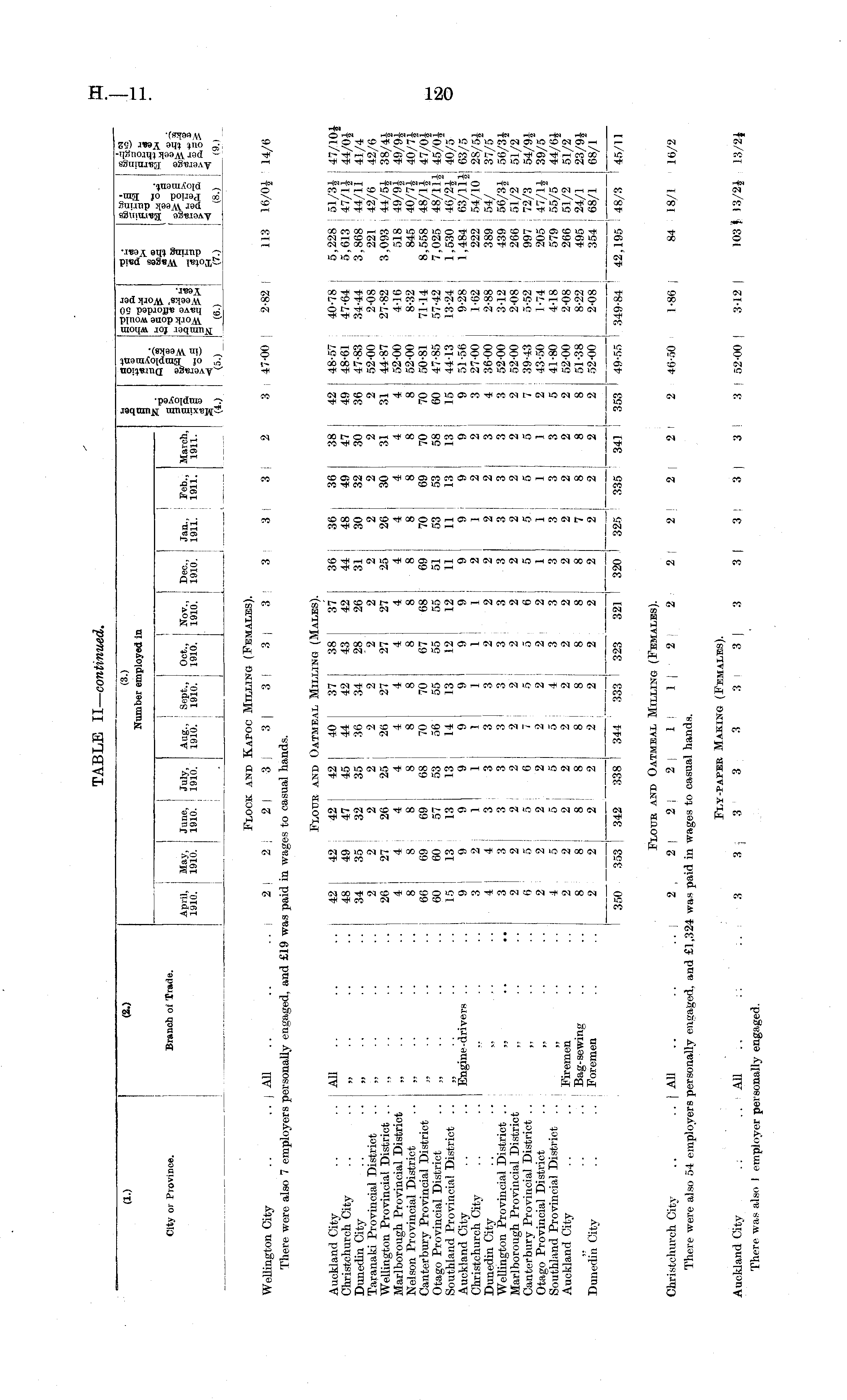 tt.) (2.) (3.) Number employed in .= CD ■a a Siraags ! <dT__° -a .i o co II a oh a) COrr-TS C M)! 5 .2 g g PlFr Ot •4 tZ —' eS CO co ■ S^*8 0- P. OrCity or Province. Branch of Trade. I ! | ! April, May, June, July, Aug., Sept., Oct., Nov., Dec., Jan., ! Feb., 1910. 1910. 1910. 1910. 1910. i 1910. 1910. 1910. 1910. 1911. ! 1911. March, 1911. ll ect ei as (5.)_ . e* act g-S "-'Sri gsM-Sli t (7.) I • I . I. («■> (8.) (9.) Flock and T Kapoc Milling (Females). Milli: "G (FEM :ales). Wellington City .. . . | All .. .. .. | 2 | 2 | 2 j 3 j There were also 7 employers personally engaged, and £19 was paid in wages to casual hai 1 3 | 3 f 3 | 3 1 ,nds. 3 3 I 3 3 3 I 3 3 47-00 : 2-82 ; 113 16/0} 14/6 Flour and i Auckland City .. .. All .. .. .. 42 42 , 42 42 Christchurch City .. .. „ .. . • •. 48 49 I 47 45 Dunedin City .. .. „ .. .. • - 34 35 i 32 35 Taranaki Provincial District „ .. .. .. 2 2 2 2 Wellington Provincial District .. „ .. .. .. 26 27 26 25 Marlborough Provincial District „ .. .. .. 4 4 4 4 Nelson Provincial District „ .. .. .. 8 8 ■ 8 8 Canterbury Provincial District „ .. .. .. 66 69 , 69 68 Otago Provincial District „ .. .. .. 60 60 57 53 Southland Provincial District .. „ .. .. .. 15 13 13 13 Auckland City .. .. Engine-drivers .. .. 9 9 9 9 Christchurch City .. . . „ .. .. 3 2 1 1 Dunedin City .. ,. ; „ ."',. .. 4 4 3 3 Wellington Provincial District .. „ .. .. 3 3 I 3 3 Marlborough Provincial District ,. .. .. 2 2 [ 2 2 Canterbury Provincial District .. „ .. . . 6 5 5 6 Otago Provincial District .. „ .. .. 2 2 2 2 Southland Provincial District .. ,. . . .. 4 5 5 ; 5 Auckland City .. .. ' Firemen .. . . 2 2 j 2 ; 2 ,. .. .'. Bag-sewing .. .. 8 8 8 8 Dunedin City .. .. Foremen .. .. 2 2 [ 2 : 2 350 353 | 342 338 Oatmeal Milling (Males). 40 37 38 ! 37 44 42 43 42 36 34 28 26 2 2 2 2 26 27 27 27 4 4 4 4 8 8 8 8 70 70 67 68 56 55 55 55 14 13 12 12 9 9 9 9 1 1 1 | 1 3 3 2 2 3 3 3 3 2 2 2 2 7:5 5 6 2 2 2 2 5 4 3 3 2 2 2 2 8 [ 8 8 8 2 2 2 2 344 333 323 321 36 44 31 2 25 4 8 69 51 11 9 2 2 3 2 5 1 3 2 8 2 36 36 38 48 49 47 30 32 30 2 2 2 26 30 31 4 4 4 8 8 8 70 69 70 53 53 58 11 13 13 | 9 9 9 ! 1 2 2 2 2 3 3 3 3 2 2 2 5 5 5 1 1 1 3:3 3 2 2 2 78 8 2 2 2 325 335 341 42 49 36 2 31 4 8 70 60 15 9 3 I 4 3 2 7 2 5 2 8 2 48-57 40-78 5,228 I 51/3* I 47/10, 48-61 47-64 5,613 ! 47/1* 44/0*' 47-83 : 34-44 3,868 ' 44/11 41/4 52-00 2-08 221 : 42/6 42/6 44-87 27-82 3,093 44/5} 38/4* 52-00 4-16 518 , 49/9* 49/9* 52-00 8-32 845 | 40/7* 40/7* 50-81 71-14 8,558 ! 48/1* 47/0* 47-85 57-42 7,025 ' 48/11* 45/0* 44-13 13-24 1,530 46/2* 40/5 51-56 9-28 1,484 63/11* 63/5 | 27-00 ! 1-62 222 : 54/10 | 28/5} 36-00 ! 2-88 389 ! 54/ 37/5 52-00 ! 3-12 439 i 56/3} 56/3} 52-00 2-08 266 ! 51/2 51/2 39-43 5-52 • 997 ! 72/3 54/9} 43-50 1-74 I 205 [ 47/1* 39/5 41-80 4-18 j 579 55/5" 44/6} 52-00 2-08 ■ 266 51/2 51/2 51-38 8-22 495 24/1 23/9} 52-00 2-08 354 ! 68/1 68/1 49-55 '' 349-84 42,195 48/3 45/11 320 353 Flour and Oai tmeal Milling (Females). j 1 ; 1 | • 2 2 2 2 | 2 1 46-50 1-86 j 84 18/1 16/2 Christchurch City .. .. | All .. .. .. | 2 , 2 | 2 2 | There were also 54 employers personally engaged, and £1,324 was paid in wages to casual I hands. 2 16/2 Fly-paper : Making (Females). ! 3 i 3 | 3 ! j 52-00 | 312 j 103 j 13/2} 13/2* Auckland City .: .. All .. :: . . 3 3,3 3 3 3:3 | 3 3 13/2* There was also I employer personally engaged.