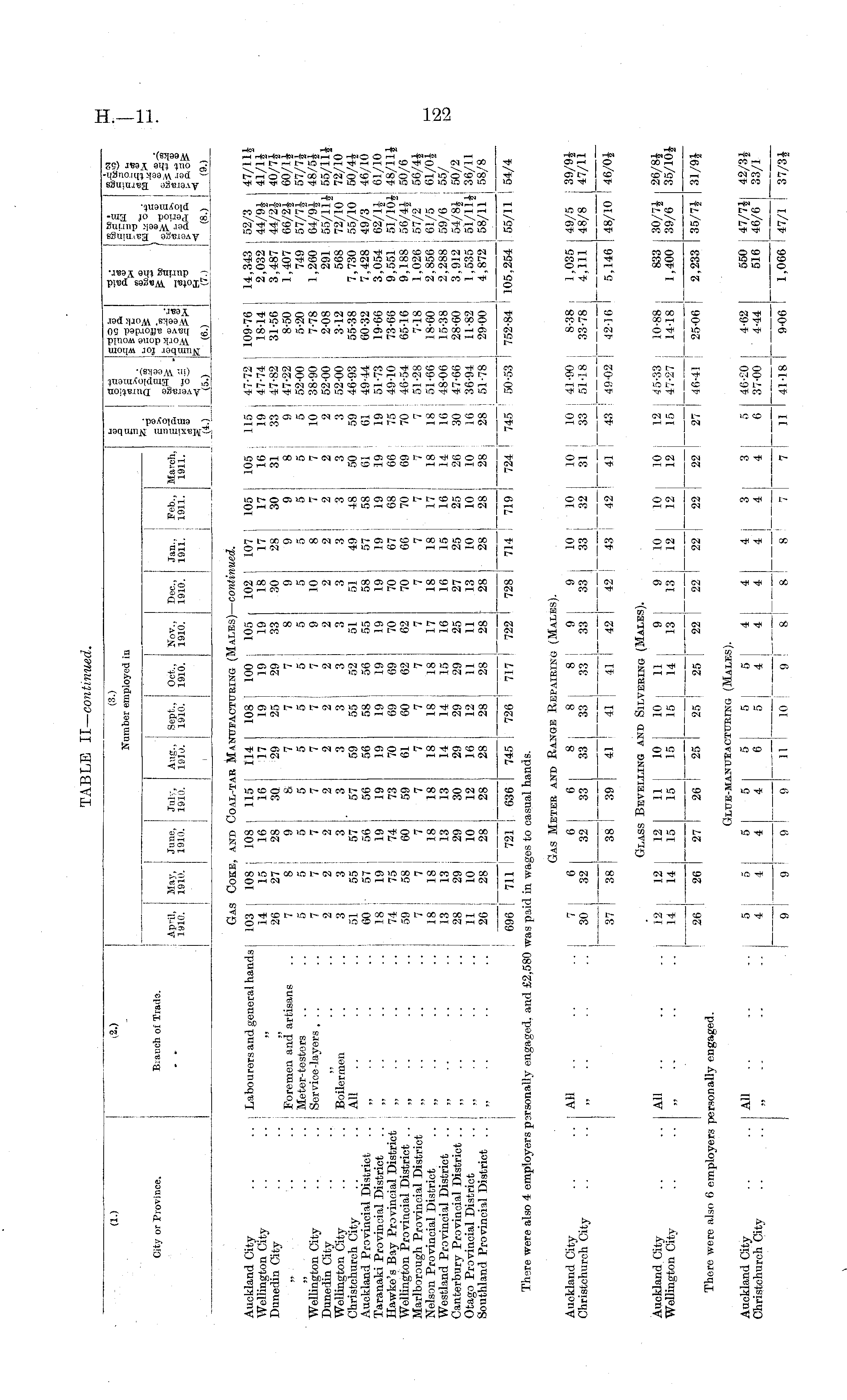 tt.) ;i.; (2.) rO Is eel O OS —i O-H tj "S e3 S?=H SsSo g ftpHp, SJ MiS. 5 3 eo CO erfrr i- PHCI--i Number employed in City or Province. Branch oi Trade. i April., May, June, July, i 1910. 1910. 1910. 1910. i Aug., Sept., [ Oct., Nov., 1910. 1910. I 1910. 1910. I Bee, Jan.. Feb., 1910. 1911. 1911. i March, 1911. if B P. Ji.) paps (5.) . ns rs- m | M 6=1-1 t Hex: (7.) I (6.) (8.) (9.) Gas Coke, and Coal-t.ir Manufacturing (Males) — continued. Auckland City .. .. Labourers and general hands i 103: 108 108 115 114 108! 100 105 102 107 105 105 115 1 47-72 109-76 14,343:52/3 47/11} Wellington City .. .. „ 14 i 15 16 16 17 19 ! 19 19 18 17 17 16: 19 47-74 1814 2,032 ! 44/9} 41/1} Dunedin City .. .. „ 26 27 28 3Q 29 25! 29 33 30 28 30 31 33; 47-82 31-56 3,487 ! 44/2* 40/7* .. Foremen and artisans .. 7 8 9 8 7 7 7 8 9 9 9 8 ! 9 ! 47-22 8-50 1,407 [66/2* 60/1} .. : Meter-testers .. .. 5 ! 5 5 5 5 5 | 5 5 5 5 5 5 ! 5 52-00 5-20 749 57/7} 57/7* Wellington City .. .. ! Service -lavers... .. 7 7 7 7 7 7:7 9 10 8 7 7 10 38-90 7-78 1,260 64/9* 48/5} Dunedin City .. ..[ „ . .. 2:2 2 2 2 2; 2 2 2 2 2 2!2 52-00 j 2-08 291 55/11} 55/11} Wellington City .. .. [ Boilermen .. ,. 3 3 3 3 3 3 ! 3 3 3 3 3 3 3 52-00 ; 312 568 72/10 72/10 Christchurch City .. .. All .. .. .. 51 55 57 ' 57 59 55 52 51 51 49 48 50! 59 46-93 ] 55-38 7,730 55/10 50/4} Auckland Provincial District .. „ .. .. .. 60 • 57 56 56 56 58 I 56 55 58 57 58 61 61 ! 49-44 60-32 7,428 49/3 46/10 Taranaki Provincial District .. „ .. .. .. 18 19 19 19 19 19 I 19 19 19 19 19 19 19 51-73 19-66 3,054,62/1* 61/10 Hawke's Bay Provincial District „ ,. .. .. 74 j 75 74 73 70 69; 69 70 70 67 68 66 75 4910 73-66 9,551 ! 51/10} 48/11* Wellington Provincial District .. „ .. .. .. 59 58 60 59 61 60 [ 62 62 70 66 70 69 70 46-54 6516 9,188 ! 56/4} 50/6 Marlborough Provincial District „.. .. .. 7 7 7 7 7 7 7 7 7 7 7 7 7 51-28 718 1,026! 57/2 56/4} Nelson Provincial District .. ., .. .. .. 18 18 18 18 18 18 ; 18 17 18 18 17 18 18: 51-66 18-60 2,856 61/5 61/0} Westland Provincial District .. „ .. .. .. 13 13 13 13 14 14 [ 15 16 16 15 16 [ 14; 16! 48-06 15-38 2,288 59/6 ! 55/ Canterbury Provincial District .. „ .. .. .. 28 29 29 30 29 29 1 29 25 27 25 25! 26! 30 j 47-66 28-60 3,912 54/8} i 50/2 Otago Provincial District .. „ .. .. .. 11 10 10 12 16 12 : 11 11 13 10 10! 10 16 36-94 11-82 ; 1,535 51/11*36/11 Southland Provincial District .. .. 26 28 28 28 28 28 j 28 28 28 28 28! 28: 28! 51-78 29-00 [ 4,872 58/11 j 58/8 ! i ' I ■ ' 696 I 711 721 636 745 726 ' 717 722 728 714 719 I 724 ' 745 : 50-53 ' 752-84 ! 105,254 55/11 | 54/4 There were also 4 employers psrsonally engaged, and £2,580 was paid in wages to casual hands. Gas Meter and Bange Repairing (Males). Auckland City .. .. All .. .. I 7 6 6 6 8 8 : 8 9 9 I 10 I 10 10 I 10 I 41-90 I 8-38 | 1,035 49/5 39/9* Christchurch City .. .. .. .. 30 32 32 33 33 ! 33 33 33 33 33 [ 32 31 33 i 51-18 ! 33-78 4,111 48/8 47/11 : I | , | | 37 : 38 38 39 41 ! 41 41 42 42 i 43 j 42 41 I 43 | 49-02 I 42-16 5,146 48/10 46/0* Glass Bevelling and Silvering (Males). Auckland City .. .. All .. .. .. 12 12 12 11 10 10 ; 11 9 9 10 10 10 12 45-33 : 10-88; 833 30/7* 26/8} Wellington Citv .. .. .. .. .. 14 14 15 15 15 15 ! 14 13 13 12 12 12 15 47-27 \ 1418 1,400 39/6 35/10* : i i 26 26 27 26 25 25 I 25 22 22 22 22 22 27 46-41 | 25-06 ! 2,233 35/7* 31/9* There were also 6 employers personally engaged. Glue-manueacturikg (Males). Auckland City .. . . All .. .. . . 5 ; 5 5 5 5 5 I 5 4 4 4 3 3 5 46-20 4-62 550 j 47/7} 42/3* Christchurch City .. .. „.. .. .. 4 4 4 4 6 5|4 4 4 4 4 4 6 37-00 4-44 516 j 46/6 33/1 9 9 9 I 9 11 10 9 '' 8 [ 8 8 7 7 11 41-18 9-06 1,066 I 47/1 37/3*