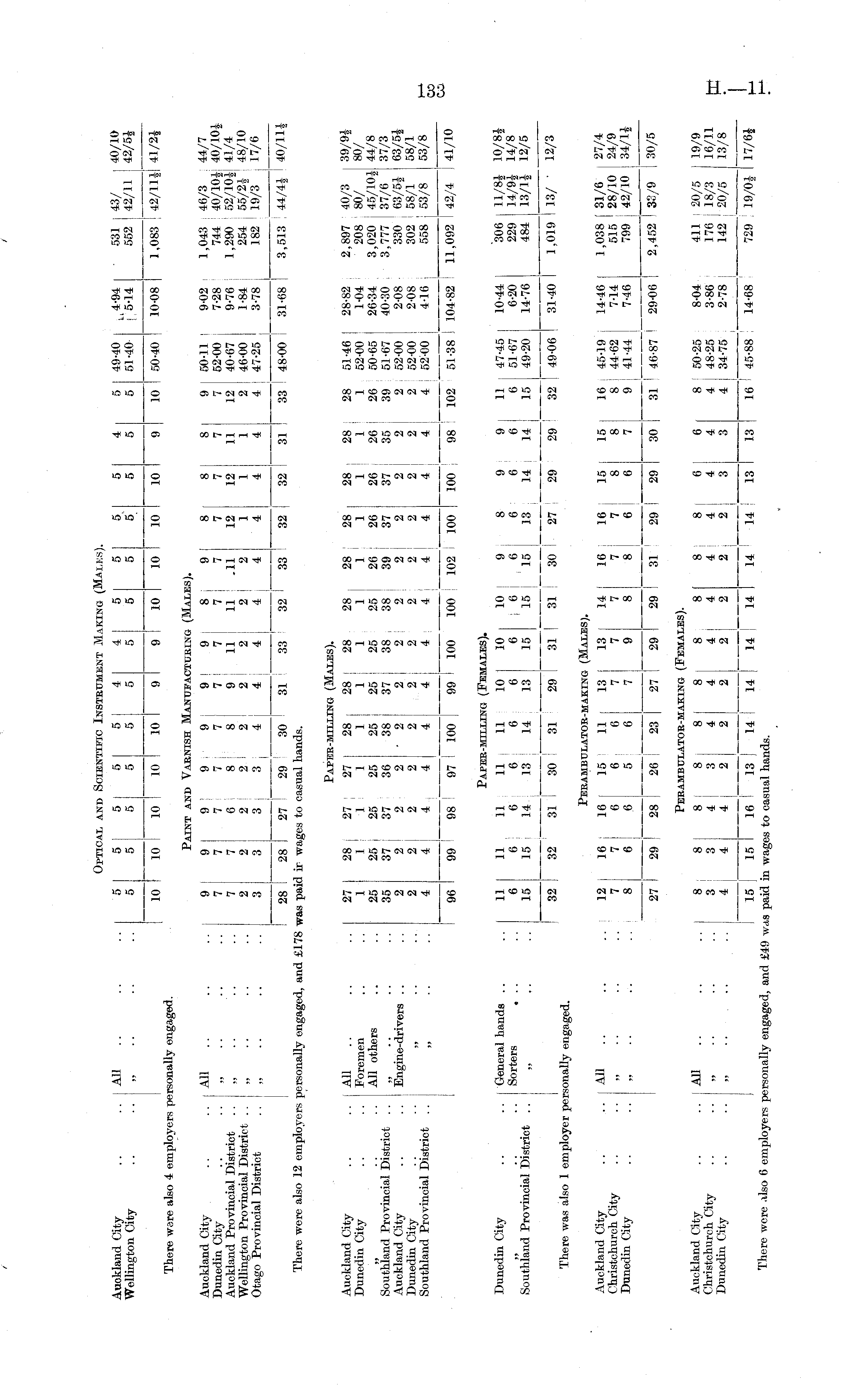 Optical and Scientific Instrument Making (Males). Optii Auckland City .. ..All.. .. .. 5 5 5 5 5 4 4 5 5 5 5 4 5 49-40 L 4-94 531 43/ j 40/10 Wellington City .. .. „.. .. .. 5 5 5 5 5 5 5 5 5 5 5 5 5 51-40 [,514 552 42/11 42/5* 10 10 10 10 10 9 9 10 10 10 10 9 10 50-40 10-08 1,083 42/11*1 41/2* There were also 4 employers personally engaged. 5 5 10 5 5 Paint and Varnish Manufacturing (Males). Auckland City .. .. All .. .. .. 9 9 9 | 9 I 1 9 I 9| 9 8 ! 9 8 8 8 9 5011 I 9-02 i 1,043 I 46/3 44/7 Dunedin City .. .. „.. .'. .. 7 7 77:7 77 7 7 7 7 7 7 52-00 7-28 744 ! 40/10* 40/10* Auckland Provincial District .. „ .. .. .. 7 7 6 8 8 9 11 11 ! .11 12 12 11 12 40-67 9-76 | 1,290 52/10* 41/4 Wellington Provincial District .. .. .. .. 2 2 2-2-2 2 2 2 j 2 1 1 1 2 46-00 1-84 : 254 , 55/2* ! 48/10 Otago Provincial District .. .. .. .. 3 3 3; 3 j 4 j 4; 4 4' 4' 4 4 4 4; 47-25 3-78 ; 182 19/3 , 17/6 ! 28 28 27 I 29 30 31 33 32 ; 33 32 | 32 31 33 ! 48-00 I 31-68 | 3,513 I 44/4* ' 40/11* There were also 12 employers personally engaged, and £178 was paid ir wages to casual hands. Paper-milling (Males). Auckland City .. ..All .. .. .. 27 28 27 27 28 ; 28 : 28 28 : 28 28 28 > 28 28 51-46 j 28-82 I 2,897 40/3 39/9* Dunedin City .. .. Foremen .. .. 1 1 11 111 1.11 111 52-00 1-04 208 80/ 80/ ..All others .. ..25 25 25 25 25 ! 25 ! 25 25 j 26 26 26 , 26 ! 26 50-65 26-34 , 3,020 j 45/10* 44/8 Southland Provincial District .. „ .. .. .. 35 37 37 36 38 37 ' 38 , 38 [ 39 37 37 35 ! 39 51-67 40-30 3,777 | 37/6 37/3 Auckland City .. .. Engine-drivers .. .. 2 2 2 2 ' \ 2 2 ! 2 : 2 ! 2 2 2 2 i 2 52-00 2-08 330 ! 63/5* 63/5* Dunedin City .. .. „ .. .. 2 2 2 2 2 2 2 2 2 2 2 212 52-00 i 2-08 302 ! 58/1 58/1 Southland Provincial District .. „ .. .. 4 4 4,4 4 4 ; 4 . 4 : 4 4 4 4 4 1 52-00 j 416 558 53/8 53/8 96 99 98 ! 97 100 99 I 100 100 [ 102 I 100 100 | 98 102 51-38 I 104-82 ! 11,092 42/4 41/10 Paper-milling (Females). Dunedin City .. .. General hands .. .. 11 11 11 1 11 j 11 10 10 10 9 8 9 9 j 11 47-45 10-44 306 11/8* 10/8* .. Sorters ... .. 6 6 | 6 6 | 6 6 6 i 6 6 6 6 6 6 51-67 6-20 229 14/9* 14/8 Southland Provincial District .. „ .. .. 15 15 14 13 14 13 15 15 ! 15 13 14 j 14 15 49-20 14-76 484 13/1* 12/5 32 32 31 30 | 31 29 31 [ 31 30 27 29 29 : 32 49-06 31-40 1,019 13/ 12/3 There was also 1 employer personally engaged. Perambulator-making (Males). Auckland City .. .. All .. .. ; 12 i 16 16 15 11 ; 13 13 14 16 16 | 15 15 16 I 4519 : 14-46 1,038 31/6 27/4 Christchurch City .. .. .. 7 7 6 6 67 7 7 7 7|8 8 8! 44-62 j 7-14 515 28/10 24/9 Dunedin City .. .. .. .. ..8 6 6 5 67 9 8 8 6 6 7 9 41-44 7-46 799 42/10 34/1* 27 29 28 26 I 23 | 27 29 29 31 29 I 29 30 31 | 46-87 I 29-06 2,452 3S/9 30/5 Perambulator-making (Females). Auckland City .. ..All.. .. .. 8 8 8:8 8 8 8 8 8 1 8 I 6 6 8 : 50-25 8-04 411 : 20/5 19/9 Christchurch City .. .-. .. .. .. 3 3 4J3 4 4 4 i 4 4 i 4 [ 4 4 4 48-25 3-86 176 [ 18/3 16/11 Dunedin City .. .. ...... .. 4 4 412 2 2 212 2 2 3 3 4 | 34-75 2-78 142 ! 20/5 13/8 15 | 15 16 I 13 14 14 14 14 14 ! 14 : 13 13 16! 45-88 14-68 729 | 19/0* 17/6* There were also 6 employers personally engaged, and £49 was paid in wages to casual hands.