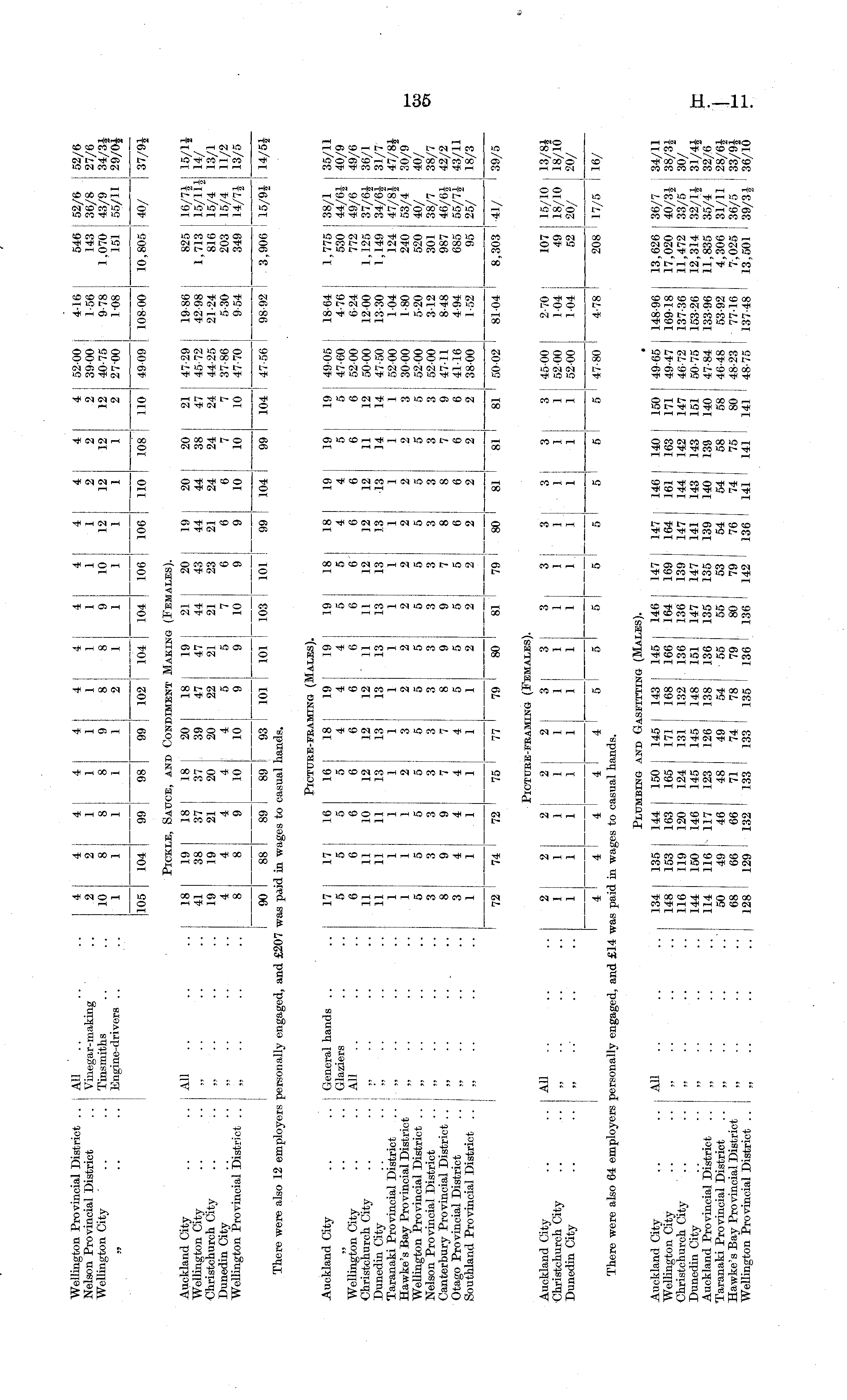 Wellmgton Provincial District ..All.. .. .. 4 4 4 4 4 4 4 4 4 4 4 4 4 52-00 I 4-16 546 52/6 52/6 Nelson Provincial District .. Vinegar-making ..2211111111222 3900 ! 1-56 143 36/8 27/6 Wellington City .. .. Tinsmiths .. ..10 8 8 8 9 8 8 9 10 12 12 12 12 40-75 9-78 1,070 43/9 34/3* .. Engine-drivers .. ..1111121111112 2700 1-08 151 55/11 29/0* 105 104 99 98 99 102 104 104 106 106 110 108 110 4909 10800 10,805 40/ 37/9* 52/6 27/6 34/3, 29/0i Pickle, Sauce, and Condiment Making (Females). Auckland City .. .. All .. .. .. 18 19 18 18 20 I 18 | 19 21 20 ! 19 20 20 21 47-29! 19-86 825 16/7* 15/1* Wellington City .. .. .. .. .. 41 38 37 37 39 47 ! 47 44 43 44 44 38 47 45-72 j 42-98 1,713 15/11* 14/ Christchurch City .. .. .. .. .. 19 19 21 20 20 22 [ 21 21 23 21 24 24 24 44-25 21-24 816 15/4 13/1 Dunedin City .. .. „.. .. .. 4 4 4 4 4 5 5 7 6 6 6 7 7 37-86 5-30 203 15/4 11/2 Wellington Provincial District .. „ .. .. .. 8 8 9 10 10 9 9 10 9 9 10 10 10 47-70 9-54 349 14/7* 13/5 90 88 89 89 93 101 101 103 101 99 104 99 104 47-56 98-92 3,906 i 15/9* 14/5* There were also 12 employers personally engaged, and £207 was paid in wages to casual hands. Picture-framing (Males). Auckland City .. .'. I General hands .. .. 17 17 16 16 18 19 19 19 18 18 19 19 19 4905 18-64 1 1,775:38/1 35/11 .. [ Glaziers .. ..5555444554455 47-60 4-76 I 530 44/6* 40/9 Wellington City .. .. All .. .. 6 6 6 6 6 6 6 6 6 6 6 6 6 5200 6-24 [ 772 49/6 49/6 Christchurch City .. .. | „ .. .. .. 11 11 10 12 12 12 11 11 12 12 12 11 12 5000 1200 1,125 37/6* 36/1 Dunedin City .. .. \ '„ .. .. .. 11 11 11 13 13 13 13 13 13 13 13 14 14 47-50 13-30 1,149 34/6* 31/7 Taranaki Provincial District ...... .. .. 1 1 1 1 1 1 1 1 1 1 1 1 1 5200 104 124 47/8* 47/8* Hawke's Bay Provincial District „ .. .. 1 1 1 2 3 2 2 2 2 2 2 2 i 3 ; 3000 1-80 240 53/4 30/9 Wellington Provincial District ..„-.. .. .. 5 5 5 5 5 5 5 5 5 5 5 5 j 5 52-00 5-20 520 40/ 40/ Nelson Provincial District .. „.. .. .. 3 3 3 3 3 3 3 3 3 3 3 3 i 3 5200 3-12 301 38/7 38/7 Canterbury Provincial District .. „.. .. .. 8 9 9 7 7 8 9 9 7 8 8 7 9 47-11 8-48 987 46/6* 42/2 Otago Provincial District .. „.. .... 3 4 4 4 4 5 5 5 5 6 6 6 6 41-16 4-94 685 55/7* 43/11 Southland Provincial District .. „.. .. .. 1 11 1 1 1 2 2 2 2 2 2 2 3800 1-52 95 25/ 18/3 < 72 74 72 75 77 79 80 81 79 I 80 81 81 ; 81 5002 8104 8,303 41/ 39/5 Picture -framing (Females). Auckland City .. ..All.. .. .. 2 2 2 2 2 3j3 3 3 3 3 3 3 45-00 2-70 107 15/10 13/8* Christchurch City .. .. „.. .. .. 1 1 1 1 1 1 1 1 1 11 1 1 5200 104 49 18/10 18/10 Dunedin City .. ..„..- .. .. 1 1 1 1 1 1 1 1 1.1 1 1 1 5200 104 52 20/ 20/ 4 4 4 4 I 4 I 5 5 5 5 5 5 5 5 47-80 4-78 208 17/5 I 16/ There were also 64 employers personally engaged, and £14 was paid in wages to casual hands. Plumbing and Gasfitting (Males). t Auckland City .. .. All .. .. 134 135 144 150 145! 143 145 146 147 147 146 140 150 49-65 148-96 13,626 36/7 34/11 Wellington City .. .. „ .. .. .. 148 153 163 165 171 | 168 166 164 169 164 161 163 171 49-47 169-18 17,020 40/3i 38/3* Christchurch City .. .. ,. .. .. .. 116 119 120 124 131 132 . 136 136 139 147 144 142 147 46-72 137-36 11,472 33/5 30/ Dunedin City .. .. „ .. .. .. 144 150 146 145 145 I 148 ! 151 147 147 141 143 143 151 50-75 153-26 12,314 32/1* 31/4* Auckland Provincial District .. „ .. .. .. 114 116 117 123 126 j 138 136 135 135 139 140 139 140 47-84 133-96 11,835 35/4 32/6 Taranaki Provincial District .. .. .. .. 50 49 46 48 49 ( 54 55 55 53 54 54 58 58 46-48 53-92 4,306 31/11 28/6* Hawke's Bay Provincial District „ .. .. .. 68 66 66 71 74 I 78 79 80 79 76 74 75 80 48-23 77-16 7,025 36/5 ! 33/9* Wellington Provincial District .. I „ .. .. .. 128 129 132 133 133 ' 135 136 136 I 142 136! 141 141 141 48-75 137-48 13,501 I 39/3 i ' 36/10