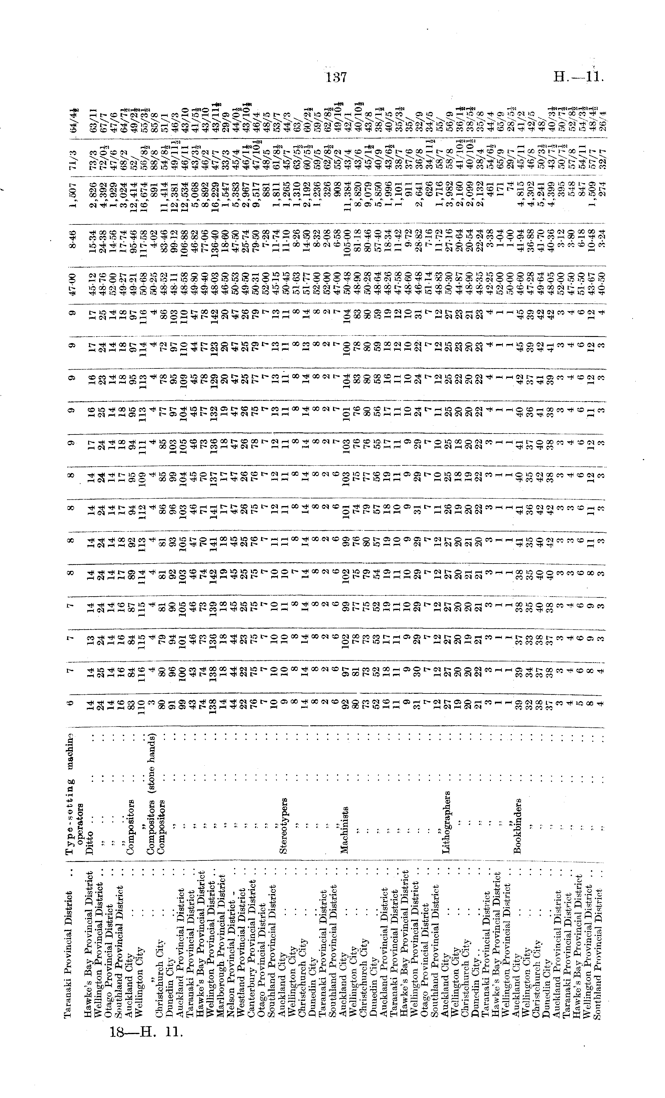 Taranaki Provincial District .. Type-setting machine operators Hawke's Bay Provmcial District Ditto Wellington Provincial District .. „ Otago Provincial District .. „ Southland Provincial District .. „ Auckland City .. .. Compositors Wellington City .. .. „ .. .. Compositors (stone hands) Christchurch City .. .. Compositors Dunedin City .. .. Auckland Provincial District .. „ Taranaki Provincial District .. „ Hawke's Bay Provincial District „ Wellington Provincial District . . „ Marlborough Provincial District „ Nelson Provincial District ... ,. Westland Provincial District .. „ Canterbury Provincial District Otago Provincial District . . ,, Southland Provincial District Auckland City .. .. Stereotypers Wellington City Christchurch City Dunedin City Taranaki Provincial District ... Southland Provincial District .. Auckland City .. .. Machinists Wellington City Christchurch City Dunedin City Auckland Provincial District Taranaki Provincial District .. „ Hawke's Bay Provincial District Wellington Provincial District Otago Provincial District Southland Provincial District. .. „ Auckland City .. .. Lithographers Wellington City Christchurch City Dunedin City.. Taranaki Provincial District Hawke's Bay Provincial District ,, Wellington Provincial District .. „ Auckland City .. . . Bookbinders Wellington City .. .. „ ... Christchurch City Dunedin City .. .. .[ Auckland Provincial District Taranaki Provincial District Hawke's Bay Provincial District ., Wellington Provincial District Southland Provincial District .. | 6 14 24 14 16 83 110 3 80 91 99 43 74 138 14 44 22 76 7 10 9 8 14 8 2 6 92 80 73 52 16 11 9 31 12 27 19 20 21 3 1 1 39 32 38 37 3 4 5 8 4 7 14 25 14 16 84 116 4 80 96 100 43 74 138 18 44 22 75 7 10 10 8 14 8 2 6 97 81 73 52 18 11 9 30 12 27 20 20 22 3 1 1 39 34 37 38 3 4 6 8 4 7 13 24 14 16 84 115 4 79 94 101 46 73 136 18 44 23 75 7 10 10 8 14 8 2 6 102 78 73 53 17 11 9 29 12 27 20 19 21 3 1 1 37 33 38 37 3 4 6 9 3 7 I 14 24 14 16 87 115 4 81 90 105 46 73 139 18 45 25 75 7 10 11 8 14 8 2 6 99 77 75 52 19 11 10 29 7 12 27 20 20 21 3 1 | 38 [ 35 | 40 38 j 3 : 4 6 9 3 8 | 14 24 14 17 89 114 4 81 92 103 46 74 142 19 45 25 75 7 10 10 7 14 8 2 6 102 75 79 54 19 11 10 29 7 12 27 20 21 21 3 1 1 38 35 40 40 3 3 6 8 3 8 14 24 14 18 92 113 4 81 93 105 47 70 141 18 45 25 76 7 11 11 8 14 8 2 6 99 76 80 57 19 10 9 29 7 12 27 20 21 20 3 1 1 41 35 40 42 3 3 6 11 3 8 14 24 14 17 94 112 4 86 96 103 46 71 141 17 47 26 75 7 12 11 8 14 8 2 6 101 74 79 57 18 10 9 31 11 26 19 20 22 3 1 1 41 36 42 42 3 3 6 11 3 8 14 24 14 17 95 109 4 85 99 104 45 70 137 17 47 26 76 7 12 11 8 14 8 2 6 103 75 77 56 19 11 9 29 10 25 18 19 22 3 1 1 40 35 42 38 3 4 6 12 3 9 17 24 14 18 94 111 4 85 103 105 46 73 136 18 47 26 78 7 12 11 8 14 8 2 7 103 76 76 55 17 11 9 29 10 25 18 20 22 3 1 1 41 37 40 38 3 4 6 12 3 9 16 25 14 18 95 113 4 77 97 104 45 77 132 19 47 26 75 7 13 11 8 14 8 2 7 101 76 80 56 17 11 10 24 7 11 25 20 20 22 4 1 1 40 36 41 38 3 4 6 11 3 9 16 23 14 18 95 113 4 78 95 109 45 78 129 20 47 25 77 7 13 11 8 14 8 2 7 104 83 80 58 16 11 10 24 7 12 25 22 20 22 4 1 1 42 37 41 39 3 4 6 12 3 9 17 24 14 18 97 [ 114 72 97 | 110 i 44 77 123 20 47 25 79 7 13 11 8 13 8 2 7 100 78 80 59 18 12 10 227 12 25 23 20 23 4 1 1 45 39 42 41 3 4 6 12 3 9 4700 17 4512 25 48-76 14 5200 18 49-27 97 4921 116 50-68 4 50-25 86 48-52 103 4811 110 48-58 47 49-80 78 49-40 142 4803 20 46-50 47 5053 26 49-50 79 50-31 7 5200 13 4515 11 50-45 8 51-63 14 51-77 8 52-00 2 5200 7 [ 47-00 104 i 50-48 83 I 48-90 80 ! 50-28 59 48-64 19 48-26 12 47-58 10 48-60 31 46-48 7 51-14 12 48-83 27 50-30 23 44-87 21 48-90 23 48-35 4 42-25 1 5200 1 5000 45 46-60 39 47-28 42 49-64 42 48-05 3 5200 4 47-50 6 51-50 12 43-67 4 40-50 8-46 15-34 24-38 14-56 17-74 95-46 117-58 4-02 83-46 9912 106-88 46-82 7706 136-40 18-60 47-50 25-74 79-50 7-28 11-74 1110 8-26 14-50 8-32 2-08 6-58 105-00 8118 80-46 57-40 18-34 1142 9-72 28-82 716 11-72 27-16 20-64 20-54 22-24 3-38 1-04 100 41-94 36-88 41-70 40-36 3-12 3-80 618 10-48 3-24 1,507 71/3 .64/4* 2,826 [ 73/3 63/11 4,392 j 72/0* 67/7 1,929 ! 47/6 47/6 3,024 ! 68/2 64/7* 12,414 i 52/ 49/2* 16,674 ! 56/8* 55/3* 891 ! 88/8 85/8 11,414 ! 54/8* 51/1 12,381 ! 49/11* 46/3 12,534 i 46/11 43/10 5,068 43/3* 41/5* 8,892 46/2 43/10 16,229 47/7 43/11J 1,547 33/3 29/9 5,383 45/4 44/0* 2,967 46/1* 43/lOj 9,517 47/10* 46/4 881 48/5 48/5 1,811 61/8* 53/7 1,265 45/7 44/3 1,310 63/5* 63/ 2,192 60/5* 60/2* 1,236 59/5 59/5 326 62/8* 62/8* 908 55/2 49/101 11,384 43/4 42/1 8,820 [ 43/6 40/101 9,079 ! 45/1* 43/8 ' 5,850 40/9 38/1* 1,996 43/6* 40/5 1,101 38/7 35/3* 911 37/6 35/ 2,641 36/8 32/9 626 34/11* 34/5 1,716 58/7 55/ 3,982 58/8 56/9 2,160 41/10* 36/1* 2,099 40/10* 38/5* 2,132 38/4 35/8 461 54/6* 44/4 171 65/9 65/9 74 29/7 28/5| 4,815 45/11 41/2 4,302 46/8 42/5 5,241 ! 50/3* 48/ 4.399 43/7* 40/3* 395 [ 50/7* 50/7* 548 ! 57/8 52/8* 847 [ 54/11 54/3* 1,509 ! 57/7 48/4* 274 32/7 26/4