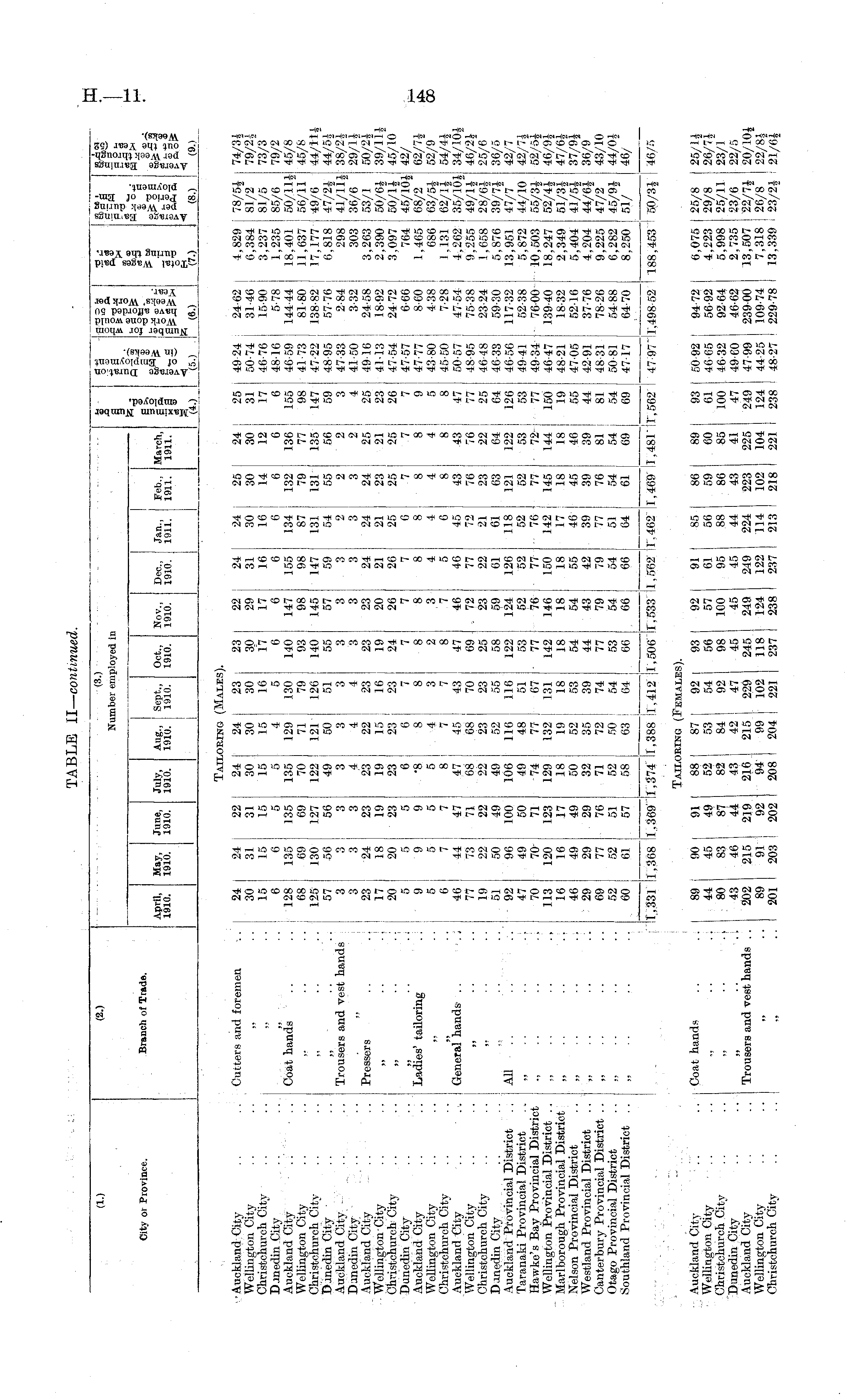 (1.) City oi Province. (2.) Branch of Trade. April, May, June, July, Aug., Sept., Oct., 1910. 1910. 1910. 1910. 1910. 1910. 1910. (30 Number employed in Bee, Jan., Feb.. March, 1910. 1911. 1911. 1911. 5 a 3 ee s fl -y c -a o c-h o a S73 -> £ rei eg O C3 ft SS fe fe s-a a 3~ . o-g o ASS 5gS&: •< tt ■3a a X •g-C ty) _a a 3 .SA, gftPHP, K,.a cm a ° t. arfl ai 00 or, cl Or t- & Or= Nov., 1910. (8.) (-0 Cutters and foremen -.. 24 30 ..15 Coat hands .. .. 128 ..68 .125 57 Trousers and vest hands 3 Pressers . . .; 23 ..17 .: 20 . i 5 Ladies' tailoring . T 9 ■ 5 .6 General hands . . • •. i 46 77 19 51 All . . .... 92 .; 47 .; 70 .,113 ■.: 16 46 29 69 52 60 Taii 'RING Male: ■)■ Auckland CityWellington City Christchurch City Danedin City ... Auckland City '.:'"' Wellington City Christchurch City Danedin City Auckland City Danedin City Auckland City Wellington-City Christchurch City Danedin City Auckland City Wellington City Christchurch City Auckland City Wellington City Christchurch City Danedin City Auckland Provincial District Taranaki Provincial District Hawke's Bay Provincial District Wellington Provincial District .. Marlborough Provincial District Nelson Provincial District Westland Provincial District Canterbury Provincial District . . Otago Provincial District Southland Provincial District . . 24 31 15 6 135 69 130 56 3 3 24 18 20 5 9 5 7 44 73 22 50 96 49 70 120 16 49 29 77 52 61 22 31 15 5 135 69 127 56 3 3 23 19 23 5 9 5 7 47 71 22 49 100 50 71 123 17 49 29 76 51 57 24 30 15 5 135 70 122 49 3 4 23 19 23 6 •8 5 8 47 68 22 49 106 49 74 129 18 50 32 71 52 58 24 30 15 4 129 71 121 50 3 4 22 15 23 6 8 4 7 45 68 23 52 116 48 77 132 19 52 35 72 50 63 23 30 16 5 130 79 126 51 3 4 23 16 23 7 8 3 7 43 70 23 55 116 51 67 131 18 53 39 74 54 04 23 30 17 6 140 93 140 55 3 3 23 19 24 7 8 2 8 47 69 25 58 122 53 77 142 18 54 44 77 53 66 22 29 17 6 147 98 145 57 3 3 23 20 26 7 8 3 7 46 . 72 23 59 124 52 76 146 18 54 43 79 54 66 24 31 16 6 155 98 147 59 3 3 24 21 26 7 8 4 5 46 77 22 61 126 52 77 150 18 55 42 79 54 66 24 30 16 6 134 87 131 54 2 3 24 21 25 6 8 4 6 45 72 21 61 118 52 76 142 17 46 39 77 51 64 25 30 14 6 132 79 131 55 2 3 24 23 25 7 8 4 8 43 76 23 63 121 52 77 145 18 45 39 76 54 61 24 25 30 31 12 17 6 6 136 155 77 98 135 147 56 59 2 3 2 4 25 25 21 23 25 26 7 7 8 9 4 5 8 8 43 47 76 77 22 25 64 64 122 126 53 53 72 77 144 150 18 19 46 55 39 44 81 81 54 54 69 69 4924 24-62 50-74 31-46 46-76 15-90 48-16 5-78 46-59 144-44 41-73 81-80 47-22 138-82 48-95 57-76 47-33 2-84 41-50 3-32 4916 24-58 41-13 18-92 47-54 24-72 47-57 6-66 47-77 8-60 43-80 4-38 45-50 7-28 50-57 47-54 48-95 75-38 46-48 23-24 46-33 59-30 46-56 117-32 49-41 52-38 49-34 7600 46-47 13940 48-21 18-32 47-05 52-16 42-91 37-76 4831 78-26 50-81 54-88 47-17 64-70 4,829 6,384 3,237 1,235 18,401 11,637 17,177 6,818 298 303 3,263 2,390 3,097 764 1,465 686 1,131 4,262 9,255 1,658 5,876 13,951 5,872 10,503 18,247 2,349 5,404 4,204 9,225 6,282 8.250 78/5* 81/2 81/5 85/6 50/11* 56/11 49/6 47/2* 41/11* 36/6 53/1 50/6* 50/1* 45/10* 68/2 63/5* 62/1* 35/10* 49/1* 28/6* 39/7* 47/7 44/10 55/3* 52/4* 51/3* 41/5* 44/6* 47/2 45/9* 51/ 74/3 1 79/2 J 73/3 79/2 45/8 45/8 44/1 H 44/5* 38/2* 29/1 j 50/2* 39/11* 45/10 42/ 62/7* 52/9 54/4* 34/10* 46/2* 25/6 36/5 42/7 42/7* 52/5* 46/9* 47/6* 37/9* 36/9 43/10 44/0* 46/ 1,331 1,331 1,368 1,369 "I ,374 il ,388 11,412" 1,506 I 1,533 1 ,562 1,462 1,469 1,481'] 1,562 50/3* 46/5 47-97" 1,49852 188,453 Auckland City ■ . . Wellington City Christchurch City Danedin City Auckland City Wellington City Christchurch City Coat hands .. .. j 89 ..44 ■ > : 80 89 44 80 43 202 89 201 90 45 83 46 215 91 203 91 49 87 44 219 92 202 Tailc 88 52 82 43 216 94 208 iring (! j 87 53 | 84 42 215 99 I 204 Femali 92 54 92 47 229 102 221 ;s). 93 56 98 45 245 118 237 92 57 100 45 249 124 238 91 61 95 45 249 122 237 85 56 88 44 224 114 213 86 59 86 43 223 102 218 89 60 85 41 225 104 221 93 61 100 47 249 124 238 50-92 46-65 46-32 49-60 47-99 44-25 48-27 94-72 56-92 92-64 46-62 239-00 109-74 229-78 6,075 4,223 5,998 2,735 13,507 7,318 13.339 25/8 29/8 25/11 23/6 22/7* 26/8 23/2* 25/1* 26/7* 23/1 22/5 20/ 10c 22/8* 21/61 ■. 1 43 Trousers and vest hands .. 202 art 89 .. ! 201