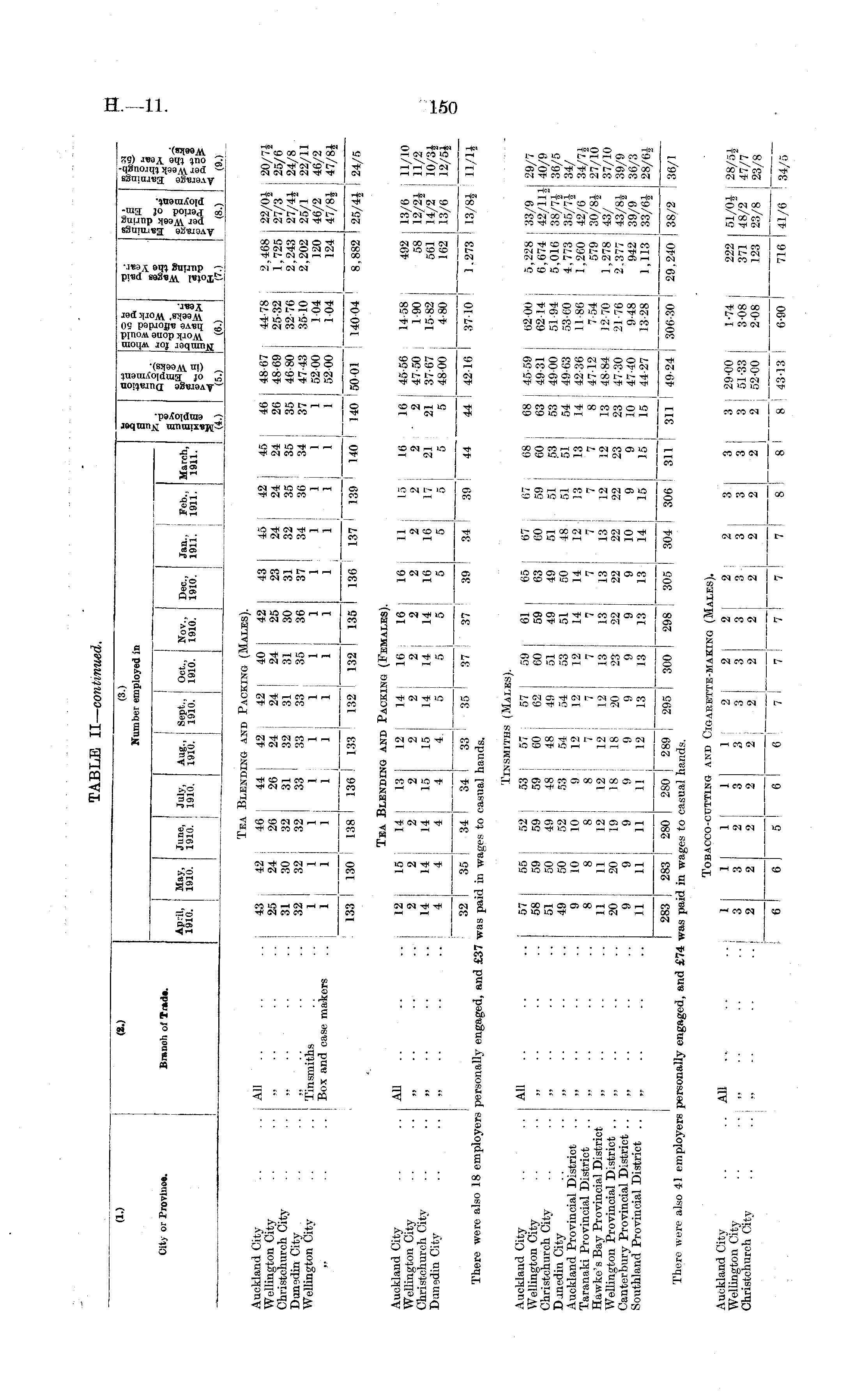 (1.) (2.) (3.) 1 S a o a .. CO a E 3Zrl •a ,• a a rr tr a a ?7.) £-r a a m tar- 3 F a - tr err f- co m3 (8.) i-,-acN a P tg- - f_ a m%x S g SJt» Number employed in City or Province, Branch of Trad*. — . April, May, June, | July, Aug., Sept., Oct., 1910. 1910. 1910. I 1910. 1910. 1910. 1910. Nov., Dec., Jan.. ! Feb., March, 1910. 1910. 1911. 1911. 1911. i r* « •§1 es spa (5.) (-■> Auckland City . . . . All .. .. 43 42 : 46 44 42 , 42 I 40 42 43 45 I 42 I 45 46 4867 ; 44-78 2 468 22/0* ■ 25 24 ; 26 26 24! 24; 24 25 23 24 24 24 26 48-69 j 25-32 1725 27/3 Chnstchurch City 31 30 32 31 32 31 31 30 31 32 35 35 35 4680 32-76 2 243 27/4* Danedin City , 32 32 32 33 33 33 35 36 37 34 36 34 37 4743 35-10 2 202 t/n Wellmgton City .. Tinsmiths .. 1 , 1 X 111 1 1 \ 1 1 1 1 %&\ I20 46/2 .. Box and case makers .. 1 1 1 | 1 1 1 I 1 111 1 1 5200 I 104 124 47/8* 42 24 30 32 1 1 Tea 46 26 32 32 1 1 Blending and Packing (Males). 44 42 42 I 40 42 26 24 24 [ 24 25 31 32 31 31 30 33 33 33 35 36 1 111 1 1 1 j 1 j 1 1 43 23 31 37 1 ' 1 45 I 24 I 32 i 34 : 1 1 j 42 I 24 35 I 36 1 1 45 24 35 34 1 1 46 26 35 37 1 1 48-67 48-69 46-80 47-43 5200 5200 44-71 25-3! 32-71 35-K 10 102.461 1,721 2,24! 2,20: 12( 12< 22/0* 27/3 27/4* 25/1 46/2 47/8* 20/7* 25/6 24/8 22/11 46/2 47/8* ; .—. 1. . 1 1 __, 1 1 :. ; _ 133 1 130 j 138 136! l33 | 132 | 132 I 135 I 136 137' 139 140 ! 140 15001 ! 140-04 ' 8,882 25/4* ! 24/5 Tea Blending and Packing (Females). Auckland City .. ..All 12 15 j 14 13 12 14 : 16 . 16 16 11 15 16 16:45-56 14-58 492 13/6 Wellington City .. .. „ 9 3 2 2 2 2 2; 2 2 2! 2 2 ■■ 2 47-50: 1-90 58 2/2* D™-dt U ct y 'I l t ] l t 15 a 15 a U U ! U 16 16 17 21 21 37 ' 67 : 15 '82 561 141 DanedmCity .. .. „ 4 4 4 4 4 5 5; 5 5 5 5 5 5 4800 4-80 162 13/6 32 35! 34' 34 33 35 37' 37 39 34 39' 44 44 4216 3710 1.273 13/8* there were also 18 employers personally engaged, and £37 was paid in wages to casual hands. ' 11/2 ' 10/3* I 12/5* 11/1* Tinsmiths (Males). Auckland City .. .. All 57 55 52 I 53 57 57 59 61 , 65 ; 67 : 67 : 68 68 45-59 I 0200 5 228 33/9 Wellington City 58 59 59 59 60 62 60 59 63 60 59 60 63 4931' 6214 6 674 42/111 Christchurch City , 51 50 49 48 48 49 51 49 49 51! 51 53 53 49 00: 5194 5 0 6 38/7' DtinedmCity . • • . -- ., 49 50 ; 52 53 54 54 53 51 50 48! 51 51 54 49-63 [ 53-60 4 773 35/7? Auckland Provincial District .. , 9 10 10 9 12 12 12 14 14 12 13 13 14 42-36 1186 in fJ,J Taranaki Provincial District .. , 8 8 8 g - - - 7 7 7 7 7 8 47 fl 7 S '*n% fJL Hawke's Bay Provincial District „ .. .. 11 11 12 12 12 12 13 13 13 13 12 12 ll 4884 i 12-70 1278 fy* Wellington Provincial District .. „ 20 20 19! 18 18 ! 20 23 22 22 22 22 23 23 47-30 2176 9vn Iq/si Canterbury Provincial District 9 9 9 9 9 9 9 9 9 10 9 9 W 4t!o 9-Is '942 39/9 1 Southland Provincial District .. , n ; U u 12 13 13 13 13 U 15 15 lg u .£ j*§| , jfg g^ 283 283 ! 280 28ft 980 9Qcc onn 00c qok ortA one on n,t 7TT. ZTTTZT TTTTTT - I TTrTTT~^~ 29/7 40/9 36/5 34/ 34/7* 27/10 37/10 39/9 36/3 28/6* I I ZS3 I z»3 ; ZSU I -ZesV \ 2«y ; 295 I 300 I 298 \ 305 ! 304 I 306 ! 311 | 311 | 4924 I 306-30 i 29 240 I 38/2 i lhere were also 41 employers personally engaged, and £74 was paid in wages to casual hands. 283 I 283 j 280 | 280 [ 289 | 295 | 300 I 298 ■as paid in wages to casual hands. 305 304 I 306 I 311 ! 311 ! 49-24 I 306-30 I 29.240 | 38/2 ! 36/1 Tobacco-cutting and Cigarette-making (Males). Auckland City .. . . All . . .. 1 1 1 1 12 9 9 9 9 q ■> a , on An . „., „„ r, ,«, Wellington City .. 3 3 2 3 3 3 ( t -> I I I I o : ri'll ''I 4 222 51/0 * : Christchurch riv " " " o n t . t\ 3 3 3 3 3 3 3 3 61 ' 33 3 ' 08 371 48/2 Christchurch City .. . I 2 J2j _!_| 2 2 2 2,52-00 2-08 123 23/8 6 6 56 6 I 7 I 7 7 7 I 7 8 8 ! 8 ! 43-13 6-90 716 41/6 ' Tobacco -cutting and Cigakette-making (M. 1 11 1 12 2 2 3 3 2 3 33 3 3 2 2 2 2 2; 2 2 2 i 6 6 6 ! 7 ! 7 7 LES). 2 3 2 ! 2 I 3 2 7 3 3 3 1 29-00 j 1-74 222 51/0* | 3 3 3 [ 51-33 3-08 371 48/2 2 2 2 ; 52-00 2-08 , 123 23/8 8 8 ! 8 j 43-13 6-90 716 41/6 I 28/5* 47/7 23/8 34/5
