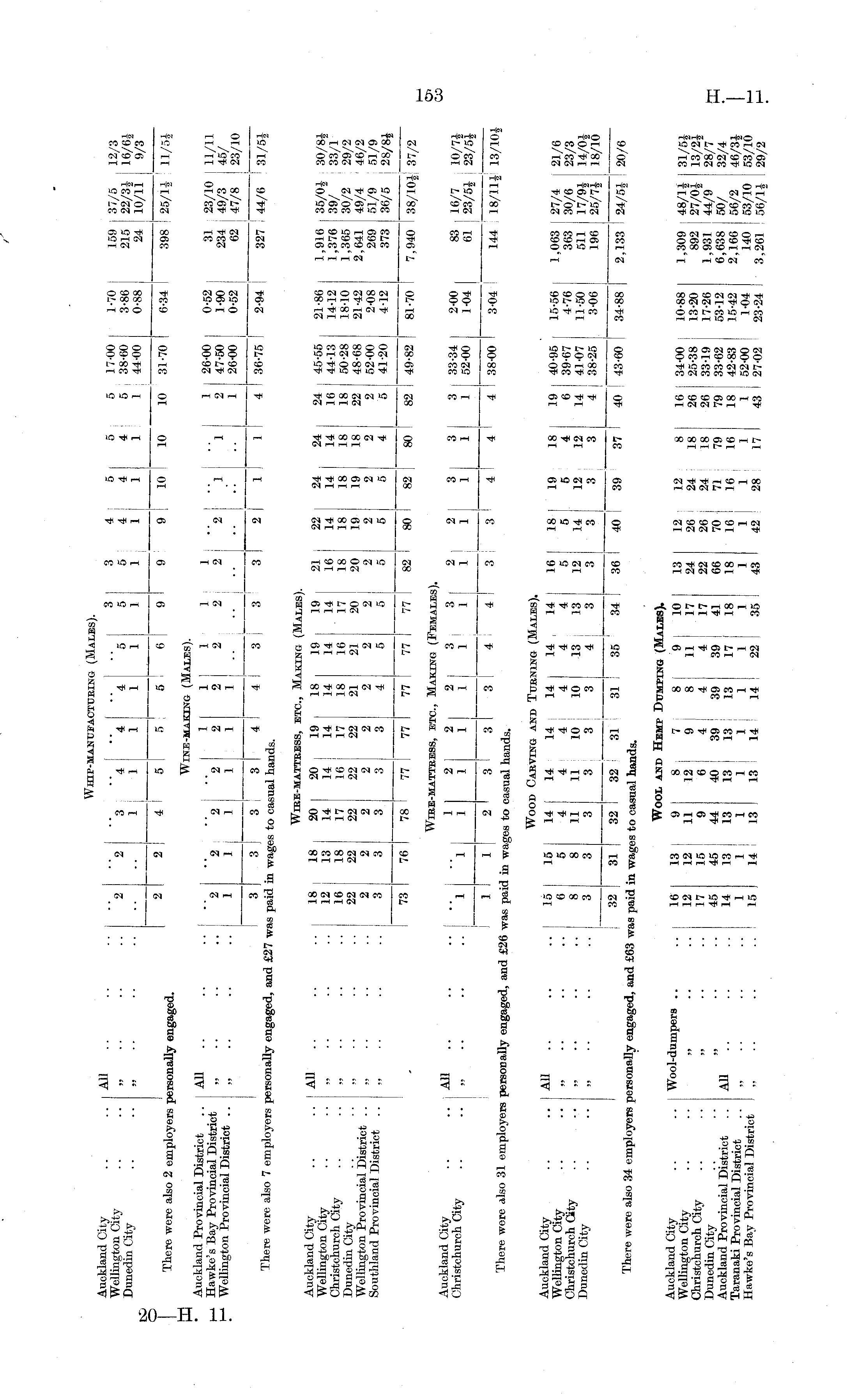 Whip-manueacttjking (Males). cttjking (Males). Auckland City .... All .. . , , o o a Wellington City " "o "o "•> " A " A ". 3 ? fi ° 5 ° llm l -7 0 159,37/5 12/3 DunedinCity V. \ ] "„ ?| 1 1 f , f f f f f ? 3 ' 86 I 215 22/3* | 16/6* J ..,,.. .. i i 1 i i i 1111 1 44-00 0-88 ! 24 10/11 I 9/3 There were also 2 employers personally engaged. 2 * * '' * "' ' * 6 9 9 » ! "> 10 10 31-70 ellt 398 | 25/1* | 11/5* 3 4 5 5 1 1 1 5 6 9 3 4:5 5 5 17-00 5 4 ! 4 4:5 38-60 1 1 | 1 1 1 44-00 9 9 j 10 10 10 31-70 1-70 3-86 0-88 j 6-34 159 I 37/5 12/3 215 22/3* | 16/6* 24 10/11 j 9/3 398 I 25/1* 11/5* Wine-making (Males). Auckland Provincial District .. All .. .. .. 1 1 i l l i aa ™ * ™ Hawke's Bay Provincial District 2 "2 I "2 "2 2 2 2 2 9 "9 "1 "1 I ' ?'S 31 23/10 11/11 Wellington Provincial District .. .. .. 1 111 \ 7 2 2 * - 1 * ? 4 J1» 234,49/3 45/ ___ _J_ 11 •• 1 •• 1 26-00! 0-52 j 62 ; 47/8 23/10 -n. , „ „ , 3 3 J 3 , 3 4 4 3 ! 3 3 2 ! 1 1 4 36-75 I 2-94 | 327 ! there were also 7 employers personally engaged, and £27 was paid in wages to casual hands. ung (Males). 1 1 1 2 2 2 1 1 .. i .. .. ! 1 26-00 I 2 2 j 1 1 2 47-50 I 1 26-00 0-52 1-90 0-52 31 23/10 11/11 234 : 49/3 45/ 62 ! 47/8 23/10 36-75 2-94 327 44/6 31/5* WlEE-MATTBESS, ETC., MaiUNG (MALES). '• •• AU Hi \l T A 2 °, ]l j! J 9 " 2 l 22 24 24 24 21-86 1,916 35/0* 30/8* ciristcCchcL :: :: ;; \l 1 }$ 4 4 4 4 4 }« 4 > 4 * 4 j« 1,376 39 / 33/1 2 DunedinCity .. .. 22 22 22 22 22 91 90 90 o a J! lo ?2' 28 18 ' 10 1 ' 365 30 / 2 29 / 2 Wellington Provincial District .. " "22222 2 2 2 2 9 9 9 2 9 soon 2 i' 42 2 ' 641 49/4 46 / 2 Southland Provincial District .... " 3 3 3 3 ? ! 1 k « * \ ! 2 * 2 ™ 2 ' 08 269 51 / 9 5 V9 •• 6 _ 6 \ 4 5 5 5 5 4 5 41-20 4-12 373 36/5 ,28/8* 73 76 78 77 I 77 77 77 77 82 80 82 80 82 4!>82 38/10*~37/2 24 16 18 22 2 5 45-55 44-13 50-28 48-68 52-00 41-20 21-86 14-12 18-10 21-42 2-08 4-12 1,916 1,376 1,365 2,641 269 373 35/0* 39/ 30/2 49/4 51/9 36/5 30/8* 33/1 29/2 46/2 51/9 28/8* I 49-82 j 81-70 7,940 I 38/10* 37/2 Wibe-matteess, etc., Making (Females). Auckland City .. . All I 19 oo, •> -> a <. .-. .-. Christchurch City .. „ I "l "l 1 1 1 , ?t ? fl ? '? ? ?i 33 " 34 2 ' 00 I 83 ' 16 / 7 W7* ' " j _ J _J_ _J_\ _1_ _J_| 1| 1 1 1 j 52-00 1-04 j 61 ! 23/5* 23/5* 1 12333!443:3'444! 38-00 3-04 ! 144 18/11*1 13/104 there were also 31 employers personally engaged, and £26 was paid in wages to casual hands. 33-34 i 52-00 2-00 1-04 83 16/7 10/7* 61 j 23/5* | 23/5* Wood Cabving and Ttjbning (Males). :: :: AU :: " - 1 l i x t l t x \\ l \ l t 'i 1 x t 19 , x ! 19 40 ' 95 ' 15 - 56 i.<h»i»/< »/e Christchurch (lty .. . . "" 8 8 11 U W 10 it it li if 19 io .? f,11 4 " 76 363 30/6 23/3 DunedinCity .. .. f 3 3 3 l\ % A \ t l t l \ J f f 1 ' 07 U ' 50 5U l 7 / 9 i l ±M y ' _f_ f Ji\ 3 3 3 3 4 1 38-25 3-06 196 25/7* 18/10 32 31 32 32 ! 31 31 I 35 34 36 lo~| li io~| 43-60 JJs8 2,133 24/5* 20/6 mere were also 34 employers personally engaged, and £63 was paid in wages to casual hands. Wool and Hemp Dumping (Males). Sa".!, - ;; Wool-dumpe... .. 16 13 9 8| 7 1 8 J 10 13 12,12 8 16 ; 34-00 ; 10-88 1,309:48/1*31/5* Christchurch City .. " 17 15 9 6 i ! ! 1 }? 09 f« of !. 26 : 25-38 | 13-20 892 | 27/0* 13/2* DunedinCity * .. " '' « i! , ! * , 33 ' 19 17 ' 26 1,931 44/ 9 2 28/7^ Auckland Provincial District .. All ' . " " H fs U S W fs ?? fs fs M ?J !fi 72 I 2?« £"12 6,638 50/ 32/4 Taranaki Provincial District .. „ . 1111 l i ,| f ? ? X f J f ' f!' 83 ; 15 ' 42 2,166 56/2 46/3* Hawke's Bay Provincial District „ .. .. !! 15 14 13 13 ill 14 22 ! 35 43 42 28 17 43 I I S,lfl \ ggj 8£°