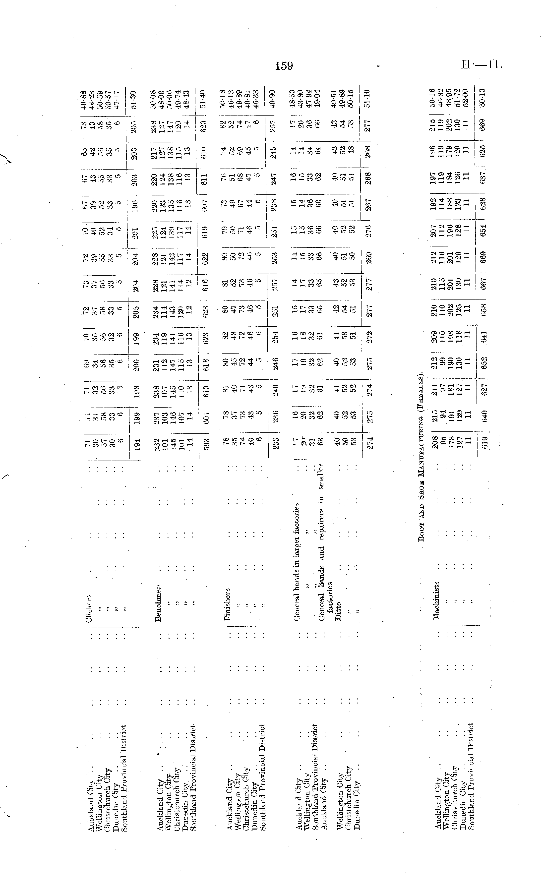 Auckland City Wellington City Christchurch City Dunedin City Southland Provincial District .. Clickers 71 71 I 71 69 70 72 73 72] 70 I 67 67 65 73 j 49-88 30 31 32 34 35 37 37 39 : 40 I 39 l 43 42 43 44-23 .. j 57 58 56 56 56 58 56 55 ; 52 I 52 ; 55 56 08 o0-o9 '• 30 33! 33 1 35 32 33 33 33 1 34 33' 33 35 35 o0-57 ;; " . . 6 6 j 6 6 6 5 5 j 5 5 . 5 5 5 61 47-17 I 194 199! 198 200 199 205 204 ' 204! 201' 196 203 ' 203 205 51-30 Auckland City . . Wellington City Christchurch City Dunedin City Southland Provincial District .. Benchmen 232 237 238 231 234, 234 228; 228 225 220 1 220: 217 238 I 50-08 101 103 107 112 119 I 114 121 I 121 I 124 j 123 124 | 127 ; 12- , 48-09 ' i 145 146 145 147 141- 143 141: 142 139 135 138' 138 147 5006 101 107 UO 115 116' 120 114 I 117 117 116 116; 115 120; 49-74 ;; ;; ;_ .. ■ 14 u 13 13 13 12 12 14 u 13 13 13 14 48-43 593 607 : 613 618 623 623 616 '< 622 619 607 I 611 ' 610-1 623 I 51-40 Auckland City Wellington City ..■ Christchurch City Dunedin City Southland Provmcial District .. Finishers ; 78 | 78 I 81 80 I 82 80 l 81 | 80 79 73 ! 76 ] 74 82 I 50-18 35 i 37 40 45 I 48 47 52 ' 50 50 49 51 52 o2 ; 4613 74 73 ! 71 72 72 73 I 73 72 71 ! 67 68 69 , 74 ; 49-89 40 43 43 44 46 46 | 46 46 46 44 47 45 47 49-81 " ',] .. 6 515 5.615 5 5 5 5 5 5 6 40-33 '233 236 i 240 I 246 254 I 251 257 I 253 I 251 ! 238 ! 247 245 ' 257 ! 49-90 Auckland City Wellington City Southland Provincial District Auckland City Wellington City Christchurch City Dunedin City .. 1 General hands in larger factories .. I 17 16 1 17 17; 16 I 15 14 14 15 15 16 1 14 17 48-53 20 20 19 19 1 18 ! 17 17 15 15 14 15 ' 14 20 , 43-80 31 32 32 32 1 32 ' 33 33 33 36 36 33 I 34 36 47-94 '.'. General hands and repairers in smaller 63 1 62 61 62 61 65 65 j 66 66 60 62 j 64 66 49-04 DiSo* 01168 . 40 40 41 40 ! 41 ! 42 43 40 40 40 I 40 42 43 [ 49-51 50 : 52 ! 52 52 i 53 54 52 51 52 51 ! 51 52 54 49-89 ;'. " '.. .. 53 ; 53 j 52 53 S 51 51 53 | 50 52 51 51 48 53 50-15 _ 274 ! 275 ' 274 275 I 272 277 277 ' 269 276 ' 267 ' 268 268 277 51-10 Boot and Shoe Manufacturing (Females). Auckland City Wellington City Christchurch City Dunedin City Southland Provincial District Machinists .. .. | 208 215 211! 212 209 210 j 210; 212; 207 192 197; 196; 215 50-16 Machinists .. 95 94 97 99 110 110 115 116 112; 114 119! 119 119 46-82 " ; 178 191 181 190 ' 193 202 201 , 201 196 i 188 184 \ 179 | 202 48-95 127 129 127 ! 130 j 11.8 125 130 1.29 128 I 123 126 120 I 130 51-72 ;; ;; ;; " . " n n n In ' ii ii ii ii ii 1 ii u ii ! n 52 ' 00 I 619 ! 640 627 ! 652 ' 641 658 667 669 654 ' 628 I 637 625 669 50-13