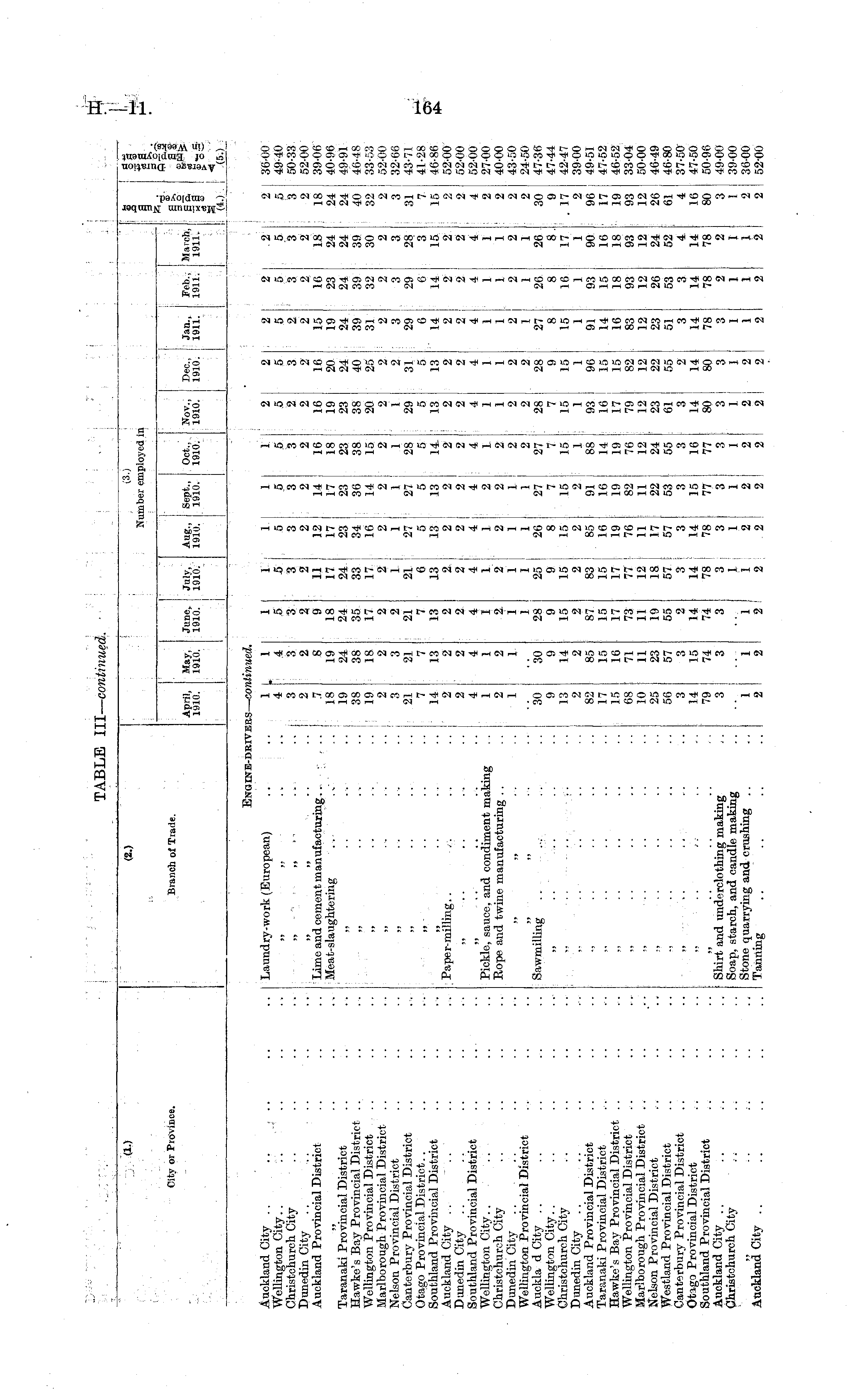 (1.) (2.) {30 Number employed in 1 s .11 City or Province. Branch of Trade. April, May, June, July, 1910. 1910. 1910. 1910. Aug., Sept., Oct., 1910. 1910. 1910. Nov., Dec, ' Jan., Feb., March, 1910. 1910. 1911. 1911. 1911. eZ a 3 e g. ■sa a (40 . a s Engine-driv: ts— -com Uinued. Auckland City .. .. , .. Wellington City.. .. Christchurch City Dunedin City .. .. ... Auckland Provincial District Laundry-work (European) l L 4 3 2 7 18 19 38 19 2 3 21 7 . 14 2 2 4 1 2 1 L 1 4 3 2 8 19 24 38 18 2 3 21 13 2 2 4 1 2 1 1 5 3 2 9 18 24 35 17 2 2 21 13 2 2 4 2 1 1 28 9 15 2 87 15 17 73 11 19 55 2 14 74 3 1 3 2 11 17 i 24. 33 17 2 21 6 13 2 2 4 1 2 ' 1 1 25 15 | 2 [ 83 15 17 1 77 12 18 57 3 14 78 | 3 1 1 2 1 5 3 2 12 17 23 34 16 2 1 27 5 13 2 2 4 1 2 1 1 26 8 15 2 85 16 19 76 11 17 57 3 14 78 3 1 2 2 1 5 3 2 14 17 23 36 14 2 1 27 5 13 2 2 4 : 2 2 1 1 27 15 2 91 16 19 82 11 22 53 3 15 77 3 1 2 2 1 5 3 2 16 18 23 38 15 2 1 28 5 14 2 2 4 1 2 2 2 27 15 1 88 14 19 76 12 24 55 3 16 77 3 1 2 2 2 5 2 2 16 19 23 38 20 2 1 29 5 13 2 2 4 1 1 2 2 28 15 93 16 17 79 12 23 61 3 14 80 3 1 2 2 2 5 3 2 16 20 24 40 25 2 2 31 13 2 2 4 1 1 2 2 28 15 96 15 15 82 12 22 55 2 14 80 3 1 2 2 2 5 2 2 15 19 24 39 31 2 3 29 6 14 2 2 4 1 1 2 1 27 8 1.5 1 91 14 16 83 12 23 51 3 14 78 3 1 1 2 2 5 3 2 16 23 24 39 32 2 3 29 6 14 2 2 4 1 1 2 1 26 8 16 93 15 18 93 12 26 53 3 14 78 2 1 1 2 .2 5 3 2 18 24 24 39 30 2 3 28 15 2 2 4 1 1 2 1 26 8. 17 1 90 16 18 93 12 24 52 4 14 78 2 1 1 2 2 5 3 2 18 24 24 40 32 2 3 31 15 2 2 4 2 2 2 2 30 9 . 17 2 96 17 19 93 12 26 61 4 16 80 3 1 2 2 36-00 49-40 50-33 52-00 39-06 40-96 49-91 46-48 33-53 52-00 32-66 43-71 41-28 46-86 52-00 52-00 52-00 27-00 40-00 43-50 24-50 47-36 47-44 42-47 39-00 49-51 47-52 46-52 3304 50-00 46-49 46-80 37-50 47-50 50-96 49-00 39-00 36-00 52-00 Lime and cement manufacturing.., - • Meat-slaughtering .. Taranaki Provincial District Hawke's Ba.y Provincial District .. Wellington Provincial District . .. Marlborough Provmcial District .. Nelson Provmcial District Canterbury Provincial District Otago Provincial District Southland Provincial District Auckland City . . Dunedin City Southland Provincial District Wellington City Christchurch City Dunedin City Wellington Provincial District Auckla d City .. .. Wellington City Christchurch City Dunedin City Auckland Provincial District Taranaki Provmcial District Hawke's Bay Provincial District .. Wellington Provincial District Marlborough Provmcial District .. Nelson Provincial District Westland Provincial District Canterbury Provincial District Otago Provincial District Southland Provincial District Auckland City Christchurch City Paper-milling.. ... Pickle, sauce, and condiment making Rope and twine manufacturing Sawmilling .. ... . . 30 9 13 2 82 17 15 68 10 25 56 3 14 79 3 30 9 14 2 85 15 16 71 11 23 57 3 15 74 3 I Shirt and underclothing making Soap, starch, and candle making Stone quarrying and crushing Tannmg .. .. 1 2 1 2 1 2 Auckland City ..