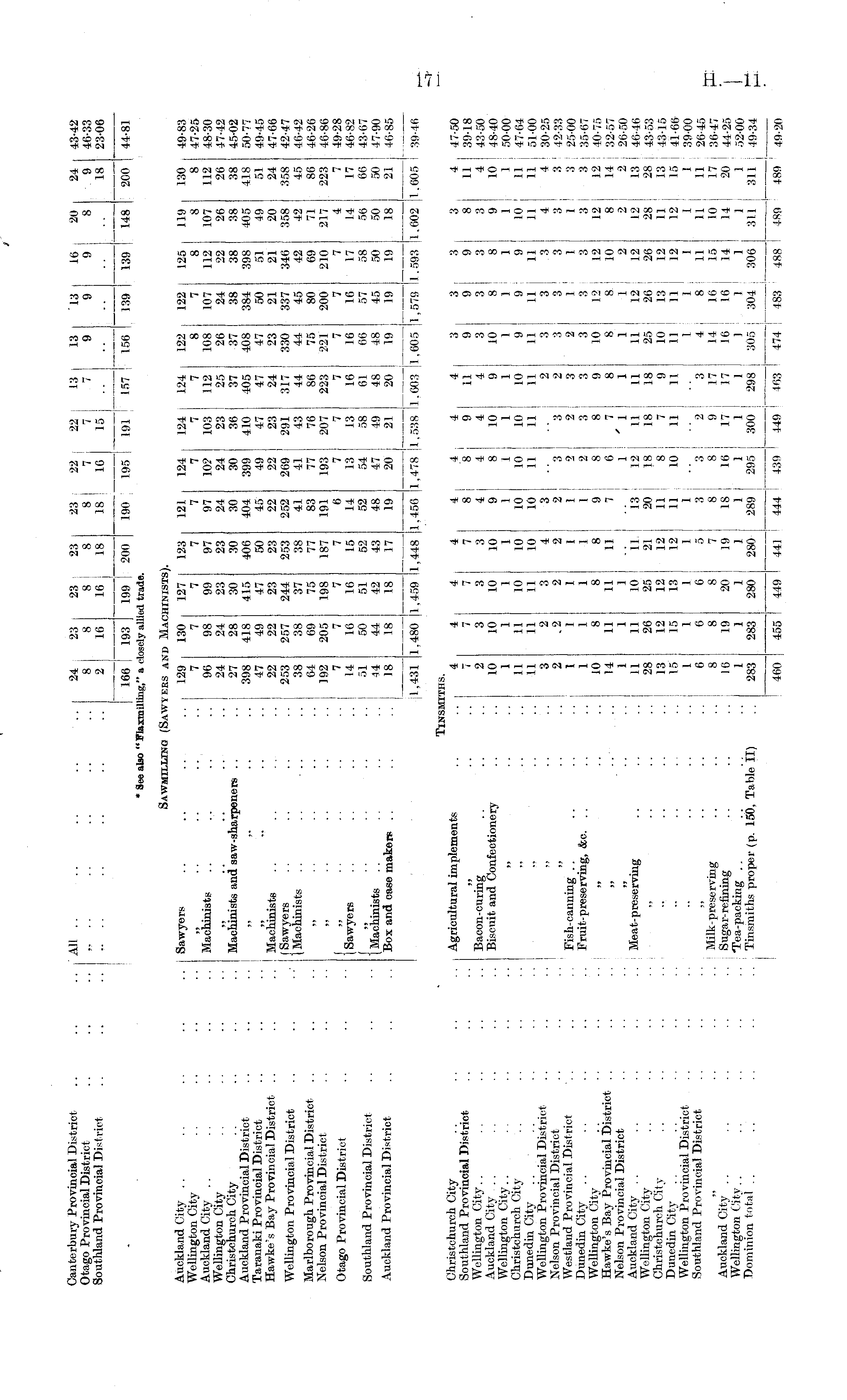 Canterbury Provincial District Otago Provincial District Southland Provincial District .. All . . .. .. .. .. 24 .. .. 8 .. .. .. .. 2 166 * See also " Flaxmilling," a clr. 23 16 193 losely allit 23 23 23 22 j 22 j 13 8 8 8 j 7 7 ! 7 16 18 18 I 16 15 ] 199 200 190 ! 195 191 ' 157 ed trade. 23 8 I 18 ! 22 10 195 22 15 | 191 ! 13 7 13 9 156 13 9 139 16, 9 ! 20 8 148 24 9 18 200 43-42 46-33 2306 190 JUL 157 | 139 44-81 Sawmilling (Sawyers an jd Mac] HINISTS). Auckland City Wellington City Auckland City Wellington City Christchurch City Auckland Provincial District Taranaki Provincial District Hawke's Bay Provincial District .. Wellington Provincial District Marlborough Provincial District Nelson Provincial District Otago Provincial District Southland Provincial District Auckland Provincial District Sawyers .. .. .. . . 129 7 Machinists .. .. .. ' .. 96 24 Machinists and saw-sharpeners .. .. 27 398 ..47 .. Machinists .. .. 22 (Sawyers .. .. .. .. 253 \ Machinists .. .. ... .. 38 64 ..192 | » 7 (Sawyers . . .. .. .. 14 „ . . .. .. . . 51 | Machinists .. .. .. . . 44 Box and case makers .. .. 18 ;l,431 ! 130 7 98 24 28 418 49 22 257 38 69 205 7 16 50 44 18 127 123 121 124 124 j 124 7 7 7 7 7 | 7 99 97 97 102 103 | 112 23 23 24 24 23 25 30 30 30 30 36 37 415 406 404 399 410 405 47 50 45 49 47 47 23 23 22 22 23 24 244 253 252 269 291 317 37 38 41 41 43 44 75 77 83 77 76 86 198 187 191 193 207 223 7 7 6 7 7 7 16 15 14 13 13 16 51 52 52 54 58 61 42 43 48 47 49 48 18 17 19 20 21 20 122 122 125 8 7 8 108 107 112 26 24 22 37 38 38 4.08 384 398 47 50 51 23 21 21 330 337 346 44 45 42 75 80 69 221 200 210 7 7 7 16 16 17 66 57 58 48 45 50 19 19 19 119 130 49-83 8 8 47-25 107 112 48-30 26 26 47-42 38 38 45-02 405 418 50-77 49 51 49-45 20 24 47-66 358 358 42-47 42 45 46-42 71 86 46-26 217 223 46-86 4 7 49-28 14 17 46-82 56 66 43-67 50 .50 47-90 18 21 46-85 |l,480 j |l,459 |l,448 |l,456 |l,478 |l,538 ll,603 |l,605 j 1,579 11 .593 jl,602 11.605 ! 39-46 Tinsmiths. 4 7 3 10 11 11 .2 1 1 8 11 1 11 26 12 15 1 6 8 19 283 3 3 3 9 9 9 | 3 3 3 j 10 8 8 ! 1 1 1 9 9 9 11 11 11 3 3 .3 3 3 3 2 11 3 3 3 10 12 12 8 8 ! 10 1 12 11 12 ; 12 25 26 26 10 13 12 11 11 12 1 1 1 4 8 11 14 16 15 16 16 14 1 1 1 305 ! 304 : 306 I 3 , 4 47-50 8 11 39-18 3 4 43-50 9 10 48-40 1 1 5000 10 11 47-64 11 11 ; 51-00 4 4 ! 30-25 3 3 42-33 1 3 25-00 3 1 3 35-67 12 12 40-75 8 14 32-57 2 2 26-50 12 13 46-46 28 | 28 43-53 11 | 13 43-15 12 | 15 41-66 I ; 1 39-00 11 ! 11 26-45 10 | 17 I 36-47 14 | 20 44-25 1 1 52-00 311 ! 311 49-34 1 489 489 I 49-20 Christchurch City Southland Provincial District Wellington City Auckland City Wellington City Christchurch City Dunedin City Wellington Provincial District Nelson Provincial District Westland Provincial District Dunedin City Wellington City Hawke's Bay Provincial District . . Nelson Provincial District Auckland City Wellington City Christchurch City Dunedin City Wellington Provincial District Southland Provincial District Auckland City Wellington City Dominion total .. Agricultural implements .. .. 4 tt . . . . 7 Bacon-curing .. .. . . 2 Biscuit and Confectionery .. . . 10 .... 1 ..11 11 .... 3 .... 2 Fish-canning .. .. .. 1 Fruit-preserving, &c. .. .. .. 1 .. | „ .. 10 ..14 .. 1 Meat-preserving .. .. . 11 ..28 ..13 .15 1 6 Milk-preserving .. .. . . 8 Sugar-refining .. .. 16 Tea-packing .. .. .. .. 1 Tinsmiths proper (p. 150, Table II) . . 283 460 4 4 4 4.4 4 7 7 8 8 9 11 3 3 4 4 4 4 10 10 9 8 10 9 1 1 1 1 11 10 10 10 10 10 I 10 11 10 10 11 11 i 11 3 4 3.... 2 2 2 2 3 3 12 1 11 2 2 ! 3 1 1 1 2 3 3 8 8 9 8 8 9 11 11 7 6 7 8 1 .. .. 1 ' 1 1 10 11 13 12 11 I 11 25 21 20 18 18 ! 18 12 12 11 8 7 | 9 13 12 11 10 ! 11 1! 1 1 I 6 5 3 3 2 ! 3 8 7 8 8 9 17 20 19 18 16 17 ' 17 1 1 I 1 1 | 1 280 280 289 295 300 ] 298 449 441 444 439 449 ! 463 455 474 483 ; 488