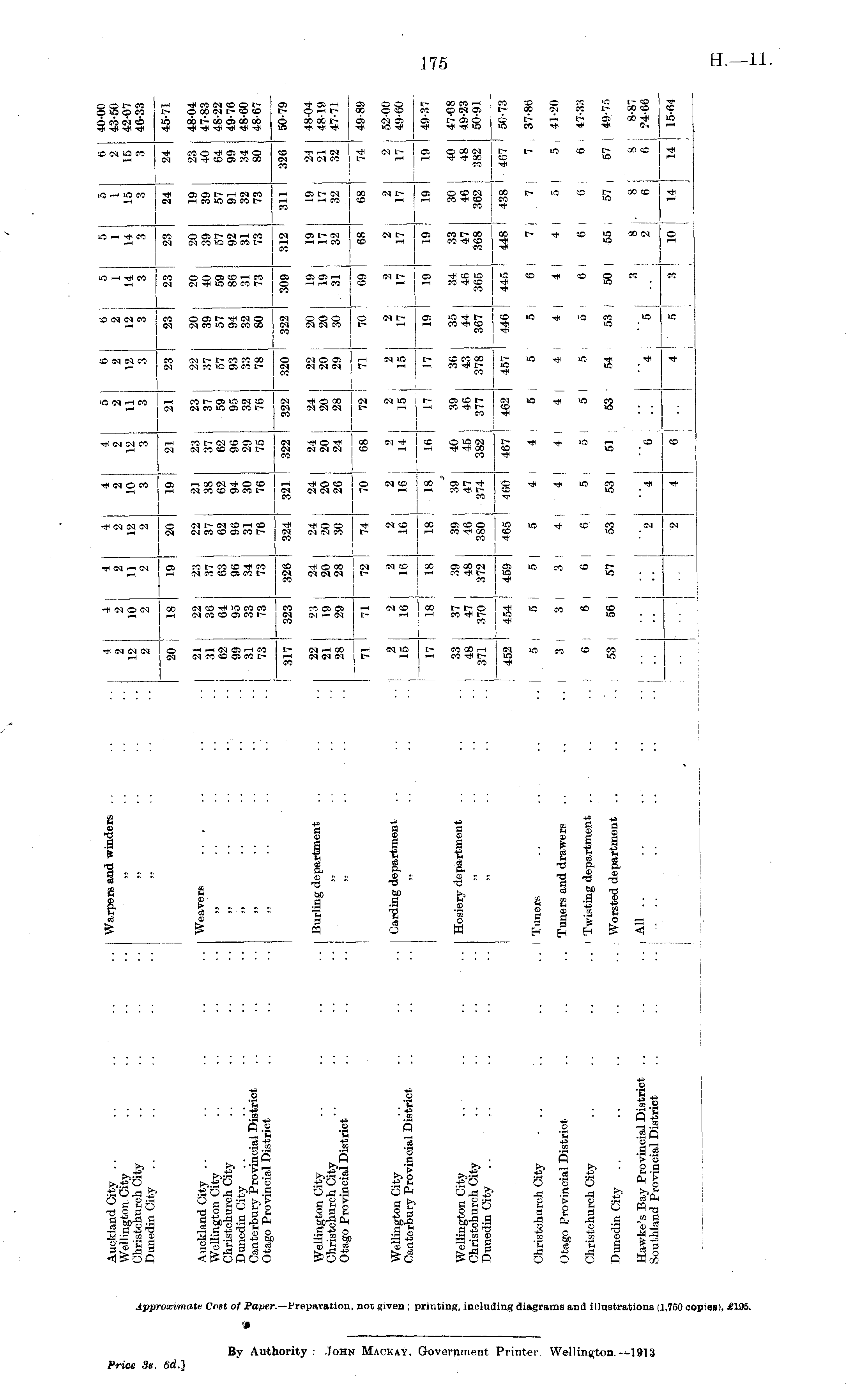 Auckland City Wellington City Christchureh City Dunedin City Warpers and winders .. » 4 i 4 4 4 4 4 0 6 0 i 5 5 5 61 40-00 22 2 2 2 2 2 2 2 1 1 I 2 43-50 12 10 11 12 10 12 11 12 12 14 14 15 15 42-07 ;;*22223333333 33 46-33 20 18 19 20~ — 19 21 21 23 23 23 23 24 24 45-71 Auckland City Wellington City Christchurch City Dunedin City Canterbury Provincial District Otago Provincial District Weavers y> 21 22 23 22 21 23 23 22 | 20 20 20 19 23 48-04 31 36 37 37 38 37 37 37 39 40 39 39 40 47-83 62 64 63 62 62 62 59 57 57 59 57 57 64 48-22 99 95 96 96 94 96 95 93 94 86 92 91 99 49-76 31 33 34 31 30 29 32 33 32 31 31 32 34 48-60 ;; 73 73 73 76 76 75 76 78 80 73 73 73 80 48-67 ~3lT~ 323" 326 324 321 322 322 320 322 309 312 311 326 50-79 Wellington City Christehurch City Otago Provincial District Burling department >> 22 1 23 24 1 24 24 24 24 ; 22 i 20 19 19 19 24 48-04 21 19 20 20 20 20 20 20 20 19 17 17 21 4819 ;; 28 29 28 30 26 24 28 29 30 31 32 32 32 47-71 71 71 72~ 74 70 68 72 71 70 69 68 68 74 49-89 Wellington City Canterbury Provincial District Wellington City .. - Christchurch City Dunedin City Carding department Hosiery department 2 2 2 2 2 , 2 , 2 2 2 2 2 I 2 2 5200 ;; 15 16 16 16 16 14 15 15 17 17 17 | 17 17 49-60 i 17 18 18 liT 18 16 17 17 19 19 19 19 19 49-37 33 1 37 39 39 I 39 40 39 36 35 34 33 30 | 40 4708 48 47 48 46 47 45 46 43 44 46 47 46 48 49-23 " 371 370 372 380 374 382 377 378 367 365 368 362 382 50-91 ~452 454" 459 465 460 467 462 | 457 446 445 448 438 467 50-73 Christchurch City ■ .. .. j Tuners I 5 1 5 I 5 I 5 4, 4: 5| 5' 5 I 61 7 | 7) 7, 37-86 Otago Provincial District .. Tuners and drawers ..j 31 3 I 3 J 4 I 4 I 41 4 I 4 | 4 | 4| 4 | 5 | 5 , 41-20 Christchurch City .. I Twisting department .. I 6| 61 6 I 61 5 I 51 5 ! 5 I 5 6 | 6 6 | 6 47-33 Dunedin City .. j Worsted department 53 ! 56 57 : 53 i 53 | 51 53 ■ 54 53 | SO | 55 , 57 j 57 | 49-75 Hawke's Bay Provincial District .. Southland Provincial District .. All .. ■ 3 8 .. 8 8 I 8-87 ;; ;; ;; ;; "2 "4 "6 !! I "4 j '5 .. 2 6 6 j ?4-66 - - — j j g 1 3 ! 10 J 14 14 15.64