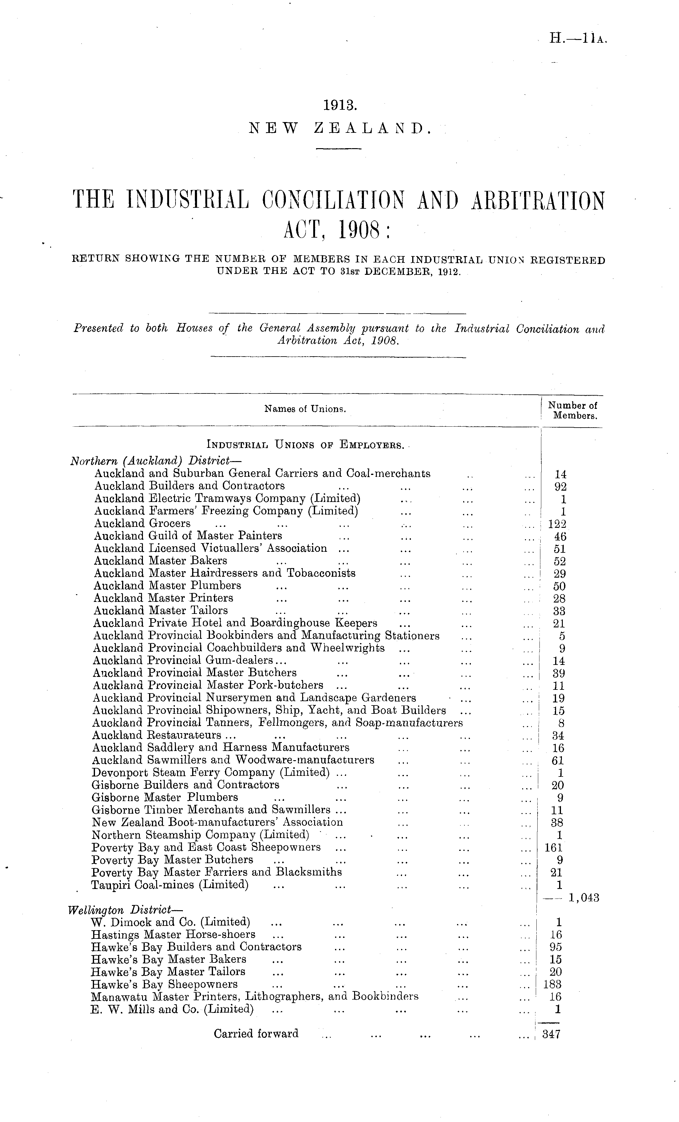 THE INDUSTRIAL CONCILIATION AND ARBITRATION ACT, 1908: RETURN SHOWING THE NUMBER OF MEMBERS IN EACH INDUSTRIAL UNION REGISTERED UNDER THE ACT TO 31st DECEMBER, 1912.
