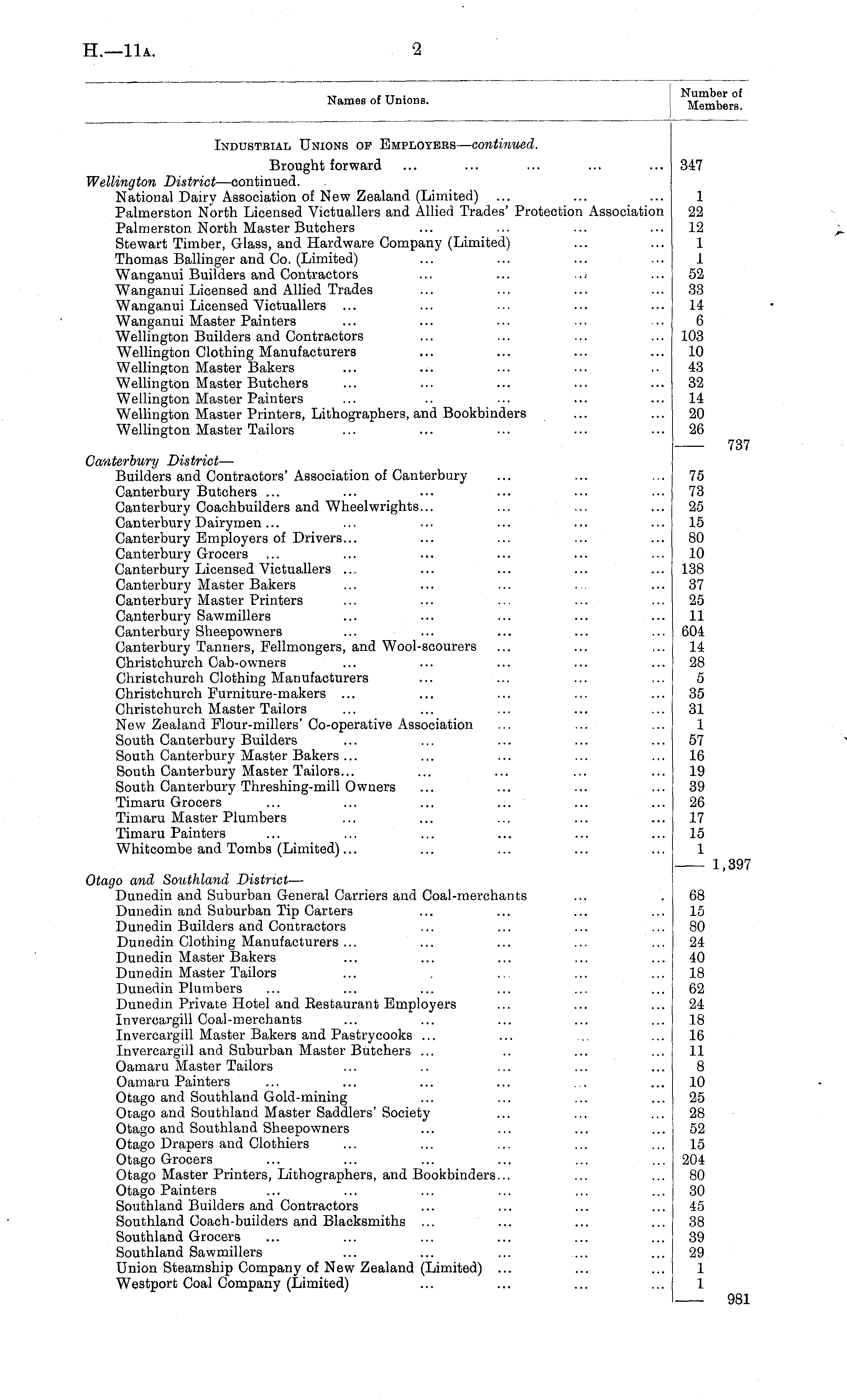 Names of Unions. dumber of Members. Industrial Unions op Employees— continued. Brought forward Vellington District —continued. National Dairy Association of New Zealand (Limited) ... Palmerston North Licensed Victuallers and Allied Trades' Protection Association Palmerston North Master Butchers Stewart Timber, Glass, and Hardware Company (Limited) Thomas Ballinger and Co. (Limited) Wanganui Builders and Contractors Wanganui Licensed and Allied Trades Wanganui Licensed Victuallers ... Wanganui Master Painters Wellington Builders and Contractors Wellington Clothing Manufacturers Wellington Master Bakers Wellington Master Butchers Wellington Master Painters Wellington Master Printers, Lithographers, and Bookbinders Wellington Master Tailors 347 1 22 12 1 1 52 33 14 6 103 10 43 32 14 20 26 rCanterbury District — Builders and Contractors' Association of Canterbury Canterbury Butchers ... Canterbury Coachbuilders and Wheelwrights... Canterbury Dairymen ... Canterbury Employers of Drivers... Canterbury Grocers Canterbury Licensed Victuallers Canterbury Master Bakers Canterbury Master Printers Canterbury Sawmillers Canterbury Sheepowners Canterbury Tanners, Fellmongers, and Wool-scourers Christchurch Cab-owners Christchurch Clothing Manufacturers ... ... Christchurch Furniture-makers Christehurch Master Tailors New Zealand Flour-millers' Co-operative Association South Canterbury Builders South Canterbury Master Bakers ... South Canterbury Master Tailors... South Canterbury Threshing-mill Owners Timaru Grocers Timaru Master Plumbers Timaru Painters Whitcombe and Tombs (Limited)... 737 75 73 25 15 80 10 138 37 25 11 604 14 28 5 35 31 1 57 16 19 39 26 17 15 1 Hago and Southland District — Dunedin and Suburban General Carriers and Coal-merchants Dunedin and Suburban Tip Carters Dunedin Builders and Contractors Dunedin Clothing Manufacturers ... Dunedin Master Bakers Dunedin Master Tailors Dunedin Plumbers Dunedin Private Hotel and Restaurant Employers Invercargill Coal-merchants Invercargill Master Bakers and Pastrycooks ... Invercargill and Suburban Master Butchers ... Oamaru Master Tailors Oamaru Painters Otago and Southland Gold-mining Otago and Southland Master Saddlers' Society Otago and Southland Sheepowners Otago Drapers and Clothiers ... ... ... ... Otago Grocers Otago Master Printers, Lithographers, and Bookbinders... Otago Painters Southland Builders and Contractors Southland Coach-builders and Blacksmiths ... Southland Grocers Southland Sawmillers Union Steamship Company of New Zealand (Limited) ... Westport Coal Company (Limited) 1,397 68 15 80 24 40 18 62 24 18 16 11 8 10 25 28 52 15 204 80 30 45 38 39 29 1 1 981
