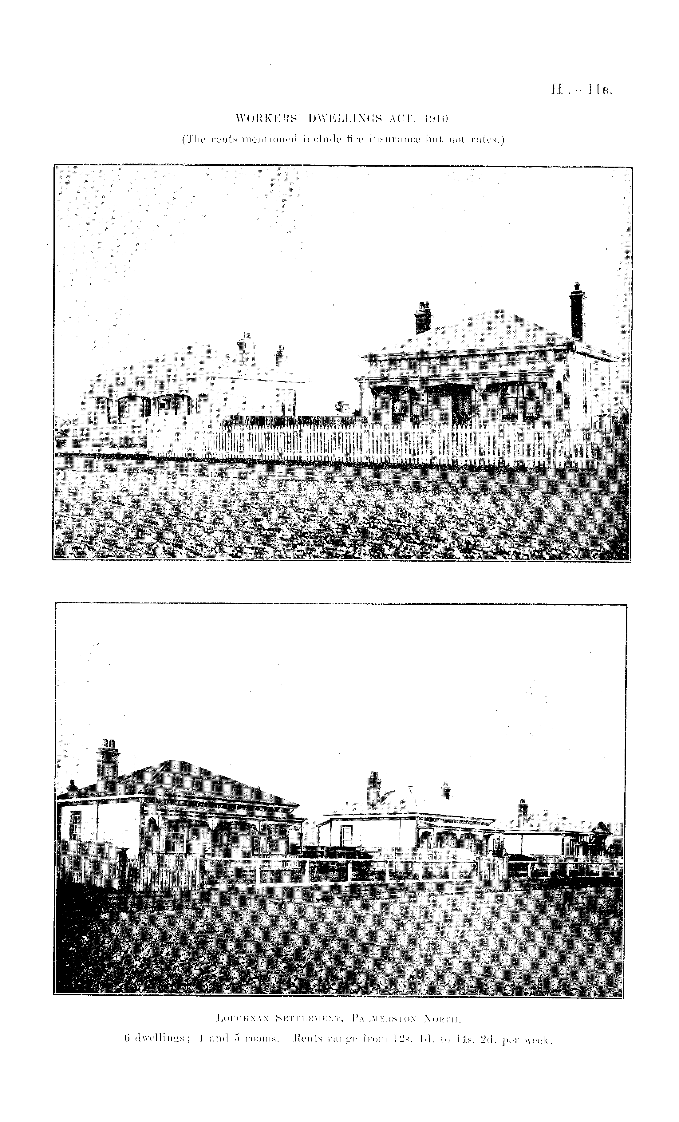 Loughnan Settlement, Palmerston North. 6 dwellings; 4 and 5 rooms. Rents range from 12s. 1d. to 14s. 2d. per week.