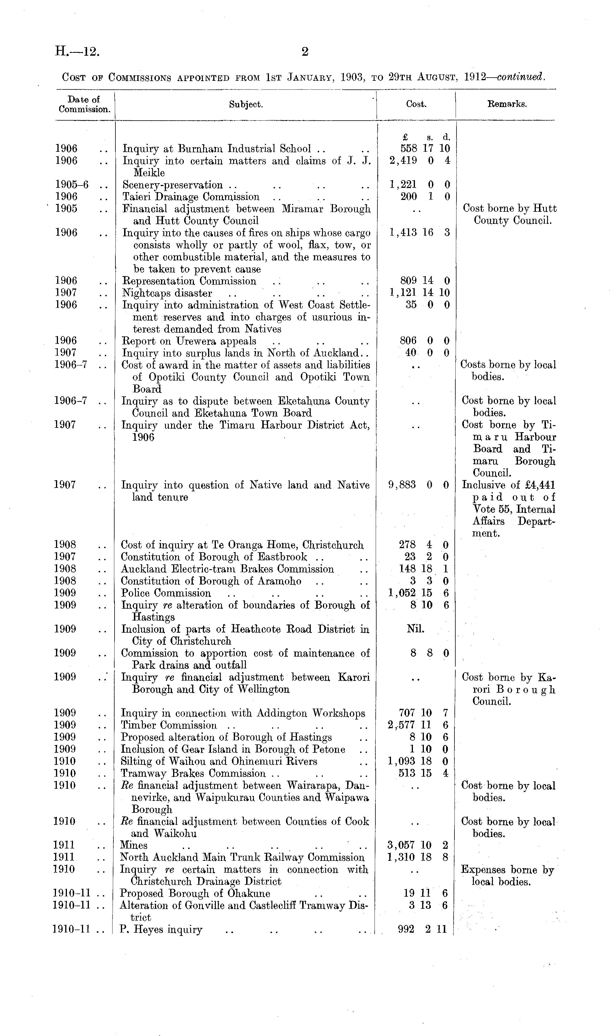 Date of Commission. | Subject. Cost. Remarks. 1906 1906 Inquiry at Burnham Industrial School Inquiry into certain matters and claims of J. J. Meikle £ a. d. 558 17 10 2,419 0 4 1905-6 1906 1905 Scenery-preservation Taieri Drainage Commission Financial adjustment between Miramar Borough and Hutt County Council Inquiry into the causes of fires on ships whose cargo consists wholly or partly of wool, flax, tow, or other combustible material, and the measures to be taken to prevent cause Representation Commission .; Nightcaps disaster Inquiry into administration of West Coast Settlement reserves and into charges of usurious interest demanded from Natives Report on Urewera appeals Inquiry into surplus lands in North of Auckland.. Cost of award in the matter of assets and liabilities of Opotiki County Council and Opotiki Town Board Inquiry as to dispute between Eketahuna County Council and Eketahuna Town Board Inquiry under the Timaru Harbour District Act, 1906 1,221 0 0 200 1 0 Cost borne by Hut' County Council. 1906 1,413 16 3 1906 1907 1906 809 14 0 1,121 14 10 35 0 0 1906 1907 1906-7 806 0 0 40 0 0 Costs borne by local bodies. 1906-7 Cost borne by local bodies. Cost borne by Tiro, a r u Harbour Board and Timaru Borough Council. Inclusive of £4,441 paid out of Vote 55, Internal Affairs Depart1907 1907 Inquiry into question of Native land and Native land tenure 9,883 0 0 1908 1907 1908 1908 1909 1909 Cost of inquiry at Te Oranga Home, Christchurch Constitution of Borough of Eastbrook Auckland Electric-tram Brakes Commission Constitution of Borough of Aramoho Police Commission Inquiry re alteration of boundaries of Borough of Hastings Inclusion of parts of Heathcote Road District in City of Christchurch Commission to apportion cost of maintenance of Park drains and outfall Inquiry re financial adjustment between Karori Borough and City of Wellington 278 4 0 23 2 0 148 18 1 3 3 0 1,052 15 6 8 10 6 ment. 1909 Nil. 1909 8 8 0 Cost borne by Karori Borough Council. 1909 1909 1909 1909 1909 1910 1910 1910 Inquiry in connection with Addington Workshops Timber Commission Proposed alteration of Borough of Hastings Inclusion of Gear Island in Borough of Petone Silting of Waihou and Ohinemuri Rivers Tramway Brakes Commission Re financial adjustment between Wairarapa, Dannevirke, and Waipukurau Counties and Waipawa Borough Re financial adjustment between Counties of Cook and Waikohu Mines .. .. .. .. ' .. North Auckland Main Trunk Railway Commission Inquiry re certain matters in connection with Christchurch Drainage District Proposed Borough of Ohakune Alteration of Gonville and Castlecliff Tramway District P. Heyes inquiry 707 10 7 2,-577 11 6 8 10 6 1 10 0 1,093 18 0 513 15 4 Cost borne by local bodies. 1910 Cost borne by local bodies. 1911 1911 1910 3,057 10 2 1,310 18 8 Expenses borne by local bodies. 1910-11 .. 1910-11 .. 19 11 6 3 13 6 1910-11 .. 992 2 11