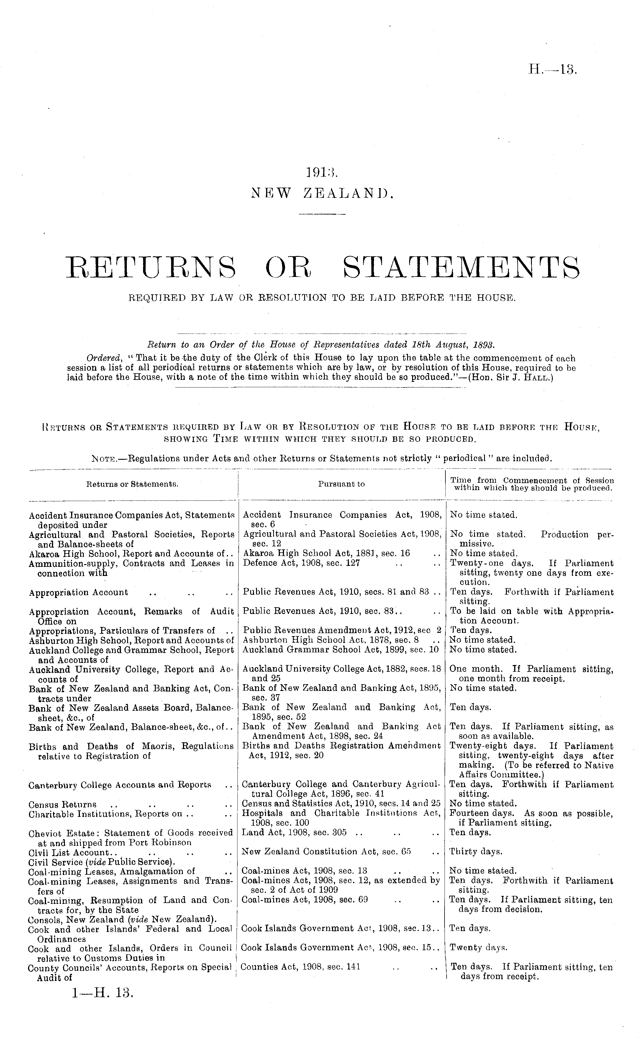 Note.—Regulations un der Acts £ md other Returns or Statements not strictly " periodical " are included. B,,™«»t f« Time from Commencement of Session pursuant to within which they should bo produced. Returns or Statements. Acoident Insurance Companies Act, Statements deposited under Agricultural and Pastoral Societies, Reports and Balance-sheets of Akaroa High School, Report and Accounts of.. Ammunition-supply, Contracts and Leases in connection with Accident Insurance Companies Act, 1908, No time stated, sec. 6 Agricultural and Pastoral Societies Act, 1908, No time stated. Production persec. 12 missive. Akaroa High School Act, 1881, sec. 16 .. No time stated. Defence Act, 1908, sec. 127 .. .. Twenty-one days. If Parliament sitting, twenty one days from execution. Public Revenues Act, 1910, sees. 81 and 83 .. Ten days. Forthwith if Parliament sitting. Public Revenues Act, 1910, sec. 83.. .. To be laid on table with Appropriation Account. Public Revenues Amendment Act, 1912, sec 2 Ten days. Ashburton High School Act, 1878, sec. 8 .. No time stated. Auokland Grammar School Act, 1899, sec. 10 No time stated. Appropriation Account Appropriation Account, Remarks of Audit Office on Appropriations, Particulars of Transfers of Ashburton High School, Report and Accounts of Auckland College and Grammar School, Report and Accounts of Auokland University College, Report and Accounts of Bank of New Zealand and Banking Act, Contracts under Bank of New Zealand Assets Board, Balancesheet, &c, of Bank of New Zealand, Balance-sheet, &c, of.. Auckland University College Act, 1882, sees. 18 One month. If Parliament sitting, and 25 one month from receipt. I Bank of New Zealand and Banking Act, 1895, No time stated. sec. 37 Bank of New Zealand and Banking Act, Ten days. 1895, sec. 52 Bank of New Zealand and Banking Act Ten days. If Parliament sitting, as Amendment Act, 1898, sec. 24 soon as available. BirthB and Deaths Registration Amendment Twenty-eight days. If Parliament Act, 1912, sec. 20 sitting, twenty-eight days after making. (To be referred to Native Affairs Committee.) Canterbury College and Canterbury Agricul- Ten days. Forthwith if Parliament tural College Act, 1896, sec. 41 sitting. Census and Statistics Act, 1910, sees. 14 and 25 No time stated. Hospitals and Charitable Institutions Act, Fourteen days. As soon as possible, 1908, sec. 100 if Parliament sitting. Land Act, 1908, sec. 305 .. .. .. Ten days. Births and Deaths of Maoris, Regulations relative to Registration of Canterbury College Accounts and Reports Census Returns Charitable Institutions, Reports on .. Cheviot Estate : Statement of Goods received at and shipped from Port Robinson Civil List Account.. Civil Service (vide Public Service). Coal-mining Leases, Amalgamation of Coal-mining Leases, Assignments and Transfers of Coal-mining, Resumption of Land and Contracts for, by the State Consols, New Zealand (vide New Zealand). Cook and other Islands' Federal and Local Ordinances Cook and other Islands, Orders in Council relative to Customs Duties in County Councils' Accounts, Reports on Special Audit of New Zealand Constitution Act, sec. 05 .. Thirty days. Coal-mines Act, 1908, sec. 13 .. .. No time stated. Coal-mines Act, 1908, sec. 12, as extended by Ten days. Forthwith if Parliament sec. 2 of Act of 1909 sitting. Coal-mines Act, 1908, sec. G9 .. .. Ten days. If Parliament sitting, ten days from decision. Cook Islands Government Act, 1908, sec. 13.. Ten days. Cook Islands Government Ac h , 1908, seo. 15.. Twenty days. Counties Act, 1908, sec. 141 .. .. Ten days. If Parliament sitting, ten days from receipt.