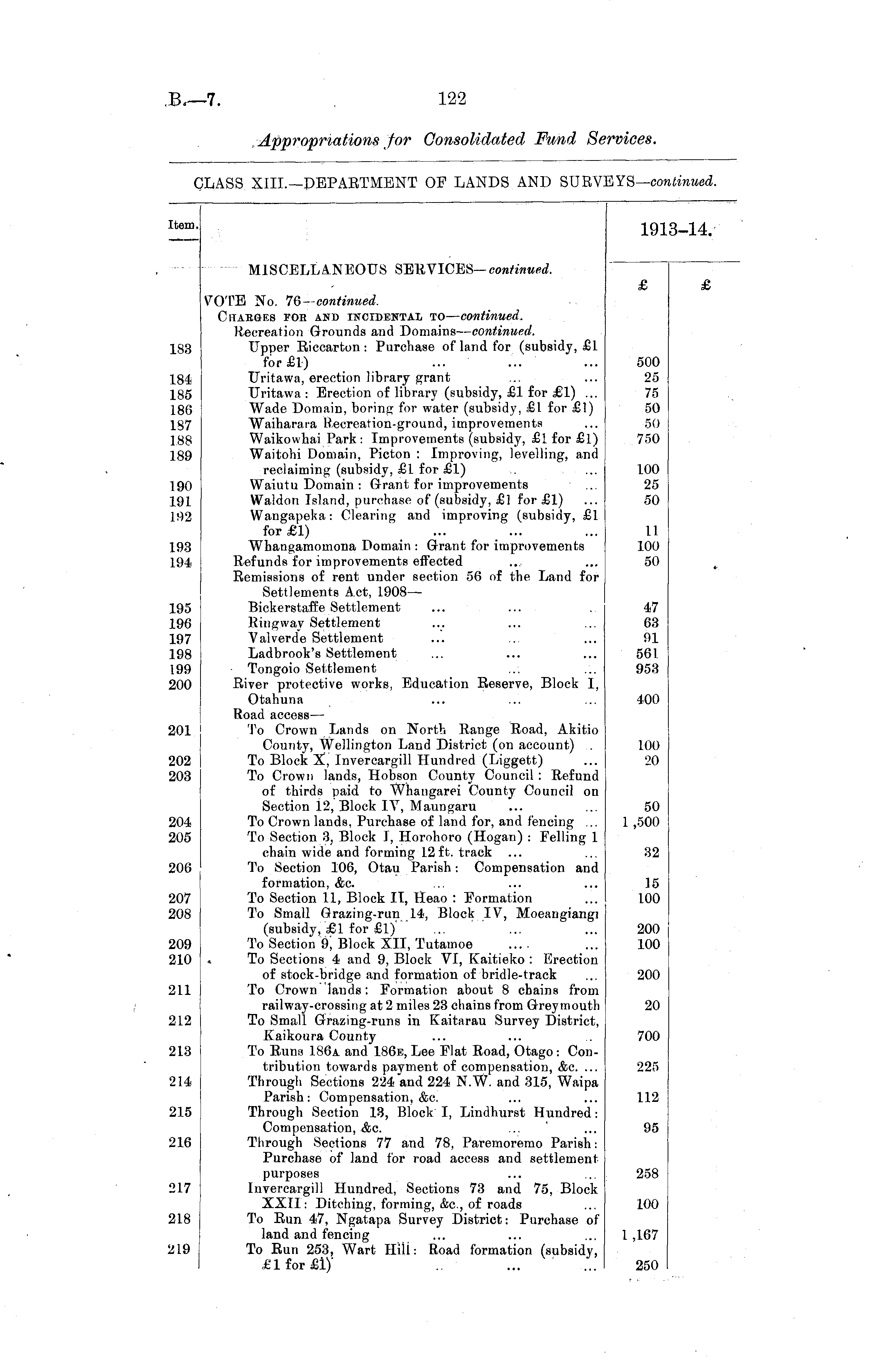 .tem. 191 i-14. MISCELLANEOUS SERVICES— continued. 183 184 185 186 187 188 189 190 191 192 193 194 195 196 197 198 199 200 201 VOTE No. 76—continued. Cftaeges foe and incidental TO — continued. Recreation Grounds and Domains— continued. Upper Riccarton: Purchase of land for (subsidy, £1 for£l) Uritawa, erection library grant Uritawa : Erection of library (subsidy, £1 for £1) ... Wade Domain, boring for water (subsidy, £1 for £1) Waiharara Recreation-ground, improvements Waikowhai Park: Improvements (subsidy, £1 for £l) Waitohi Domain, Picton : Improving, levelling, and reclaiming (subsidy, £1 for £1) Waiutu Domain : Grant for improvements Waldon Island, purchase of (subsidy, £1 for £1) Wangapeka: Clearing and improving (subsidy, £1 for£l) Whangamomona Domain : Grant for improvements Refunds for improvements effected Remissions of rent under section 56 of the Land for Settlements Act, 1908— Bickerstaffe Settlement Ringway Settlement Valverde Settlement Ladbrook's Settlement Tongoio Settlement River protective works, Education Reserve, Block I, Otahuna Road access — To Crown Lands on North Range Road, Akitio County, Wellington Land District (on account) . To Block X, Invercargill Hundred (Liggett) To Crown lands, Hobson County Council : Refund of thirds paid to Whangarei County Council on Section 12, Block IV, Maungaru To Crown lands, Purchase of land for, and fencing ... To Section 3, Block I, Horohoro (Hogan) : Felling 1 chain wide and forming 12 ft. track To Section 106, Otau Parish: Compensation and formation, &c. To Section 11, Block IT, Heao : Formation To Small Grazing-run 14, Block IV, Moeangiangi (subsidy, £1 for £l)' To Section 9, Block XII, Tutamoe .... To Sections 4 and 9, Block VI, Kaitieko : Erection of stock-bridge and formation of bridle-track To Crown lands: Formation about 8 chains from railway-crossing at 2 miles 23 chains from Greymouth To Small Grazing-runs in Kaitarau Survey District, Kaikoura County To Runs 186a and 186e, Lee Flat Road, Otago: Contribution towards payment of compensation, &c. ... Through Sections 224 and 224 N.W. and 315, Waipa Parish: Compensation, &c. Through Section 13, Block I, Lindhurst Hundred: Compensation, &c. Through Sections 77 and 78, Paremoremo Parish: Purchase of land for road access and settlement 500 25 75 50 50 750 100 25 50 11 100 50 47 63 91 561 953 400 100 20 * 202 203 50 1 ,500 204 205 206 82 207 208 15 100 209 210 200 100 211 200 212 20 213 700 214 225 215 112 216 95 purposes Invercargill Hundred, Sections 73 and 75, Block XXII: Ditching, forming, &c, of roads To Run 47, Ngatapa Survey District: Purchase of land and fencing To Run 253, Wart Hill: Road formation (subsidy, £lfor£l)* 258 217 100 218 219 1,167 250