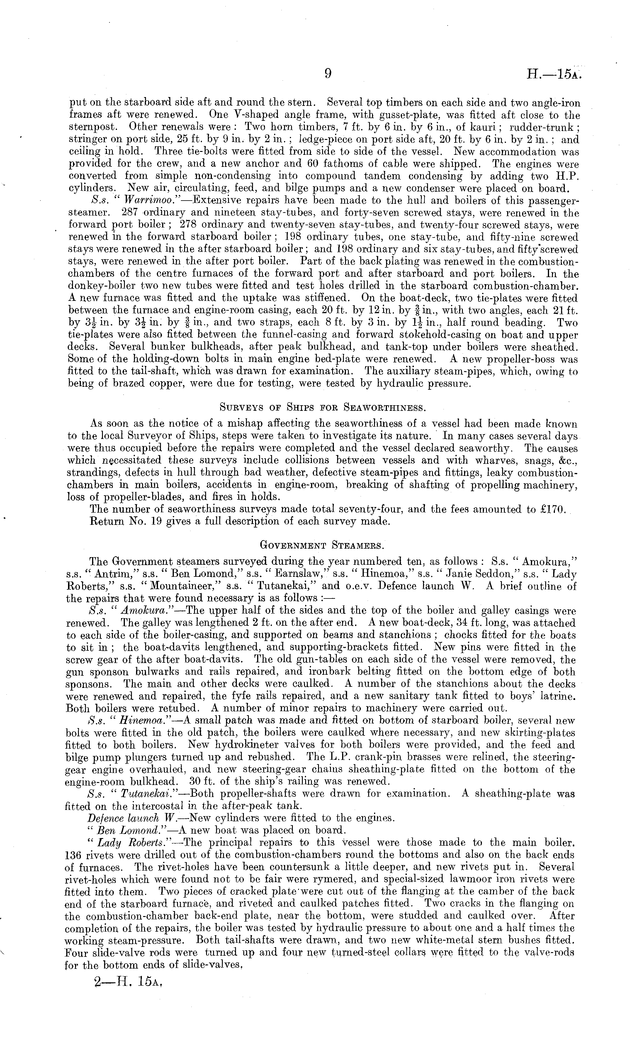 put on the starboard side aft and round the stern. Several top timbers on each side and two angle-iron frames aft were renewed. One V-shaped angle frame, with gusset-plate, was fitted aft close to the sternpost. Other renewals were : Two horn timbers, 7 ft. by 6 in. by 6 in., of kauri; rudder-trunk ; stringer on port side, 25 ft. by 9 in. by 2 in. ; ledge-piece on port side aft, 20 ft. by 6 in. by 2 in. ; and ceiling in hold. Three tie-bolts were fitted from side to side of the vessel. New accommodation was provided for the crew, and a new anchor and 60 fathoms of cable were shipped. The engines were converted from simple non-condensing into compound tandem condensing by adding two H.P. cylinders. New air, circulating, feed, and bilge pumps and a new condenser were placed on board. S.s. " Warrimoo." —Extensive repairs have been made to the hull and boilers of this passengersteamer. 287 ordinary and nineteen stay-tubes, and forty-seven screwed stays, were renewed in the forward port boiler ; 278 ordinary and twenty-seven stay-tubes, and twenty-four screwed stays, were renewed in the forward starboard boiler ; 198 ordinary tubes, one stay-tube, and fifty-nine screwed stays were renewed in the after starboard boiler ; and 198 ordinary and six stay-tubes, and fifty "screwed stays, were renewed in the after port boiler. Part of the back plating was renewed in the combustionchambers of the centre furnaces of the forward port and after starboard and port boilers. In the donkey-boiler two new tubes were fitted and test holes drilled in the starboard combustion-chamber. A new furnace was fitted and the uptake was stiffened. On the boat-deck, two tie-plates were fitted between the furnace and engine-room casing, each 20 ft. by 12 in. by fin., with two angles, each 21 ft. by 3f in. by 3Jin. by fin., and two straps, each 8 ft. by 3 in. by 1| in., half round beading. Two tie-plates were also fitted between the funnel-casing and forward stokehold-casing on boat and upper decks. Several bunker bulkheads, after peak bulkhead, and tank-top under boilers were sheathed. Some of the holding-down bolts in main engine bed-plate were renewed. A new propeller-boss was fitted to the tail-shaft, which was drawn for examination. The auxiliary steam-pipes, which, owing to being of brazed copper, were due for testing, were tested by hydraulic pressure. Surveys op Ships for Seaworthiness. As soon as the notice of a mishap affecting the seaworthiness of a vessel had been made known to the local Surveyor of Ships, steps were taken to investigate its nature. In many cases several days were thus occupied before the repairs were completed and the vessel declared seaworthy. The causes which necessitated these surveys include collisions between vessels and with wharves, snags, <fee, strandings, defects in hull through bad weather, defective steam-pipes and fittings, leaky combustionchambers in main boilers, accidents in engine-room, breaking of shafting of propelling machinery, loss of propeller-blades, and fires in holds. The number of seaworthiness surveys made total seventy-four, and the fees amounted to £170. Return No. 19 gives a full description of each survey made. Government Steamers. The Government steamers surveyed during the year numbered ten, as follows : S.s. " Amokura," s.s. " Antrim," s.s. " Ben Lomond," s.s. " Earnslaw," s.s. " Hinemoa," s.s. " Janie Seddon," s.s. " Lady Roberts," s.s. " Mountaineer," s.s. " Tutanekai," and o.e.v. Defence launch W. A brief outline of the repairs that were found necessary is as follows : — S.s. " Amokura." —The upper half of the sides and the top of the boiler and galley casings were renewed. The galley was lengthened 2 ft. on the after end. A new boat-deck, 34 ft. long, was attached to each side of the boiler-casing, and supported on beams and stanchions ; chocks fitted for the boats to sit in ; the boat-davits lengthened, and supporting-brackets fitted. New pins were fitted in the screw gear of the after boat-davits. The old gun-tables on each side of the vessel were removed, the gun sponson bulwarks and rails repaired, and ironbark belting fitted on the bottom edge of both sponsons. The main and other decks were caulked. A number of the stanchions about the decks were renewed and repaired, the fyfe rails repaired, and a new sanitary tank fitted to boys' latrine. Both boilers were retubed. A number of minor repairs to machinery were carried out. S.s. " Hinemoa." —A small patch was made and fitted on bottom of starboard boiler, several new bolts were fitted in the old patch, the boilers were caulked where necessary, and new skirting-plates fitted to both boilers. New hydrokineter valves for both boilers were provided, and the feed and bilge pump plungers turned up and rebushed. The L.P. crank-pin brasses were relined, the steeringgear engine overhauled, and new steering-gear chains shea thing-plate fitted on the bottom of the engine-room bulkhead. 30 ft. of the ship's railing was renewed. S.s. " Tutanekai." —Both propeller-shafts were drawn for examination. A sheathing-plate was fitted on the intercostal in the after-peak tank. Defence launch W. —New cylinders were fitted to the engines. " Ben Lomond." —A new boat was placed on board. " Lady Roberts." —The principal repairs to this vessel were those made to the main boiler. 136 rivets were drilled out of the combustion-chambers round the bottoms and also on the back ends of furnaces. The rivet-holes have been countersunk a little deeper, and new rivets put in. Several rivet-holes which were found not to be fair were rymered, and special-sized lawmoor iron rivets were fitted into them. Two pieces of cracked plate were cut out of the flanging at the camber of the back end of the starboard furnace, and riveted and caulked patches fitted. Two cracks in the flanging on the combustion-chamber back-end plate, near the bottom, were studded and caulked over. After completion of the repairs, the boiler was tested by h