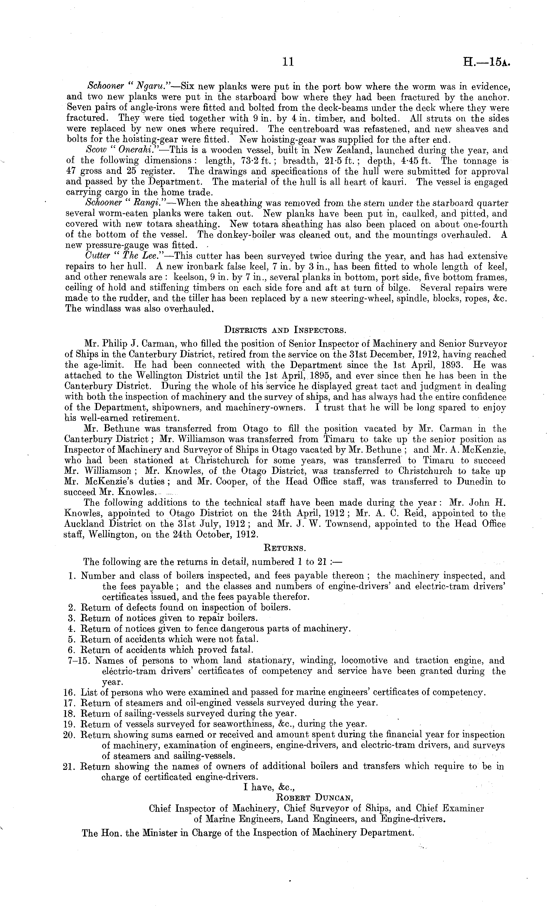 Schooner " Ngaru." —Six new planks were put in the port bow where the worm was in evidence, and two new planks were put in the starboard bow where they had been fractured by the anchor. Seven pairs of angle-irons were fitted and bolted from the deck-beams under the deck where they were fractured. They were tied together with 9 in. by 4 in. timber, and bolted. All struts on the sides were replaced by new ones where required. The centreboard was refastened, and new sheaves and bolts for the hoisting-gear were fitted. New hoisting-gear was supplied for the after end. Scow " Onerahi." —This is a wooden vessel, built in New Zealand, launched during the year, and of the following dimensions : length, 73-2 ft.; breadth, 21-5 ft. ; depth, 445 ft. The tonnage is 47 gross and 25 register. The drawings and specifications of the hull were submitted for approval and passed by the Department. The material of the hull is all heart of kauri. The vessel is engaged carrying cargo in the home trade. Schooner " Rangi." —When the sheathing was removed from the stern under the starboard quarter several worm-eaten planks were taken out. New planks have been put in, caulked, and pitted, and covered with new totara sheathing. New totara sheathing has also been placed on about one-fourth of the bottom of the vessel. The donkey-boiler was cleaned out, and the mountings overhauled. A new pressure-gauge was fitted. • Gutter " The Lee." —This cutter has been surveyed twice during the year, and has had extensive repairs to her hull. A new iron bark false keel, 7 in. by 3 in., has been fitted to whole length of keel, and other renewals are : keelson, 9 in. by 7 in., several planks in bottom, port side, five bottom frames, ceiling of hold and stiffening timbers on each side fore and aft at turn of bilge. Several repairs were made to the rudder, and the tiller has been replaced by a new steering-wheel, spindle, blocks, ropes, &c. The windlass was also overhauled. Districts and Inspectors. Mr. Philip J. Carman, who filled the position of Senior Inspector of Machinery and Senior Surveyor of Ships in the Canterbury District, retired from the service on the 31st December, 1912, having reached the age-limit. He had been connected with the Department since the Ist April, 1893. He was attached to the Wellington District until the Ist April, 1895, and ever since then he has been in the Canterbury District. During the whole of his service he displayed great tact and judgment in dealing with both the inspection of machinery and the survey of ships, and has always had the entire confidence of the Department, shipowners, and machinery-owners. I trust that he will be long spared to enjoy his well-earned retirement. Mr. Bethune was transferred from Otago to fill the position vacated by Mr. Carman in the Canterbury District; Mr. Williamson was transferred from Timaru to take up the senior position as Inspector of Machinery and Surveyor of Ships in Otago vacated by Mr. Bethune ; and Mr. A. McKenzie, who had been stationed at Christchurch for some years, was transferred to Timaru to succeed Mr. Williamson ; Mr. Knowles, of the Otago District, was transferred to Christchurch to take up Mr. McKenzie's duties ; and Mr. Cooper, of the Head Office staff, was transferred to Dunedin to succeed Mr. Knowles. The following additions to the technical staff have been made during the year : Mr. John H. Knowles, appointed to Otago District on the 24th April, 1912 ; Mr. A. C. Reid, appointed to the Auckland District on the 31st July, 1912 ; and Mr. J. W. Townsend, appointed to the Head Office staff, Wellington, on the 24th October, 1912. Eeturns. The following are the returns in detail, numbered 1 to 21 : — 1. Number and class of boilers inspected, and fees payable thereon ; the machinery inspected, and the fees payable ; and the classes and numbers of engine-drivers' and electric-tram drivers' certificates issued, and the fees payable therefor. 2. Return of defects found on inspection of boilers. 3. Return of notices given to repair boilers. 4. Return of notices given to fence dangerous parts of machinery. 5. Return of accidents which were not fatal. 6. Return of accidents which proved fatal. 7-15. Names of persons to whom land stationary, winding, locomotive and traction engine, and electric-tram drivers' certificates of competency and service have been granted during the year. 16. List of persons who were examined and passed for marine engineers' certificates of competency. 17. Return of steamers and oil-engined vessels surveyed during the year. 18. Return of sailing-vessels surveyed during the year. 19. Return of vessels surveyed for seaworthiness, &c, during the year. 20. Return showing sums earned or received and amount spent during the financial year for inspection of machinery, examination of engineers, engine-drivers, and electric-tram drivers, and surveys of steamers and sailing-vessels. 21. Return showing the names of owners of additional boilers and transfers which require to be in charge of certificated engine-drivers. I have, &c, Robert Duncan, Chief Inspector of Machinery, Chief Surveyor of Ships, and Chief Examiner of Marine Engineers, Land Engineers, and Engine-drivers. The Hon. the Minister in Charge of the Inspection of Machinery Department.