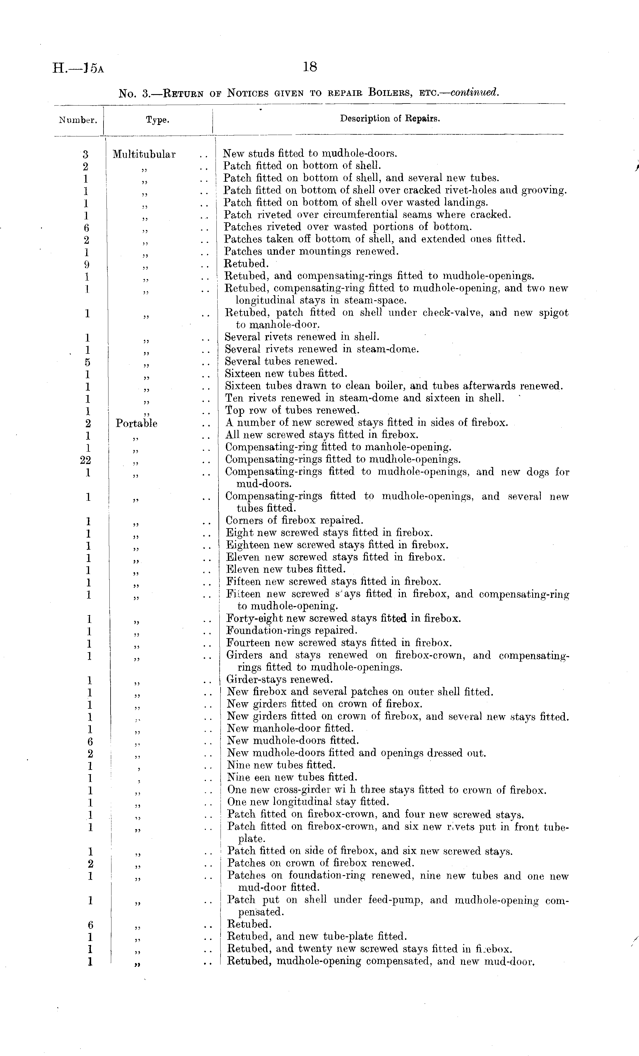 umber. Type. Description of Itepairs. 3 2 1 1 1 1 6 2 1 9 1 1 Multitubular ,5 >; ,, >, ,, ,, )) New studs fitted to mudhole-doors. Patch fitted on bottom of shell. Patch fitted on bottom of shell, and several new tubes. Patch fitted on bottom of shell over cracked rivet-holes and grooving. Patch fitted on bottom of shell over wasted landings. Patch riveted over circumferential seams where cracked. Patches riveted over wasted portions of bottom. Patches taken off bottom of shell, and extended ones fitted. Patches under mountings renewed. Retubed. Retubed, and compensating-rings fitted to mudhole-openings. Retubed, compensating-ring fitted to mudhole-opening, and two new longitudinal stays in steam-space. Retubed, patch fitted on shell under check-valve, and new spigot to manhole-door. Several rivets renewed in shell. Several rivets renewed in steam-dome. Several tubes renewed. Sixteen new tubes fitted. Sixteen tubes drawn to clean boiler, and tubes afterwards renewed. Ten rivets renewed in steam-dome and sixteen in shell. Top row of tubes renewed. A number of new screwed stays fitted in sides of firebox. All new screwed stays fitted in firebox. Compensating-ring fitted to manhole-opening. Compensating-rings fitted to mudhole-openings. Compensating-rings fitted to mudhole-openings, and new dogs for mud-doors. Compensating-rings fitted to mudhole-openings, and several new tubes fitted. Corners of firebox repaired. Eight new screwed stays fitted in firebox. Eighteen new screwed stays fitted in firebox. Eleven new screwed stays fitted in firebox. Eleven new tubes fitted. Fifteen new screwed stays fitted in firebox. FiLteen new screwed s'ays fitted in firebox, and compensating-ring to mudhole-opening. Forty-eight new screwed stays fitted in firebox. Foundation-rings repaired. Fourteen new screwed stays fitted in firebox. Girders and stays renewed on firebox-crown, and compensatingrings fitted to mudhole-openings. Girder-stays renewed. New firebox and several patches on outer shell fitted. New girders fitted on crown of firebox. New girders fitted on crown of firebox, and several new stays fitted. New manhole-door fitted. New mudhole-doors fitted. New mudhole-doors fitted and openings dressed out. Nine new tubes fitted. Nine een new tubes fitted. One new cross-girder wi h three stays fitted to crown of firebox. One new longitudinal stay fitted. Patch fitted on firebox-crown, and four new screwed stays. Patch fitted on firebox-crown, and six new rivets put in front tubeplate. Patch fitted on side of firebox, and six new screwed stays. Patches on crown of firebox renewed. Patches on foundation-ring renewed, nine new tubes and one new mud-door fitted. Patch put on shell under feed-pump, and mudhole-opening compensated. Retubed. Retubed, and new tube-plate fitted. Retubed, and twent) r new screwed stays fitted in fLebox. Retubed, mudhole-opening compensated, and new mud-door. 1 ,, 1 1 5 1 1 1 1 2 1 1 22 1 ,, >5 >5 yy ,, Portable ,, >7 1 it 1 1 1 1 1 1 1 55 55 55 55 55 55 5) 1 1 1 1 55 55 55 55 1 1 1 1 1 6 2 1 1 1 1 1 1 55 J) 5, ,5 ,) j 5, 55 1 2 1 ,5 55 55 1 55 6 1 1 1 5? )) II ,,