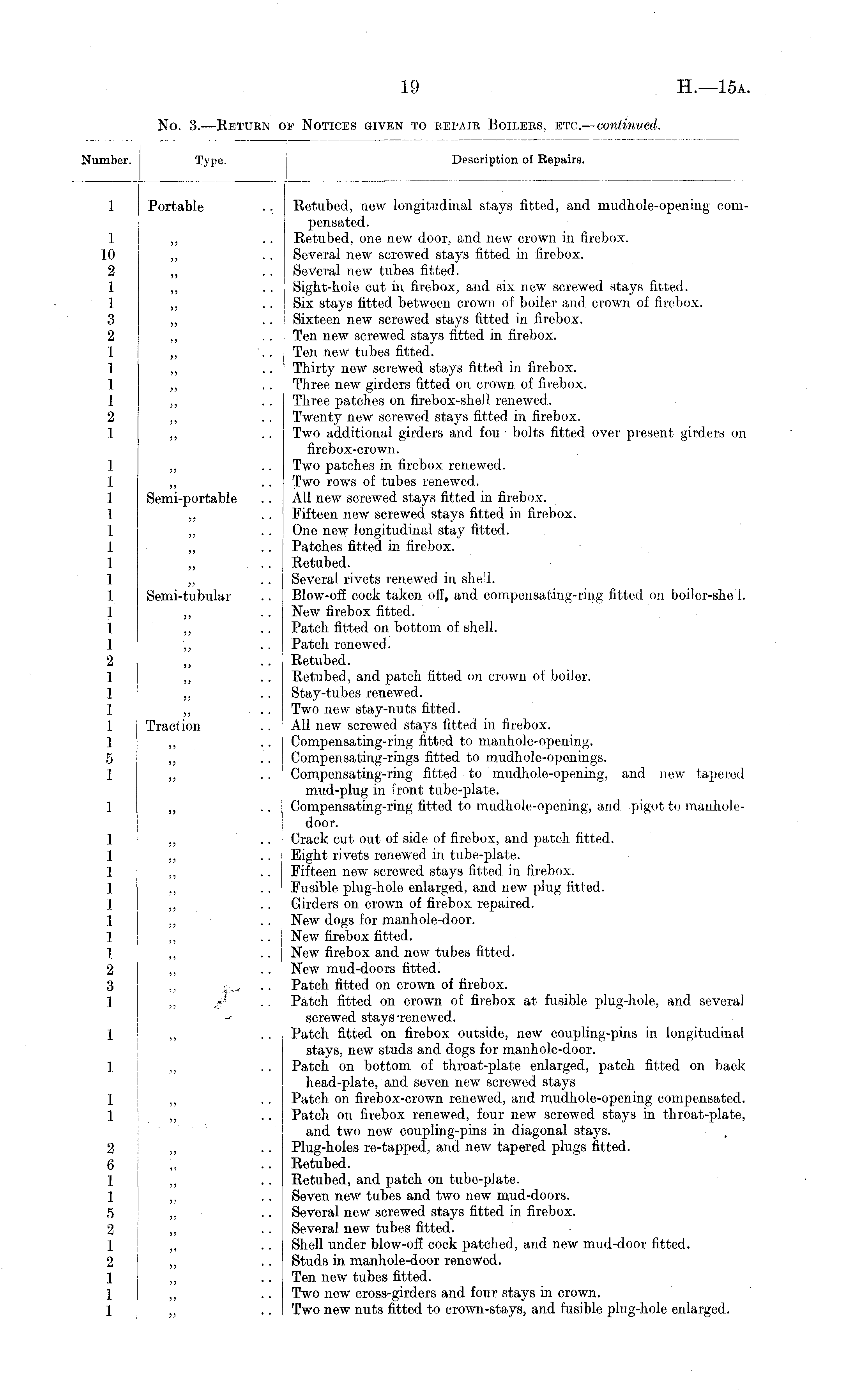 Number. Type. Description of Repairs. 1 1 10 2 1 1 3 2 1 1 1 1 2 1 1 1 1 1 1 1 1 1 1 1 1 1 2 1 1 1 1 1 5 1 Portable )) i> 3) j; 33 33 )> )J J3 J) 3) 33 Semi-portable )) 13 Semi-tubular 3) 3) 33 J3 )) 33 33 Trad ion 3J Retubed, new longitudinal stays fitted, and mudhole-opening compensated. Retubed, one new door, and new crown in firebox. Several new screwed stays fitted in firebox. Several new tubes fitted. Sight-hole cut in firebox, and six new screwed stays fitted. Six stays fitted between crown of boiler and crown of firebox. Sixteen new screwed stays fitted in firebox. Ten new screwed stays fitted in firebox. Ten new tubes fitted. Thirty new screwed stays fitted in firebox. Three new girders fitted on crown of firebox. Three patches on firebox-shell renewed. Twenty new screwed stays fitted in firebox. Two additional girders and fou - bolts fitted over present girders on firebox-crown. Two patches in firebox renewed. Two rows of tubes renewed. All new screwed stays fitted in firebox. Fifteen new screwed stays fitted in firebox. One new longitudinal stay fitted. Patches fitted in firebox. Retubed. Several rivets renewed in shell. Blow-off cock taken off, and compensating-ring fitted on boiler-she J. New firebox fitted. Patch fitted on bottom of shell. Patch renewed. Retubed. Retubed, and patch fitted on crown of boiler. Stay-tubes renewed. Two new stay-nuts fitted. All new screwed stays fitted in firebox. Compensating-ring fitted to manhole-opening. Compensating-rings fitted to mudhole-openings. Compensating-ring fitted to mudhole-opening, and new tapered mud-plug in front tube-plate. Com.pensating-ring fitted to mudhole-opening, and pigot to manholedoor. Crack cut out of side of firebox, and patch fitted. Eight rivets renewed in tube-plate. Fifteen new screwed stays fitted in firebox. Fusible plug-hole enlarged, and new plug fitted. Girders on crown of firebox repaired. New dogs for manhole-door. New firebox fitted. New firebox and new tubes fitted. New mud-doors fitted. Patch fitted on crown of firebox. Patch fitted on crown of firebox at fusible plug-hole, and several screwed stays renewed. Patch fitted on firebox outside, new coupling-pins in longitudinal stays, new studs and dogs for manhole-door. Patch on bottom of throat-plate enlarged, patch fitted on back head-plate, and seven new screwed stays Patch on firebox-crown renewed, and mudhole-opening compensated. Patch on firebox renewed, four new screwed stays in throat-plate, and two new coupling-pins in diagonal stays. Plug-holes re-tapped, and new tapered plugs fitted. Retubed. Retubed, and patch on tube-plate. Seven new tubes and two new mud-doors. Several new screwed stays fitted in firebox. Several new tubes fitted. Shell under blow-off cock patched, and new mud-door fitted. Studs in manhole-door renewed. Ten new tubes fitted. Two new cross-girders and four stays in crown. Two new nuts fitted to crown-stays, and fusible plug-hole enlarged. it 1 j> 1 1 1 1 1 1 1 1 2 3 1 33 33 33 )3 » 1 33 1 33 1 1 )3 3) 2 c> 1 1 5 2 1 2 1 1 I 33 33 ?3 J3 33 33 33 )> JJ 33 )3