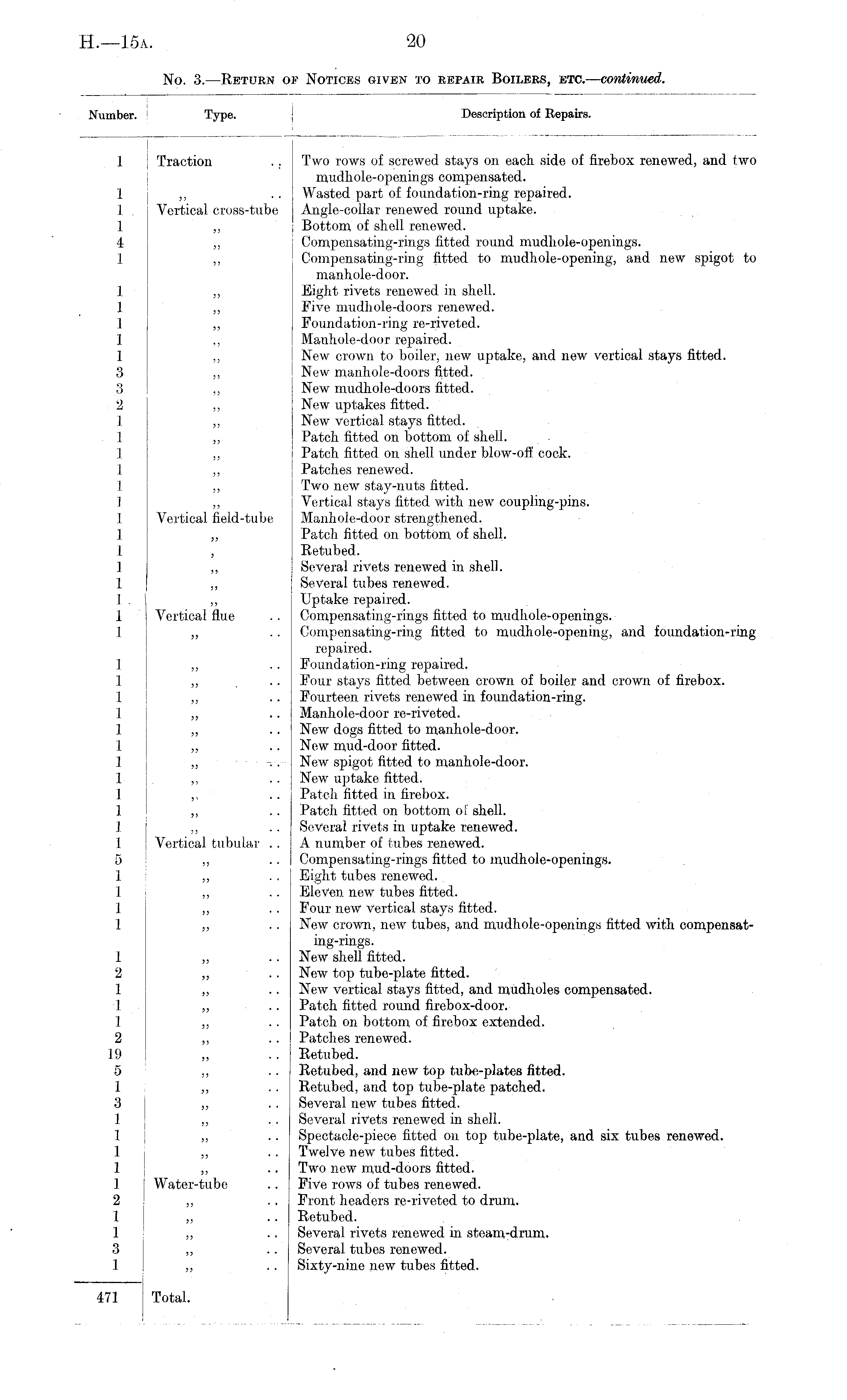 Number. Type. Description of Repairs. 1 1 1 1 4 1 1 1 1 1 1 3 3 2 J 1 1 1 1 1 1 1 1 1 1 1 1 1 1 1 1 1 1 1 1 1 1 1 ] 1 Traction . . Vertical cross-tube j; )! ,j i1 11 ,5 ii ii 11 ,, Vertical field-tube ,, , ■>■> i> ii Vertical flue J? ■ ■ ii •' ii ii ' • Two rows of screwed stays on each side of firebox renewed, and two mudhole-openings compensated. Wasted part of foundation-ring repaired. Angle-collar renewed round uptake. Bottom of shell renewed. Compensating-rings fitted round mudhole-openings. Compensating-ring fitted to mudhole-opening, and new spigot to manhole-door. Eight rivets renewed in shell. Five mudhole-doors renewed. Foundation-ring re-riveted. Manhole-door repaired. New crown to boiler, new uptake, and new vertical stays fitted. New manhole-doors fitted. New mudhole-doors fitted. New uptakes fitted. New vertical stays fitted. Patch fitted on bottom of shell. Patch fitted on shell under blow-off cock. Patches renewed. Two new stay-nuts fitted. Vertical stays fitted with new coupling-pins. Manhole-door strengthened. Patch fitted on bottom of shell. Retubed. Several rivets renewed in shell. Several tubes renewed. Uptake repaired. Compensating-rings fitted to mudhole-openings. Compensating-ring fitted to mudhole-opening, and foundation-ring repaired. Foundation-ring repaired. Four stays fitted between crown of boiler and crown of firebox. Fourteen rivets renewed in foundation-ring. Manhole-door re-riveted. New dogs fitted to manhole-door. New mud-door fitted. New spigot fitted to manhole-door. New uptake fitted. Patch fitted in firebox. Patch fitted on bottom of shell. Several rivets in uptake renewed. A number of tubes renewed. Compensating-rings fitted to mudhole-openings. Eight tubes renewed. Eleven new tubes fitted. Four new vertical stays fitted. New crown, new tubes, and mudhole-openings fitted with compensat-ing-rings. New shell fitted. New top tube-plate fitted. New vertical stays fitted, and mudholes compensated. Patch fitted round firebox-door. Patch on bottom of firebox extended. Patches renewed. Retubed. Retubed, and new top tube-plates fitted. Retubed, and top tube-plate patched. Several new tubes fitted. Several rivets renewed in shell. Spectacle-piece fitted on top tube-plate, and six tubes renewed. Twelve new tubes fitted. Two new mud-doors fitted. Five rows of tubes renewed. Front headers re-riveted to drum. Retubed. Several rivets renewed in steam-drum. Several tubes renewed. Sixty-nine new tubes fitted. ii • • ii • • , j ii i * J? • • Vertical tubular . . 5 1 1 1 1 ii ii '' ii ii ' ' 1 2 1 1 1 2 19 5 1 3 1 1 1 1 1 2 1 1 3 1 ii • • ii • • ii ii ii ii ii • ' ii ii ii • • ii ii ' • Water-tube ,, ■ • ii • • ii • • 471 Total.