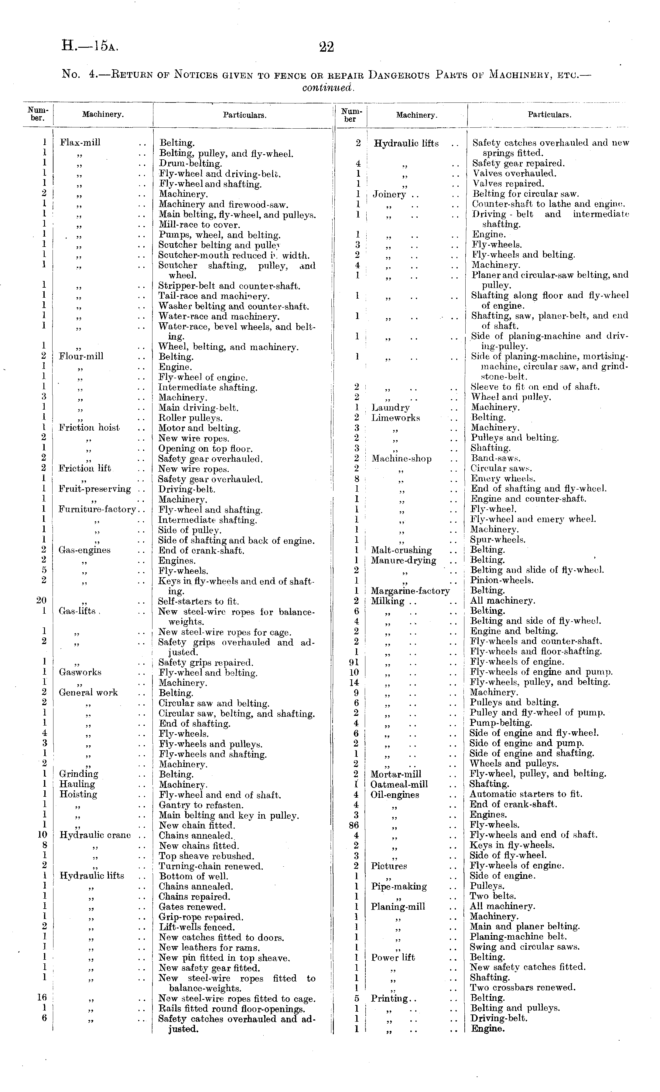 Number. I Machinery. Particulars. Number Machinery. Particulars. 1 1 1 I 1 2 J 1 ! 1 1 1 1 1 1 1 1 1 1 1 ! i 3 1 1 1 : 2 i 1 i\ i i i i i i 1 ! 2 2 I 5 2 Flax-mill Flour-mill Friction hoist Friction lift Fruit-preserving . . Furniture-factory. . Gas-engines Belting. Belting, pulley, and fly-wheel. Drum-belting. Fly-wheel and driving-belt. Ply-wheel and shafting. Machinery. Machinery and firewood-saw. Main belting, fly-wheel, and pulleys. Mill-race to cover. Pumps, wheel, and belting. Scutcher belting and pulley Scutcher-mouth reduced i'. width. Scutcher shafting, pulley, and wheel. Stripper-belt and counter-shaft. Tail-race and machinery. Washer belting and counter-shaft. Water-race and machinery. Water-race, bevel wheels, and belting. Wheel, belting, and machinery. Belting. Engine. Fly-wheel of engine. Intermediate shafting. Machinery. Main driving-belt. Roller pulleys. Motor and belting. New wire ropes. Opening on top floor. Safety gear overhauled. New wire ropes. Safety gear overhauled. Driving-belt. Machinery. Fly-wheel and shafting. Intermediate shafting. Side of pulley. Side of shafting and back of engine. End of crank-shaft. Engines. Fly-wheels. Keys in fly-wheels and end of shafting. Self-starters to fit. New steel-wire ropes for balanceweights. New steel-wire ropes for cage. Safety grips overhauled and adjusted. Safety grips repaired. Fly-wheel and belting. Machinery. Belting. Circular saw and belting. Circular saw, belting, and shafting. End of shafting. Fly-wheels. Fly-wheels and pulleys. Fly-wheels and shafting. Machinery. Belting. Machinery. Fly-wheel and end of shaft. Gantry to refasten. Main belting and key in pulley. New chain fitted. Chains annealed. New chains fitted. Top sheave rebushed. Turning-chain renewed. Bottom of well. Chains annealed. Chains repaired. Gates renewed. Grip-rope repaired. Lift-wells fenced. New catches fitted to doors. New leathers for rams. New pin fitted in top sheave. New safety gear fitted. New steel-wire ropes fitted to balance-weights. New steel-wire ropes fitted to cage. Rails fitted round floor-openings. Safety catches overhauled and adjusted. i i 2 Hydraulic lifts .. 4 1 1 1 ! Joinery 1 1 1 „ 3 2 4 " 1 „ 1 „ 1 „ .. 1 ,, 1 2 „ 2 „ 1 Laundry 2 Limeworks 3 .„ 2 3 2 Machine-shop 2 8 1 1 i II I 1 1 i 1 Malt-crushing 1 Manure-drving 2 1 1 Margarine-factory 2 Milking 6 4 j 2 I 2 1 i 91 „ 10 „ .. 14 9 6 „ 2 4 j ',', Si :: :: :: i\ ;, :: :: 2 i Mortar-mill 1 i Oatmeal-mill 4 Oil-engines 4 3 86 4 2 3 2 Pictures 1 „ 1 Pipe-making 1 1 Planing-mill 1 1 1 1 1 ! Power lift 1 „ 1 I 5 Printing.. 1 i 1 i 1 I Safety catches overhauled and new springs fitted. Safety gear repaired. Valves overhauled. Valves repaired. Belting for circular saw. Counter-shaft to lathe and engine. Driving - belt and intermediate shafting. Engine. Fly-wheels. Fly-wheels and belting. Machinery. Planer and circular-saw belting, and pulley. Shafting along floor and fly-wheel of engine. Shafting, saw, planer-belt, and end of shaft. Side of planiug-machine and driv-ing-pulley. Side of planing-machine, mortisingmaehine, circular saw, and grind-stone-belt. Sleeve to fit on end of shaft. Wheel and pulley. Machinery. Belting. Machinery. Pulleys and belting. Shafting. Band-saws. Circular saws. Emery wheels. End of shafting and fly-wheel. Engine and counter-shaft. Fly-wheel. Fly-wheel and emery wheel. Machinery. Spur-wheels. Belting. Belting. Belting and slide of fly-wheel. Pinion-wheels. Belting. All machinery. Belting. Belting and side of fly-wheel. Engine and belting. Fly-wheels and counter-shaft. Fly-wheels and floor-shafting. Fly-wheels of engine. Fly-wheels of engine and pump. Fly-wheels, pulley, and belting. Machinery. Pulleys and baiting. Pulley and fly-wheel of pump. Pump-belting. Side of engine and fly-wheel. Side of engine and pump. Side of engine and shafting. Wheels and pulleys. Fly-wheel, pulley, and belting. Shafting. Automatic starters to fit. End of crank-shaft. Engines. Fly-wheels. Fly-wheels and end of shaft. Keys in fly-wheels. Side of fly-wheel. Fly-wheels of engine. Side of engine. Pulleys. Two belts. All machinery. Machinery. Main and planer belting. Planing-machine belt. Swing and circular saws. Belting. New safety catches fitted. Shafting. Two crossbars renewed. Belting. Belting and pulleys. Driving-belt. Engine. 20 1 Gas-lifts . 1 2 1 1 I 2 2 1 1 4 3 1 ! i i i i i 10 8 I 2 1 1 j 1 1 1 2 j 1 1 1 1 1 Gasworks General work Grinding Hauling Hoisting Hydraulic crane .. Hydraulic lifts 16 1 6