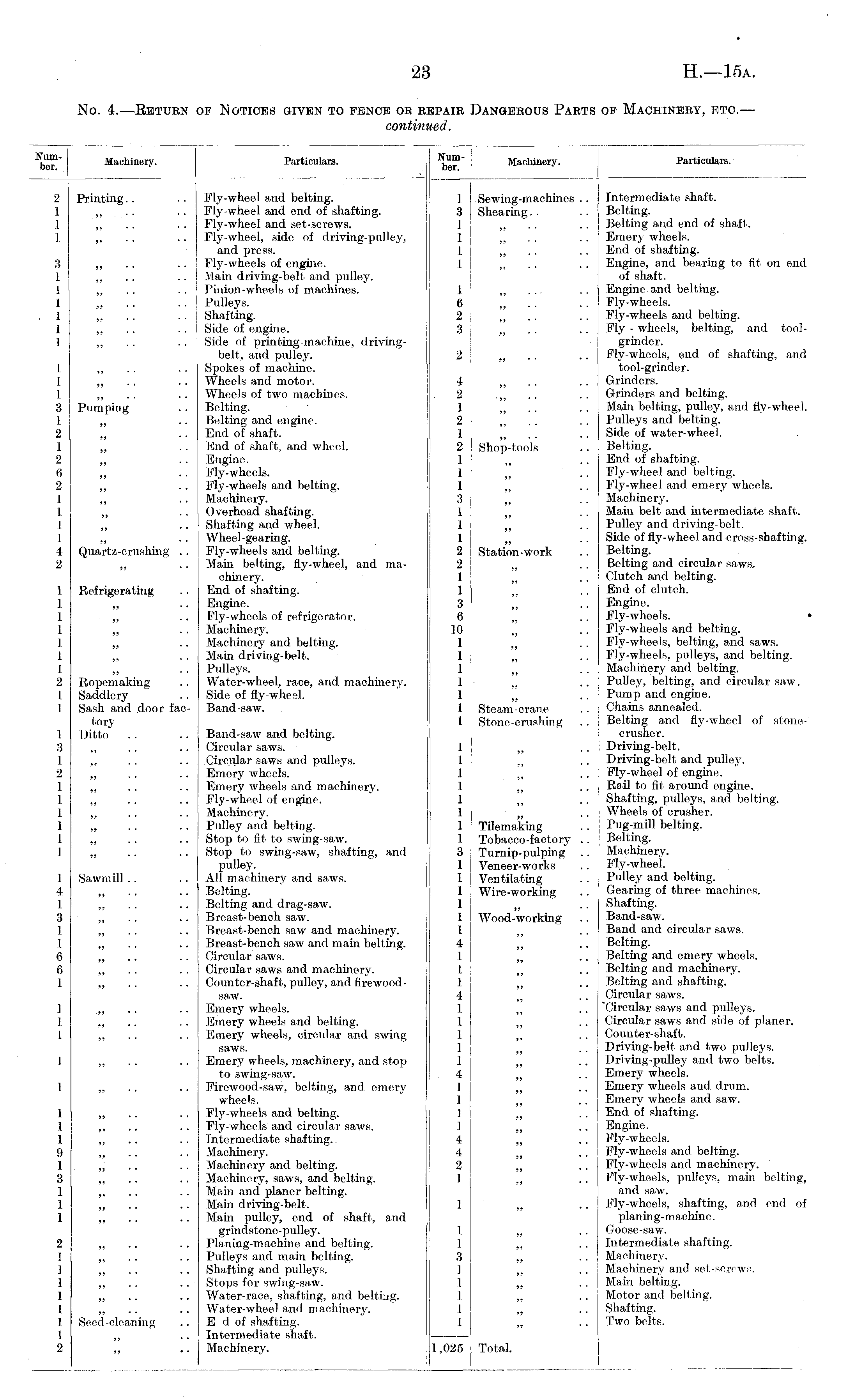 Number. Machinery. Particulars. Number. Machinery. Particulars. 2 1 1 1 3 1 1 1 . 1 1 1 1 1 1 3 1 2 1 2 6 2 1 1 1 1 4 2 2 2 1 1 Printing Pumping Quartz-crushing .. ,j • • Refrigerating Ropemaking Saddlery Sash and door factory Ditto Fly-wheel and belting. Fly-wheel and end of shafting. Fly-wheel and set-screws. Fly-wheel, side of driving-pulley, and press. Fly-wheels of engine. Main driving-belt and pulley. Pinion-wheels of machines. Pulleys. Shafting. Side of engine. Side of printing-machine, drivingbelt, and pulley. Spokes of machine. Wheels and motor. Wheels of two machines. Belting. Belting and engine. End of shaft. End of shaft, and wheel. Engine. Fly-wheels. Fly-wheels and belting. Machinery. Overhead shafting. Shafting and wheei. Wheel -gearing. Fly-wheels and belting. Main belting, fly-wheel, and machinery. End of shafting. Engine. Fly-wheels of refrigerator. Machinery. Machinery and belting. Main driving-belt. Pulleys. Water-wheel, race, and machinery. Side of fly-wheel. Band-saw. Band-saw and belting. Circular saws. Circular saws and pulleys. Emory wheels. Emery wheels and machinery. Fly-wheel of engine. Machinery. Pulley and belting. Stop to fit to swing-saw. Stop to swing-saw, shafting, and pulley. All machinery and saws. Belting. Belting and drag-saw. Breast-bench saw. Breast-bench saw and machinery. Breast-bench saw and main belting. Circular saws. Circular saws and machinery. Counter-shaft, pulley, and firewoodsaw. Emery wheels. Emery wheels and belting. Emery wheels, circular and swing saws. Emery wheels, machinery, and stop to swing-saw. Firewood-saw, belting, and emery wheels. Fly-wheels and belting. Fly-wheels and circular saws. Intermediate shafting. Machinery. Machinery and belting. Machinery, saws, and belting. Main and planer belting. Main driving-belt. Main pulley, end of shaft, and grind stone - pulley. Planing-machine and belting. Pulleys and main belting. Shafting and pulleys. Stops for swing-saw. Water-race, shafting, and beltiag. Water-wheel and machinery. E d of shafting. Intermediate shaft. Machinery. 1 3 1 1 1 J 1 6 2 3 2 4 2 1 2 1 2 1 O 1 1 1 2 2 1 1 3 6 10 1 1 1 1 1 1 1 1 1 1 1 1 1 1 1 3 1 1 1 1 1 1 4 1 1 1 4 1 1 1 1 4 ] 1 1 1 4 4 2 1 Sewing-machines .. Shearing.. Shop-tools Station-work Steam-crane Stone-crushing Intermediate shaft. Belting. Belting and end of shaft. Emery wheels. End of shafting. Engine, and bearing to fit on end of shaft. Engine and belting. Fly-wheels. Fly-wheels and belting. Fly - wheels, belting, and toolgrinder. Fly-wheels, end of shafting, and tool-grinder. Grinders. Grinders and belting. Main belting, pulley, and fly-wheel. Pulleys and belting. Side of water-wheel. Belting. End of shafting. FJy-wheei and belting. Fly-wheel and emery wheels. Machinery. Main belt and intermediate shaft. Pulley and driving-belt. Side of fly-wheel and cross-shaiting. Belting.' Belting and circular saws.. Clutch and belting. End of clutch. Engine. Fly-wheels. Fly-wheels and belting. Fly-wheels, belting, and saws. Fly-wheels, pulleys, and belting. Machinery and belting. Pulley, belting, and circular saw. Pump and engine. Chains annealed. Belting and fly-wheel of stonecrusher. Driving-belt. Driving-belt and pulley. Fly-wheel of engine. Rail to fit around engine. Shafting, pulleys, and belting. Wheels of crusher. Pug-mill belting. Belting. Machinery. Fly-wheel. Pulley and belting. Gearing of three machines. Shafting. Band-saw. Band and circular saws. Belting. Belting and emery wheels. Belting and machinery. Belting and shafting. Circular saws. Circular saws and pulleys. Circular saws and side of planer. Counter-shaft. Driving-belt and two pulleys. Driving-pulley and two belts. Emery wheels. Emery wheels and drum. Emery wheels and saw. End of shafting. Engine. Fly-wheels. Fly-wheels and belting. Fly-wheels and machinery. Fly-wheels, pulleys, main belting, and saw. Fly-wheels, shafting, and end of planing-machine. Goose-saw. Intermediate shafting. Machinery. Machinery and set-screws. Main belting. Motor and belting. Shafting. Two belts. Tilemaking Tobacco-factory .. Turnip-pulping .. Veneer-works Ventilating Wire-working 1 4 1 3 1 1 6 6 1 Sawmill Wood-working 1 1 1 1 1 1 1 1 9 1 3 1 1 1 1 2 1 1 1 1 ] 1 1 2 1 1 3 1 1 1 1 1 Seed-cleaning >! ' * 1,025 Total.