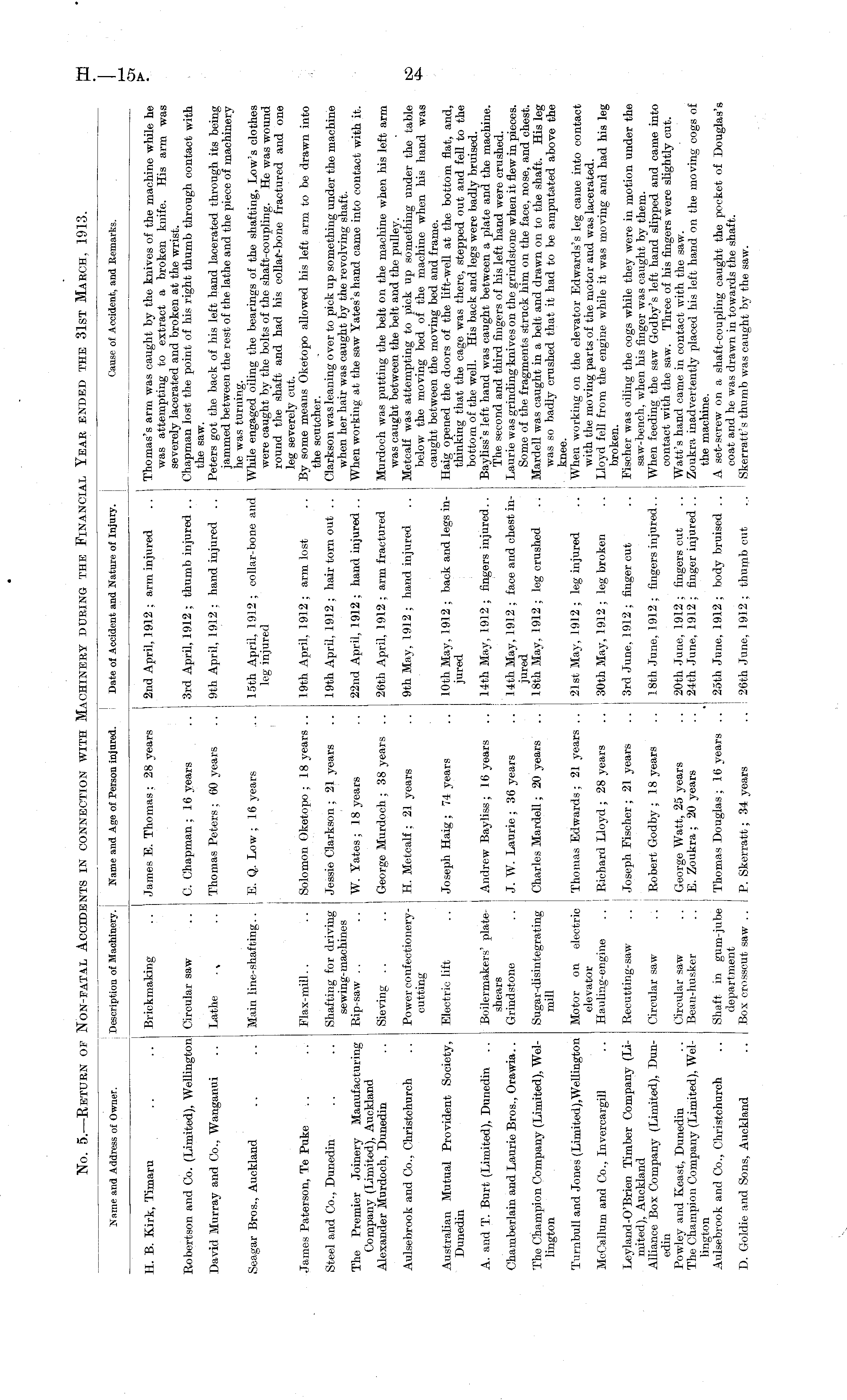 Name and Address of Owner. Description of Machinery. Name and Age of Person injured. Date of Accident and Nature of Injury. Cause of Accident, and Remarks. H. B. Kirk, Timaru Brickmaking James E. Thomas ; 28 years 2nd April, 1912 ; arm injured .. Thomas's arm was caught by the knives of the machine while he was attempting to extract a broken knife. His arm was severely lacerated and broken at the wrist. 3rd April, 1912 ; thumb injured .. Chapman lost the point of his right thumb through contact with the saw. 9th April. 1912 ; hand injured .. Peters got the back of his left hand lacerated through its being jammed between the rest of the lathe and the piece of machinery he was turning. loth April, 1912 ; collar-bone and While engaged oiling the bearings of the shafting, Low's clothes leg injured were caught by the bolts of the shaft-coupling. He was wound round the shaft and had his collaf-bone fractured and one leg severely cut. 19th April, 1912 ; arm lost .. By some means Oketopo allowed his left arm to be drawn into the scutcher. 19th April, 1912 ; hair torn out .. Clarkson was leaning over to pick up something under the machine when her hair was caught by the revolving shaft. 22nd April, 1912 ; hand injured .. When working at the saw Yates's hand came into contact with it. Robertson and Co. (Limited), Wellington Circular saw C. Chapman ; 16 years David Murray and Co., Wanganui Lathe ., Thomas Peters ; 60 years .. | Seagar Bros., Auckland Main line-shafting. . E. Q. Low; 16 years .. | James Paterson, Te Puke Flax-mill Solomon Oketopo ; 1 8 years .. Steel and Co., Dunedin Shafting for driving sewing-machines Rip-saw Jessie Clarkson ; 21 vears .. ! The Premier Joinery Manufacturing Company (Limited), Auckland Alexander Murdoch, Dunedin W. Yates ; 18 years George Murdoch ; 38 years .. 26th April, 1912 ; arm fractured Murdoch was putting the belt on the machine when his left arm was caught between the belt and the pulley. 9th May, 1912 ; hand injured .. Metcalf was attempting to pick up something under the table below the moving bed of the machine when his hand was caught between the moving bed and frame. 10th May, 1912 ; back and legs in- j Haig opened the doors of the lift-well at the bottom flat, and, jured thinking that the cage was there, stepped out and fell to the bottom of the well. His back and legs were badly bruised. I 14th May, 1912 ; fingers injured.. ; Bayliss's left hand was caught between a plate and the machine. The second and third fingers of his left hand were crushed. ; 14th May, 1912 ; face and chest in- ■ Laurie was grinding knives on the grindstone when it flew in pieces. jured Some of the fragments struck him on the face, nose, and chest. 18th May, 1912 ; leg crushed .. \ Mardell was caught in a belt and drawn on to the shaft. His leg was so badly crushed that it had to be amputated above the knee. I 21st May, 1912 ; leg injured .. When working on the elevator Edwards's leg came into contact with the moving parts of the motor and was lacerated. 30th May, 1912 ; leg broken .. ! Lloyd fell from the engine while it was moving and had his leg broken, i 3rd June. 1912 ; finger cut .. Fischer was oiling the cogs while they were in motion under the saw- bench, when his finger was caught by them. 18th June, 1912 ; fingers injured.. ! When feeding the saw Godby's left hand slipped and came into contact with the saw. Three of his fingers were slightly cut. 20th June, 1912 ; fingers cut .. j Watt's hand came in contact with the saw. 24th June, 1912 ; finger injured .. Zoukra inadvertently placed his left hand on the moving cogs of the machine. 25th June, 1912 ; body bruised .. A set-screw on a shaft-coupling caught the pocket of Douglas's coat and he was drawn in towards the shaft. ! 26th June, 1912 ; thumb cut ... [ Skerratt's thumb was caught by the saw. Sieving Aulsebrook and Co., Christchurch Power confectionerycutting H. Metcalf ; 21 years Australian Mutual Provident Society, Dunedin Electric lift Joseph Haig ; 74 years A. and T. Burt (Limited), Dunedin . . Boilermakers' plateshears Grindstone Andrew Bayliss ; 16 years .. | Chamberlain and Laurie Bros., Orawia.. J. W. Laurie ; 36 years .. ; The Champion Company (Limited), Wellington Sugar-disintegrating mill Charles Mardell; 20 years Tumbull and Jones (Limited),Wellington Motor on electric elevator Haulmg-engine . . j Thomas Edwards; 21 years .. i McCallum and Co., Invercargill I Richard Lloyd ; 28 years Leyland-O'Brien Timber Company (Limited), Auckland Alliance Box Company (Limited), Dunedin Powley and Keast, Dunedin The Champion Company (Limited), Wellington Aulsebrook and Co., Christchurch Recutting-saw Circular saw Circular saw Bean-husker Joseph Fischer ; 21 years Robert Godby ; 18 years I George Watt, 25 years j E. Zoukra ; 20 years Shaft in gum-jube department Box crosscut saw . . . Thomas Douglas ; 16 years .. P. Skerratt; 34 years D. Goldie and Sons, Auckland