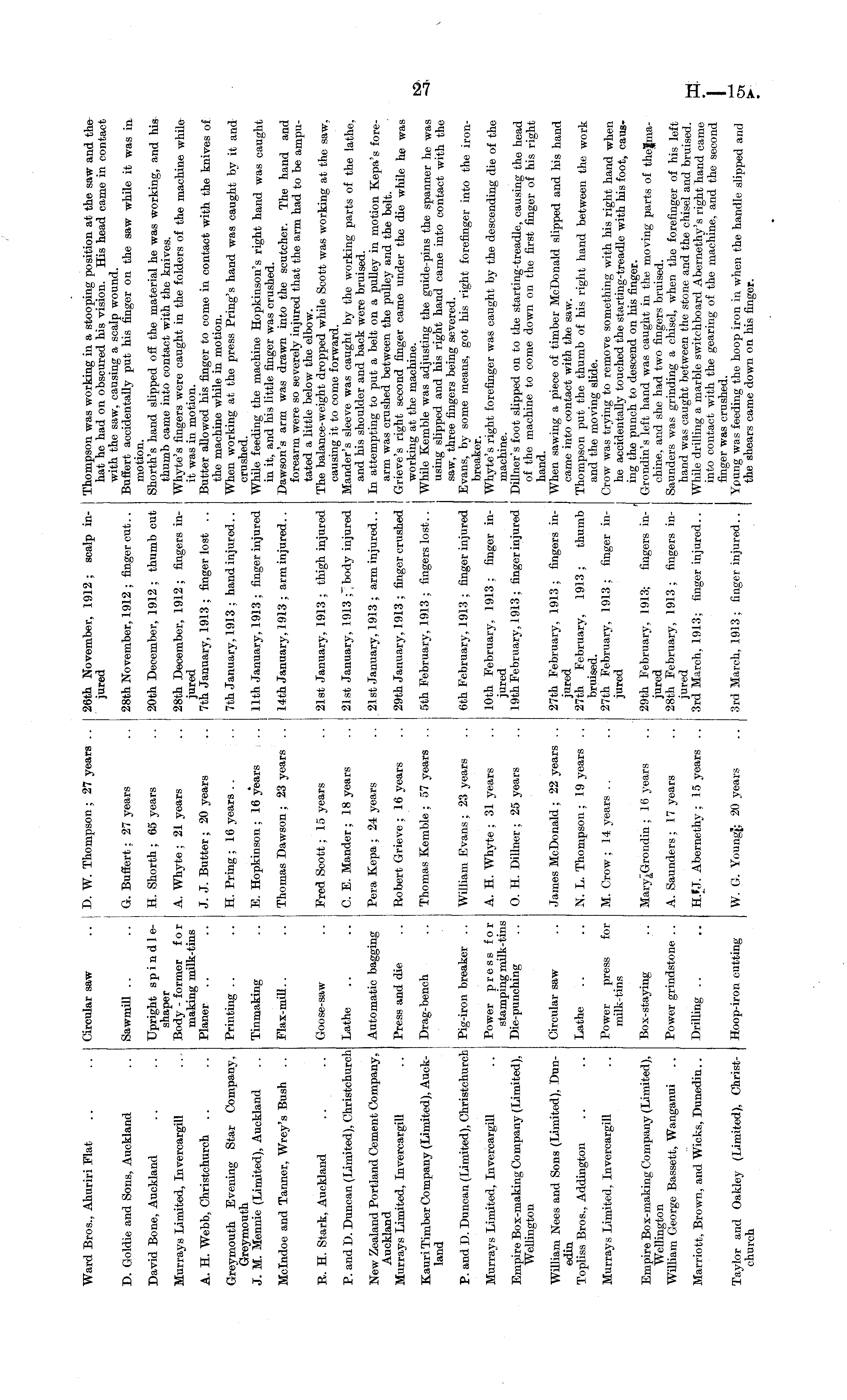 Ward Bros., Ahuriri Flat Circular saw D. W. Thompson ; 27 years .. 26th November, 1912 ; scalp injured Thompson was working in a stooping position at the saw and the hat he had on obscured his vision. His head came in contact with the saw, causing a scalp wound. Buffert accidentally put his finger on the saw while it was in motion. Shorth's hand slipped off the material he was working, and his thumb came into contact with the knives. Whyte' s fingers were caught in the folders of the machine while it was in motion. Butter allowed his finger to come in contact with the knives of the machine while in motion. When working at the press Pring's hand was caught by it and crushed. While feeding the machine Hopkinson's right hand was caught in it, and his little finger was crushed. Dawson's arm was drawn into the scutcher. The hand and forearm were so severely injured that the arm had to be amputated a little below the elbow. The balance-weight dropped while Scott was working at the saw. causing it to come forward. Mander's sleeve was caught by the working parts of the lathe, and his shoulder and back were bruised. In attempting to put a belt on a pulley in motion Kepa's forearm was crushed between the pulley and the belt. Grieve's right second finger came under the die while he was working at the machine. While Kemble was adjusting the guide-pins the spanner he was using slipped and his right hand came into contact with the saw, three fingers being severed. Evans, by some means, got his right forefinger into the ironbreaker. Whyte's right forefinger was caught by the descending die of the machine. Dillner's foot slipped on to the starting-treadle, causing the head of the machine to come down on the first finger of his right hand. When sawing a piece of timber McDonald slipped and his hand came into contact with the saw. Thompson put the thumb of his right hand between the work and the moving slide. Crow was trying to remove something with his right hand when he accidentally touched the starting-treadle with his foot, causing the punch to descend on his finger. Grondin's left hand was caught in the moving parts of the|machine, and she had two fingers bruised. Saunders was grinding a chisel, when the forefinger of his left hand was caught between the stone and the chisel and bruised. While drilling a marble switchboard Abernethy's right hand came into contact with the gearing of the machine, and the second finger was crushed. Ypung was feeding the hoop iron in when the handle slipped and the shears came down on his finger. D. Goldie and Sons, Auckland Sawmill G. BufEert: 27 years 28th November, 1912 ; finger cut.. David Bone, Auckland Murrays Limited, Invercargill Upright spindleshaper Body - former for making milk-tins Planer H. Shorth ; 65 years A. Whyte ; 21 years 20th December, 1912 ; thumb cut 28th December, 1912 ; ringers injured 7th January, 1913 ; finger lost .. A. H. Webb, Christchurch J. J. Butter ; 20 years Greymouth Evening Star Company, Greymouth J. M. Mennie (Limited), Auckland Printing H. Pring ; 16 years .. 7th January, 1913 ; hand injured.. Tinmaking E. Hopkinson ; 16 years 11th January, 1913 ; finger injured Mclndoe and Tanner, Wrey's Bush .. Flax- mill.. Thomas Dawson ; 23 years .. 14th January, 1913 ; arm injured.. B. H. Stark, Auckland Goose-saw Fred Scott; 15 years 21st January, 1913 ; thigh injured P. and D. Duncan (Limited), Christchurch Lathe C. E. Mander ; 18 years 21st January, 1913 ; body injured New Zealand Portland Cement Company, Auckland Murrays Limited, Invercargill Automatic bagging Pera Kepa ; 24 years 21st January, 1913 ; arm injured.. Press and die Robert Grieve ; 16 years 29th January, 1913 ; finger crushed Kauri Timber Company (Limited), Auckland Drag-bench Thomas Kemble ; 57 years .. 5th February, 1913 ; fingers lost.. P. and D. Duncan (Limited), Christchurcfc Pig-iron breaker .. William Evans ; 23 years 6th February, 1913 ; finger injured Murrays Limited, Invercargill Empire Box-making Company (Limited), Wellington Power press for stamping milk- tins Die-punching A. H. Whyte ; 31 years O. H. Dillner ; 25 years 10th February, 1913 ; finger injured 19th February, 1913; finger injured William Nees and Sons (Limited), Dunedin Topliss Bros., Addington Circular saw James McDonald ; 22 years .. 27th February, 1913 ; fingers injured 27th February, 1913; thumb bruised. 27th February, 1913; finger injured Lathe N. L. Thompson ; 19 years .. Murrays Limited, Invercargill Power press for milk-tins M. Crow ; 14 years .. Empire Box-making Company (Limited), Wellington William George Bassett, Wanganui Box-staying ; 16 years 29th February, 1913; fingers injured 28th February, 1913 ; fingers injured 3rd March, 1913; finger injured.. Power grindstone .. A. Saunders ; 17 years Marriott, Brown, and Wicks, Dunedin.. Drilling H.fJ. Abernethy ; 15 years .. Taylor and Oakley (Limited), Christchurch Hoop-iron cutting W. G. YoungJ; 20 years 3rd March, 1913 ; finger injured..