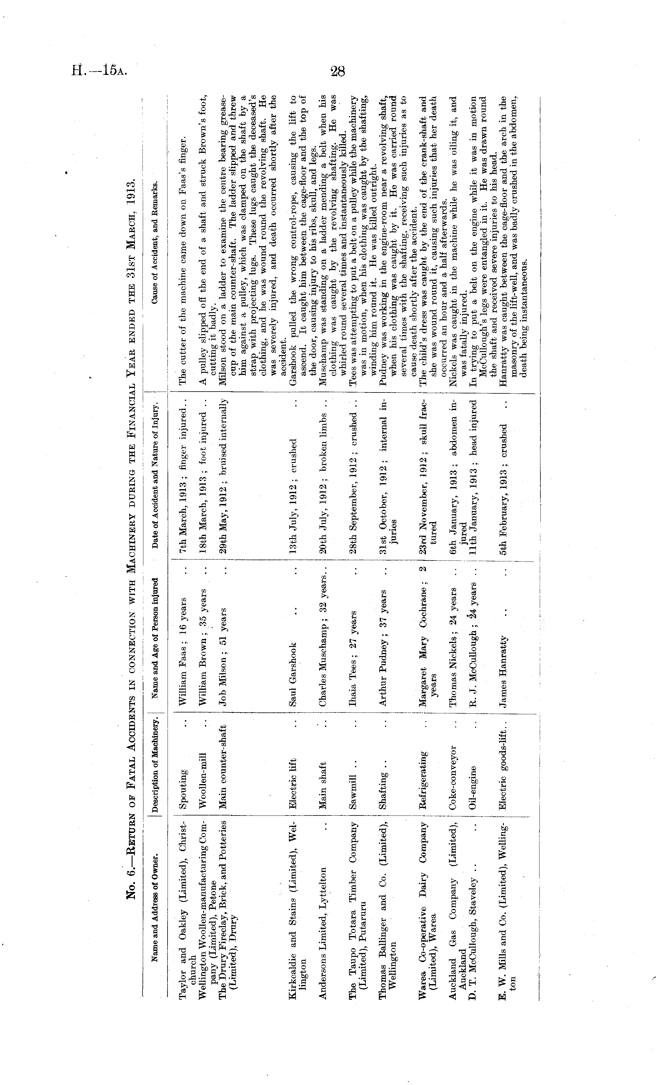 Name and Address of Owner. Description of Machinery. Name and Age of Person injured Date of Accident and Nature of Injury. Cause of Accident, and Remarks. Taylor and Oakley (Limited), Christchurch Wellington Woollen-manufacturing Company (Limited), Petone The Drury Fireclay, Brick, and Potteries (Limited), Drury Spouting William Faas ; 16 years 7th March, 1913 ; finger injured.. The cutter of the machine came down on Faas's finger. Kirkcaldie and Stains (Limited), Wellington Andersons Limited, Lyttelton The Taupo Totara Timber Company (Limited), Putaruru Woollen-mill Main counter-shaft Electric lift Main shaft Sawmill William Brown ; 35 years Job Milson ; 51 years Saul Garshook Charles Muschamp ; 32 years.. ! Ihaia Tees ; 27 years 18th March, 1913 ; foot injured .. 29th May, 1912 ; bruised internally 13th July, 1912 ; crushed 20th July, 1912 ; broken limbs .. 28th September, 1912 ; crushed . . A pulley slipped ofi the end of a shaft and struck Brown's foot, cutting it badly. Milson stood on a ladder to examine the centre bearing greasecup of the main counter-shaft. The ladder slipped and threw him against a pulley, which was clamped on the shaft by a strap with projecting lugs. These lugs caught the deceased's clothing, and he was wound round the revolving shaft. He was severely injured, and death occurred shortly after the accident. Garshook pulled the wrong control-rope, causing the lift to ascend. It caught him between the cage-floor and the top of the door, causing injury to his ribs, skull, and legs. Muschamp was standing on a ladder mending a belt when his clothing was caught by the revolving shafting. He was whirled round several times and instantaneously killed. Tees was attempting to put a belt on a pulley while the machinery was in motion, when his clothing was caught by the shafting, winding him round it. He was killed outright. Pudney was working in the engine-room near a revolving shaft, when his clothing was caught by it. He was carried round several times with the shafting, receiving such injuries as to cause death shortly after the accident. The child's dress was caught by the end of the crank-shaft and she was wound round it, causing such injuries that her death occurred an hour and a half afterwards. Nickels was caught in the machine while he was oiling it, and was fatally injured. In trying to put a belt on the engine while it was in motion McCullough' s legs were entangled in it. He was drawn round the shaft and received severe injuries to his head. Hanratty was caught between the cage-floor and the arch in the masonry of the lift-well, and was badly crushed in the abdomen, death being instantaneous. Thomas Ballinger and Co. (Limited), Wellington Shafting Arthur Pudney ; 37 years 31st October, 1912; internal injuries Warea Co-operative Dairy Company (Limited), Warea Refrigerating Margaret Mary Cochrane ; 2 years 23rd November, 1912 ; skull fractured Auckland Gas Company (Limited), Auckland D. T. McCullough, Staveley Coke-conveyor Thomas Nickels ; 24 years .. j 6th January, 1913 ; abdomen injured 11th January, 1913 ; head injured Oil-engine R. J. McCullough ; 24 years .. ! E. W. Mills and Co. (Limited), Wellington Electric goods-lift. . James Hanratty .. 5th February, 1913 ; crushed