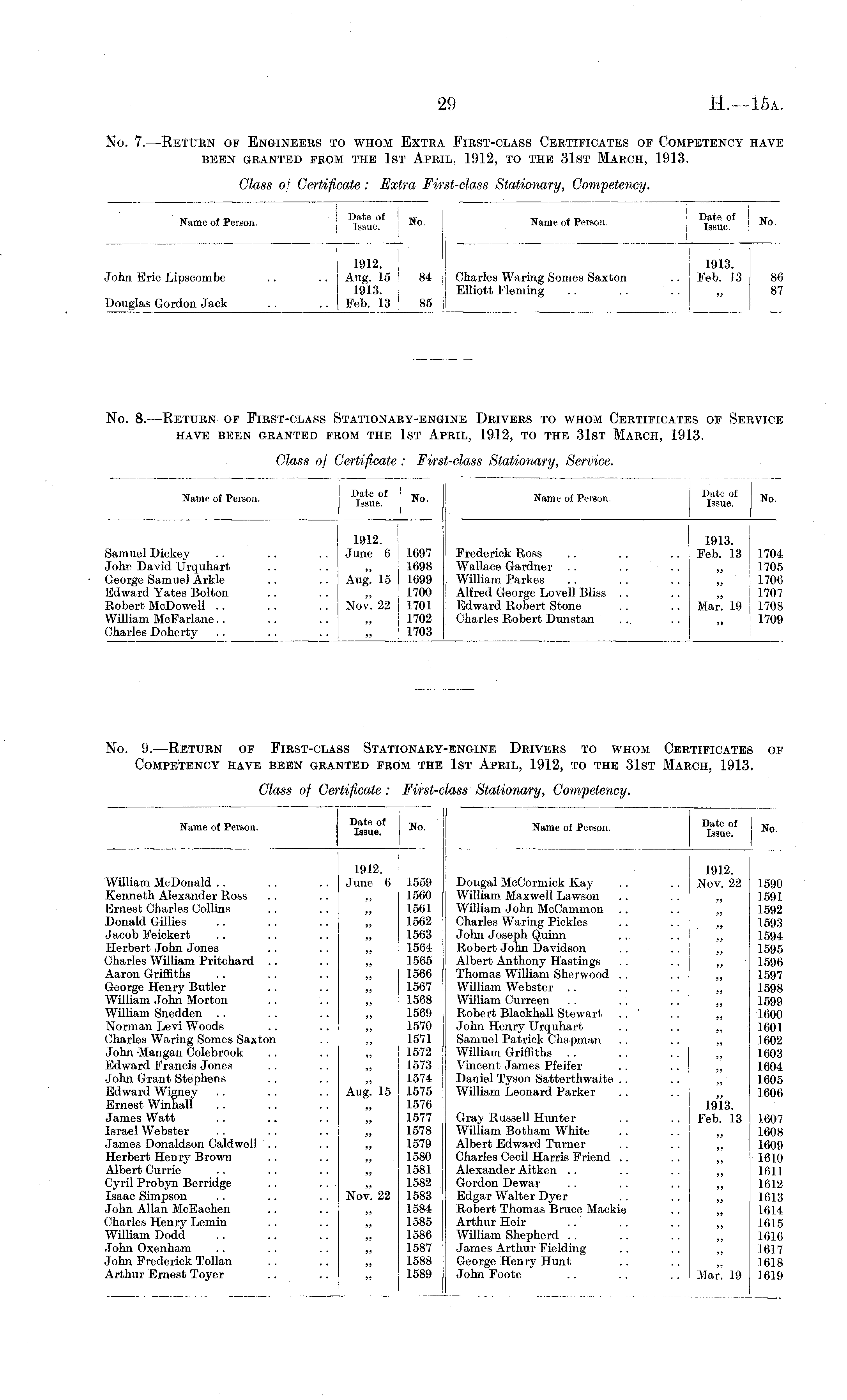 No. 7.—Return of Engineers to whom Extra First-class Certificates of Competency have been granted from the 1st April, 1912, to the 31st March, 1913. Class of Certificate: Extra First-class Stationary, Competency.