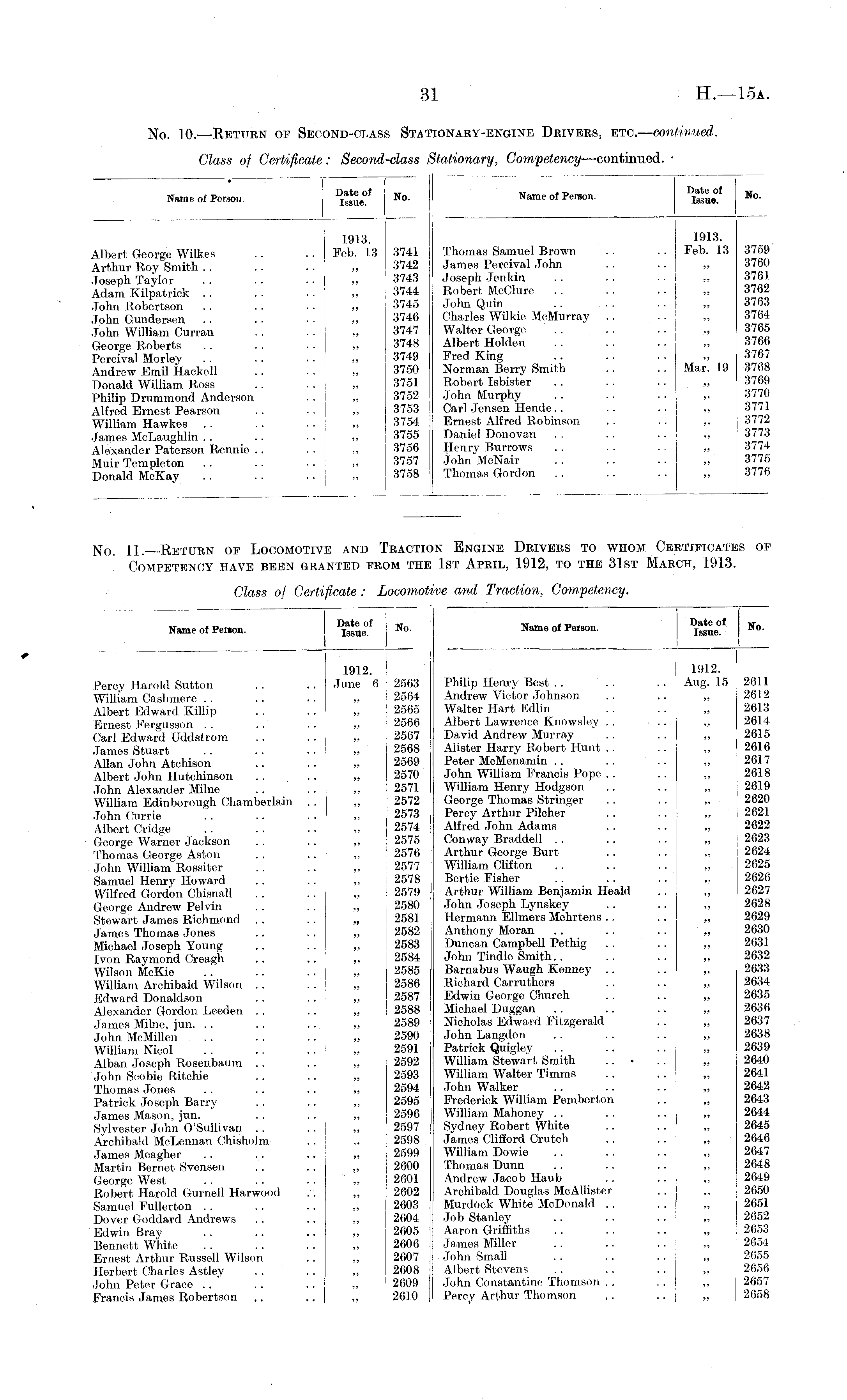 No. 11.-Return of Locomotive and Traction Engine Drivers to whom Certificates of Competency have been granted from the 1st April, 1912, to the 31st March, 1913. Class of Certificate: Locomotive and Traction, Competency.