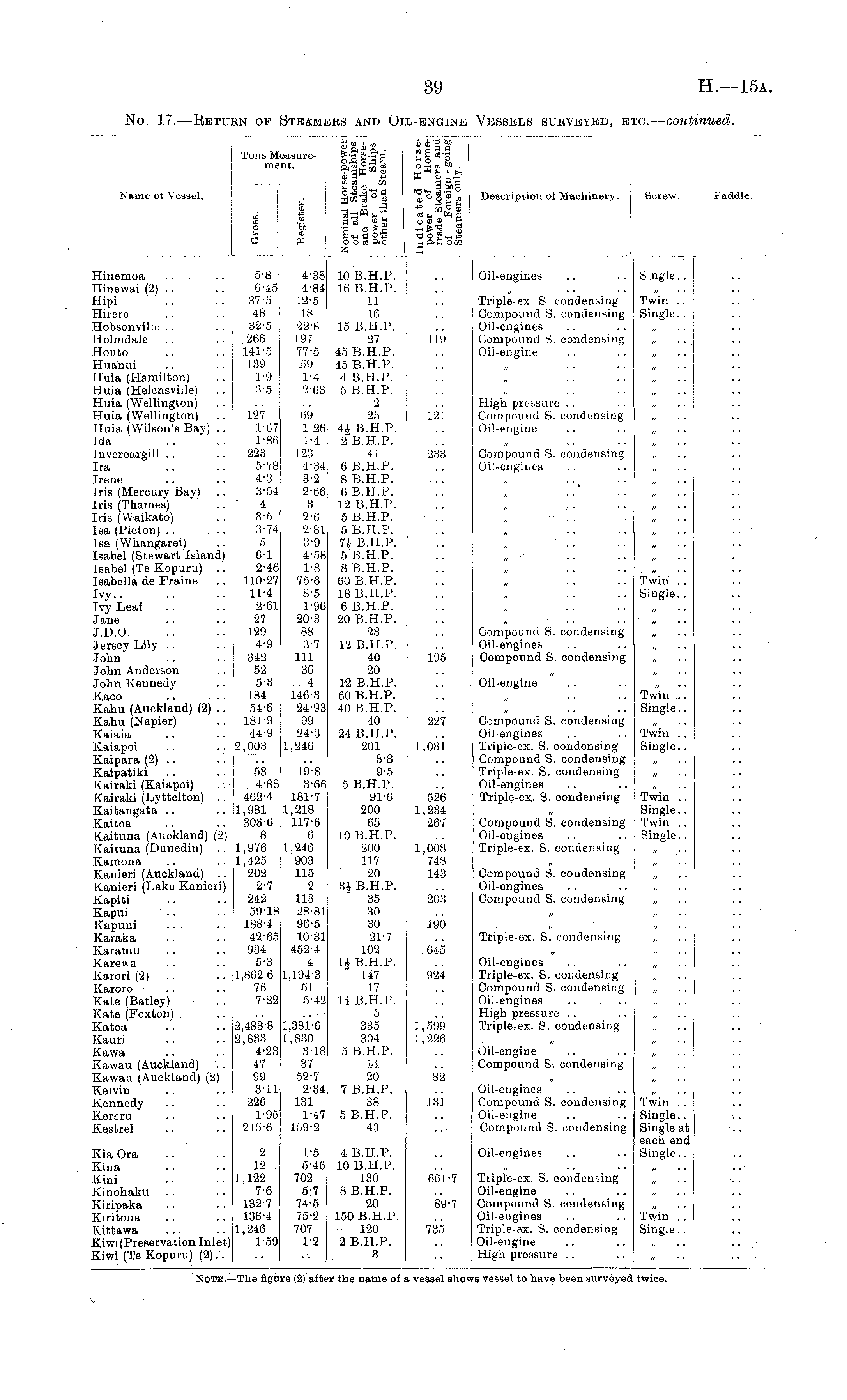 I Name ot Vessel. I Tons Mi me o [easure;nt. o 'Sβ Cβ <6 Cβ OOdftO M M S 'J? j 'S'o o'p a> Description of Machinery. sis i s ad occ Screw. Paddle. Hinemoa .. .. I Hinewai (2) .. Hipi Hire re Hobsonville . . Holmdale .. Houto . . Huauui Huia (Hamilton) Huia (Helensville) Huia (Wellington) Huia (Wellington) Huia (Wilson's Bay) .. Ida Invercargill Ira .. Irene .. Iris (Mercury Bay) Iris (Thames) Iris (Waikato) Isa (Picton) .. Isa (Whangarei) Isabel (Stewart Island) Isabel (Tβ Kopuru) .. Isabella de Frame Ivy.. Ivy Leaf Jane J.D.O. Jersey Lily John John Anderson John Kennedy Kaeo Kahu (Auckland) (2) .. Kahu (Napier) Kaiaia Kaiapoi Kaipara (2) .. Kaipatiki Kairaki (Kaiapoi) Kairaki (Lyttelton) .. Kaitangata Kaitoa Kaituna (Auokland) (2) Kaituna (Dunedin) .. Kamona Kanieri (Auckland) .. Kanieri (Lake Kanieri) Kapiti Kapui Kapuni Karaka Karamu .. Karen a Karori (2) Karoro .. Kate (Batley) Kate (Foxton) Katoa Kauri Kawa .. Kawau (Auckland) Kawau (Auckland) (2) Kelvin .. Kennedy Kereru Kestrel 5-8 6-45 37-5 48 : 32-5 '266 141'5 139 1-9 3-5 127 167 1-86 223 5-78 4-3 3-54 4 3-5 3-74 5 6-1 2'46 : 110-27 11-4 2-61 27 129 4-9 342 52 5-3 184 54-6 181-9 44-9 J2,003 53 4-88 462-4 1,981 303-6 8 '1,976 1,425 202 2-7 242 59-18 188-4 42-65 934 5-3 1,862-6 76 7-22 2,488-8 2,833 4-23 47 99 3-11 226 1-95 245-6 4-38 4-84 12-5 ! 18 22-8 197 77-5 59 1-4 2-63 10 B.H.P. 16B.H.P. 11 16 15 B.H.P. 27 45 B.H.P. 45 B.H.P. 4 B.H.P. 5 B.H.P. 2 25 B.H.P. 2"B.H.P. 41 6 B.H.P. 8 B.H.P. 6 B.H.P. 12 B.H.P. 5 B.H.P. 5 B.H.P. 7J B.H.P. 5 B.H.P. 8 B.H.P. 60 B.H.P. 18 B.H.P. 6 B.H.P. 20 B.H.P. 28 12 B.H.P. 40 20 12 B.H.P. 60 B.H.P. 40 B.H.P. 40 24 B.H.P. 201 3-8 9-5 5 B.H.P. 91-6 200 65 10 B.H.P. 200 117 20 3J B.H.P. 35 30 30 21-7 102 14 B.H.P. 147 17 14 B.H.P. 5 335 304. 5 B.H.P. 14 20 7 B.H.P. 38 5 B.H.P. 43 4 B.H.P. 10 B.H.P. 130 8 B.H.P. 20 150 B.H.P. 120 2 B.H.P. 3 Oil-engines j Triple-ex. S. condensing I Compound S. condensing : 1 Oil-engines .. .,. 119 Compound S. condensing Oil-engine High pressure .. 121 Compound S. condensing I Oil-engine 233 Compound S. condensing Oil-engines Compound S. condensing Oil-engines 195 Compound S. condensing Oil-engine 227 Compound S. condensing Oil-engines 1,031 Triple-ex. S. condensing Compound S. condensing Triple-ex. S. condensing Oil-engines 526 Triple-ex. S. condensing 1,234 267 Compound S. condensing Oil-engines 1,008 Triple-ex. S. condensing 748 143 Compound S. condensing Oil-engines 203 Compound S. condensing 190 Triple-ex. S. condensing 645 Oil-engines 924 Triple-ex. S. condensing Compound S. condensing Oil-engines High pressure j, 599 Triple-ex. S. condensing 1,226 Oil-engine Compound S. condensing 82 Oil-engines 131 Compound S. condensing Oil-engine Compound S. condensing j Oil-engines 661'7 J Triple-ex. S. condensing i Oil-engine 89-7 Compound S. condensing I Oil-engires 735 j Triple-ex. S. condensing J Oil-engine ( High pressure .. Single.. Twin .. Single.. " 1 i .■; Twin .. Single.. Twin .. Single.. Twin .. I Sirjgle.. « Twin .. Single.. Twin .. ! Single.. " " Twin .. Single., j Single at each end Single.. Twin .. Single.. .. 69 1-26 i 1-4 123 i 4-34 3-2 2-66 3 2-6 2-81 3-9 4-58 i 1-8 ' 75-6 8-5 1-96 20-3 88 3-7 111 36 4 146-3 24-93 99 24-3 1,246 121 233 .195 227 1,031 19-8 ) 3-66 181-7 1,218 117-6 6 1,246 903 115 ! 2 i 113 ! 28-81 96-5 i 10-31 452-4 4 1,1943 51 ! 5-42 526 1,234 267 1,008 748 143 203 190 645 924 1,381-6 1,830 I 318 37 52-7 2-34 131 1-47 159-2 I j, 599 1,226 82 131 Kia Ora Kma Kini Kinohaku Kiripaka Kiritona .. .. ! Kittawa Kiwi (Preservation Inlet) Kiwi (Te Kopuru) (2).. 2 12 1,122 7-6 132-7 136-4 11,246 ) 1-59 1-5 5-46 702 5-7 i 74-5 ! 75-2 ! 707 1-2 661-7 89-7 735 Note.—The fii jure (2) after the name of a vessel shows vessel to have been Burvo; r ed twice.