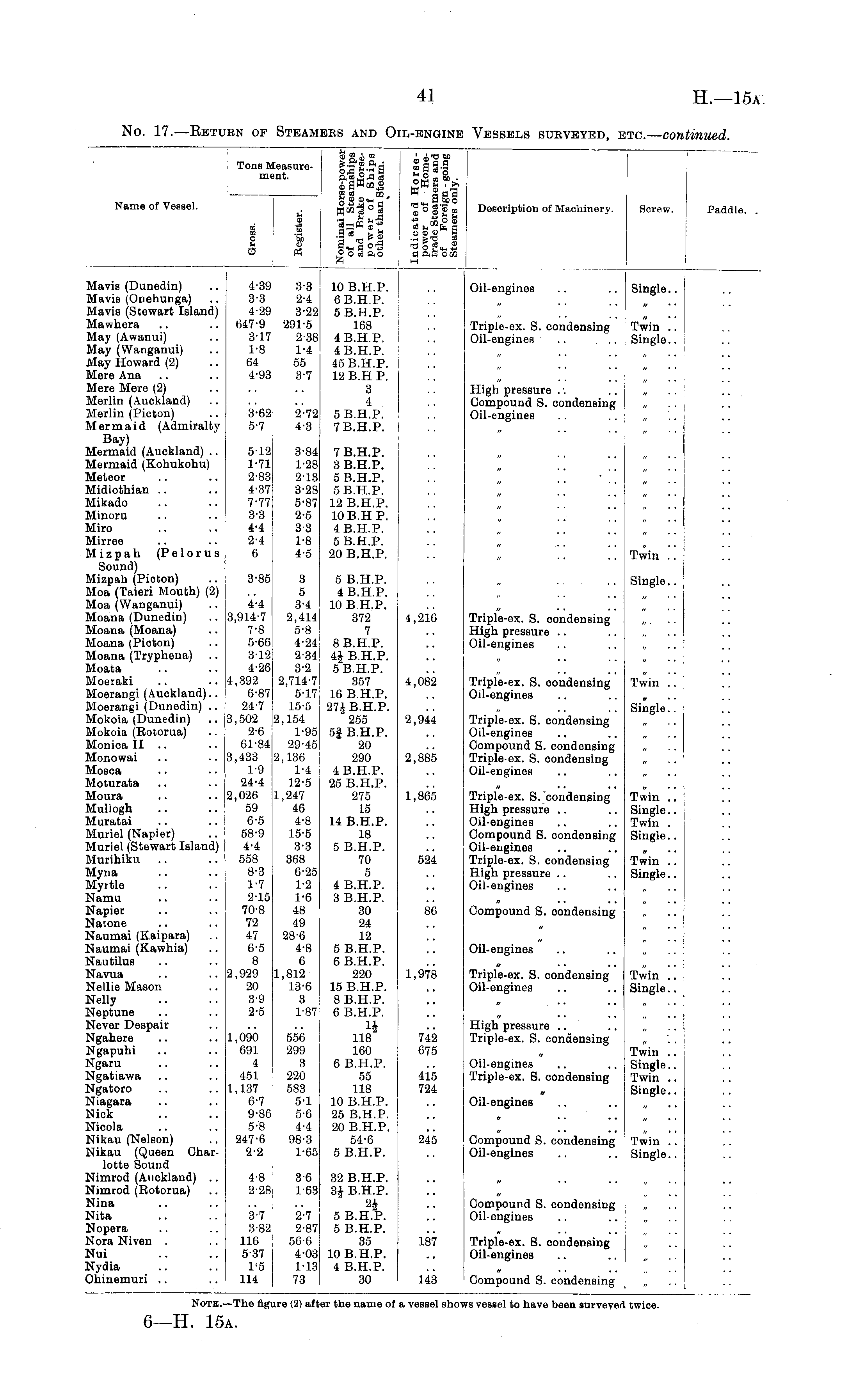 Name of Vessel. Tons I mi [easuremt. I If If J i J J S^ S* 5, i w Sao |*1o| o o Cβ ao a &£ oco X j )H Description of Machinery. Screw, i Paddle. . 0 Mavis (Dunedin) Mavis (Onehunga) Mavis (Stewart Island) Mawhera May (Awanui) May (Wanganui) May Howard (2) Mere Ana Mere Mere (2) Merlin (Auckland) Merlin (Pioton) Mermaid (Admiralty Bay) Mermaid (Auckland) .. Mermaid (Kohukohu) Meteor Midlothian Mikado Minoru Miro Mirree Mizpah (Pelorus Sound) Mizpah (Pioton) Moa (Taieri Mouth) (2) Moa (Wanganui) Moana (Dunedin) Moana (Moana) Moana (Picton) Moana (Trypheua) Moata Moeraki Moerangi (Auokland).. Moerangi (Dunedin) .. Mokoia (Dunedin) Mokoia (Rotorua) Monica II Monowai 4-39 3-3 4-29 647-9 3-17 1-8 64 4-93 3-62; 5-7 5-12 1-71 2-83 4-37 7-77 3-3 4-4 2-4 6 3-3 2-4 3-22 291-5 238 1-4 55 3-7 2-72 4-3 3-84 1-28 2-13 3-28 5-87 2-5 33 1-8 4-5 10 B.H.P. 6B.H.P. 5 B.H.P. 168 4 B.H.P. 4 B.H.P. 45 B.H.P. 12B.HP. 3 4 5 B.H.P. 7 B.H.P. 7 B.H.P. 3 B.H.P. 5 B.H.P. 5 B.H.P. 12 B.H.P. 10B.HP. 4 B.H.P. 5 B.H.P. 20 B.H.P. Oil-engines Triple-ex. S. condensing Oil-engines High pressure Compound S. condeneing Oil-engines Single.. Twin .. Single.. Twin .. 3-85 3 5 3-4 2,414 5-8 4-24 2-34 3-2 2,714-7 5-17 15-5 2,154 1-95 29-45 2,136 1-4 12-5 1,247 46 4-8 15-5 3-3 368 6-25 1-2 I-β 48 49 28-6 4-8 6 1,812 18-6 3 1-87 5 B.H.P. 4 B.H.P. 10 B.H.P. 372 7 8 B.H.P. 4JBH.P. 5 B.H.P. 357 16 B.H.P. 27J B.H.P. 255 5| B.H.P. 20 290 4 B.H.P. 25 B.H.P. 275 15 14 B.H.P. 18 5 B.H.P. 70 5 4 B.H.P. 3 B.H.P. 30 24 12 5 B.H.P. 6 B.H.P. 220 15 B.H.P. 8 B.H.P. 6 B.H.P. 14 118 160 6 B.H.P. 55 118 10 B.H.P. 25 B.H.P. 20 B.H.P. 54-6 5 B.H.P. Single.. Mosca Moturata Moura Mullogh Muratai Muriel (Napier) Muriel (Stewart Island) Murihiku Myna Myrtle Namu Napier Naione Naumai (Kaipara) Naumai (Kawhia) Nautilus Navua Nellie Mason Nelly Neptune Never Despair Ngahere Ngapuhi Ngaru Ngatiawa Ngatoro Niagara Nick Nicola Nikau (Nelson) Nikau (Queen Charlotte Sound Nimrod (Auckland) .. Nimrod (Rotorua) Nina Nita Nopera Nora Niven . Nui Nydia Ohinemuri .. 4-4 3,914-7 7-8 5-66 312 4-26 4,392 6-87 24'7 3,502 2-6 61-84 3,433 1-9 24-4 2,026 59 6-5 58-9 4-4 558 8-3 1-7 2-15 70-8 72 47 6-5 8 2,929 20 3-9 2-5 4,216 4,082 2,944 2,885 1,865 Triple-ex. S. oondensing High pressure Oil-engines Triple-ex. S. condensing Oil-engines Triple-ex. S. condensing Oil-engines Compound S. condensing Triple-ex. S. condensing Oil-engines Triple-ex. S. "condensing High pressure Oilengines Compound S. condensing Oil-engines Triple-ex. S. condensing High pressure Oil-engines Twin .. Single.. Twin .. Single.. Twin . Single.. 524 Twin .. Single.. 86 Compound S. oondensing Oil-engines 1,978 Triple-ex. S. condensing Oil-engines Twin .. Single.. 1,090 691 4 451 1,137 6-7 9-86 5-8 247-6 2-2 556 i 299 3 220 583 5-1 5-6 4-4 98-3 1-65 742 675 High pressure Triple-ex. S. condensing Twin .. Single.. Twin .. Single.. 415 724 Oil-engines Triple-ex. S. condensing Oil-engines 245 Compound S. condensing Oil-engines Twin .. Single.. 4-8 2-28 36 163 32 B.H.P. 3J B.H.P. 24 5 B.H.P. 5 B.H.P. 35 10 B.H.P. 4 B.H.P. 30 3-7 3-82 116 5-37 1'5 114 2-7 2-87 56-6 4-03 1-13 73 Compound S. condensing Oil-engines 187 Triple-ex. S. condensing Oil-engines 143 Compound S. condensing Note.—The figure (2) after the name of a vessel sho •a vessel to have been surveved twice.