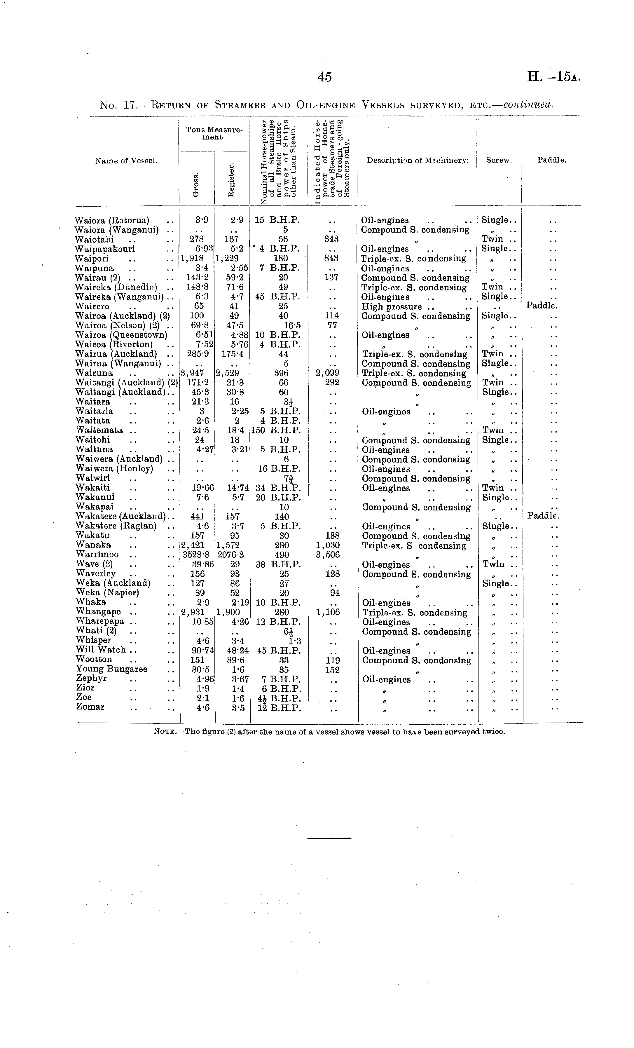 Name of Vessel. TonsM me [easure)nt. If3 go =6 ao pi 5?g~s a &is oft Description of Machinery: Screw. Paddle. p 5 Waiora (Rotorua) Waiora (Wanganui) .. Waiotahi Waipapakouri Waipori Waipuna Wairau (2) .. Waireka (Dunedin) .. Waireka (Wanganui) .. Wairere Wairoa (Auckland) (2) Wairoa (Nelson) (2) .. Wairoa (Queenstown) Wairoa (Riverton) Wairua (Auckland) .. Wairua (Wanganui) .. Wairuna Waitangi (Auckland) (2) Waitangi (Auckland).. Waitara Waitaria Waitata Waitemata Waitohi Waituna Waiwera (Auckland) .. Waiwera (Henley) Waiwiri Wakaiti Wakanui Wakapai Wakatere (Auckland).. Wakatere (Raglan) Wakatu Wanaka Warrimoo Wave (2) Waverley Weka (Auckland) Weka (Napier) Whaka Whangape .. Wharepapa Whati (2) .. Whisper Will Watch .. Wootton Young Bungaree Zephyr Zior Zoe Zomar 3-9 278 6-93 1,918 3-4 143-2 148-8 6-3 65 100 69-8 6-51 7-52 2859 3,947 171-2 45-3 21-3 3 2-6 24-5 24 4-27 2.Q 167 5-2 1,229 2-55 59-2 71-6 4-7 41 49 47-5 4-88 5-76 175-4 2,529 21-3 30-8 16 2-25 2 18-4 18 3-21 15 B.H.P. 5 56 • 4 B.H.P. 180 7 B.H.P. 20 49 45 B.H.P. 25 40 16-5 10 B.H.P. 4 B.H.P. 44 5 396 66 60 3i 5 B.H.P. 4 B.H.P. 150 B.H.P. 10 5 B.H.P. 6 16 B.H.P. 7| 34 B.H.P. 20 B.H.P. 10 140 5 B.H.P. 30 280 490 38 B.H.P. 25 27 20 10 B.H.P. 280 12 B.H.P. 6i 1-3 45 B.H.P. 33 35 7 B.H.P. 6 B.H.P. 4J B.H.P. 12 B.H.P. 343 843 137 114 77 2,099 292 Oil-engines Compound B. condensing Oil-engines Triple-ex. S. condensing Oil-engiaes Compound S. condensing Triple-ex. 8. condensing Oil-engines High pressure Compound S. condensing Oil-engines Triple-ex, S. condensing Compound S. condensing Triple-ex. S. oondensing Compound S. oondensing w Oil-engines Compound S. condensing Oil-engines Compound S. condensing Oil-engines Compound S. condensing Oil-engines Single.. Twin .. Single.. Twin .. Single.. Single.. Twin .. Single.. Twin .. Single.. Twin .. Single.. Paddle. 19-66 7-6 14-74 5-7 Twin .. Single.. 441 4-6 157 2,421 352S-8 39-86 156 127 89 2-9 2,931 10-85 157 3-7 95 1,572 2076 3 29 93 86 52 2-19 1,900 4-26 Compound S. condensing Paddle'. 138 1,030 3,506 Oil-engines Compound S. oondensing Triple-ex. S. condensing Single.. Oil-engines Compound S. condensing Twin .. 128 Single.. 94 1,106 Oil-engines Triple-ex. S. condensing Oil-engines Compound S. condensing 4-6 90-74 151 80-5 4-96 1-9 2-1 4-6 3-4 48-24 89-6 1-6 3-67 1-4 1-6 3-5 119 152 Oil-engines Compound S. condensing Oil-engines Note.—The fl| jure afti )i- the name of a vessel shows vessel to have been surve; ed twice.