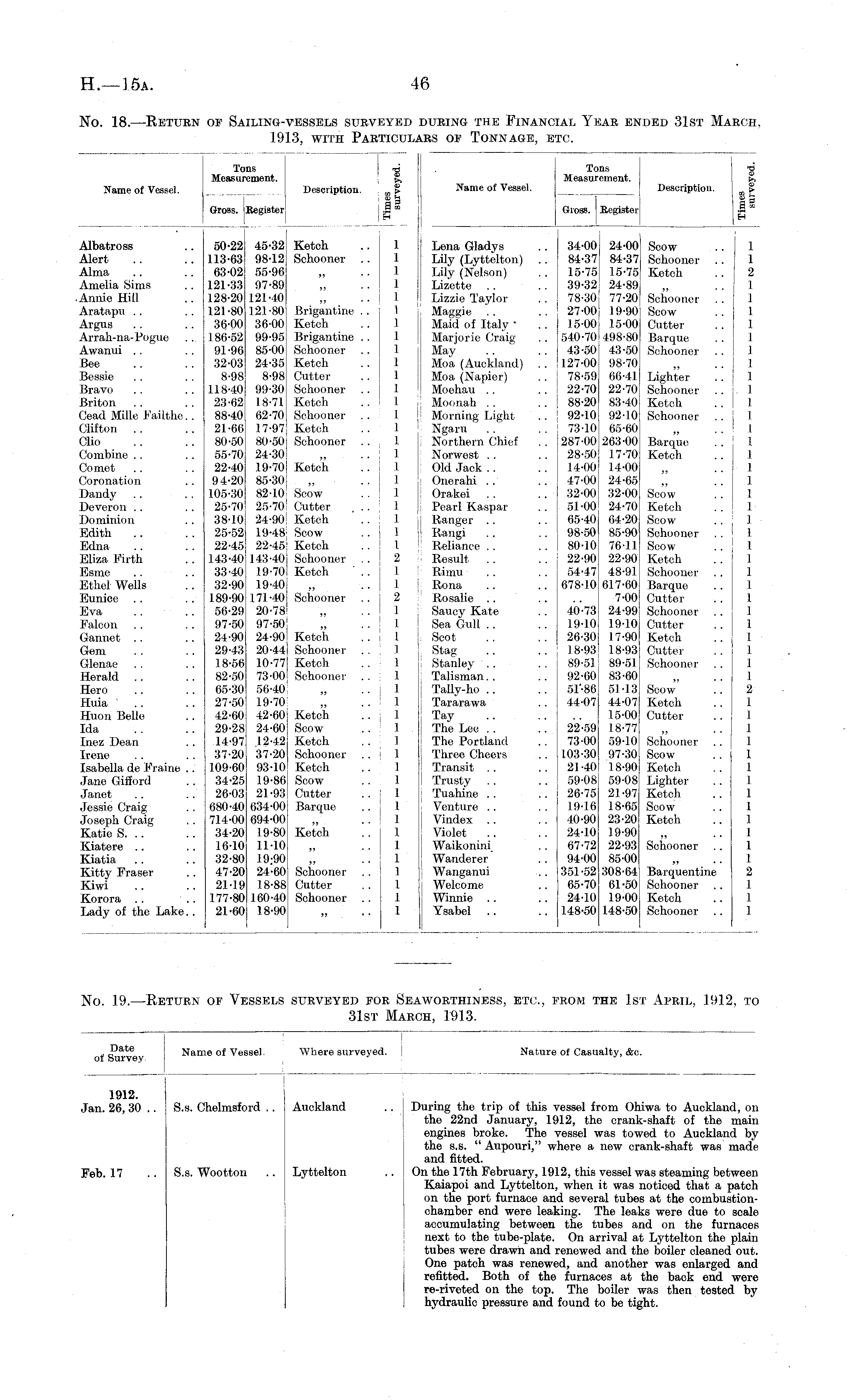 Name of Vessel. TO! Measuri ms ; .g rement. >> Description. £ Register § » Name of Vessel. Tons Measurement. Gloss. Register Description. I i ll Gross. ! Albatross Alert Alma Amelia Sims Annie Hill Aratapu Argus Arrah-na-Pogue Awanui Bee Bessie Bravo Briton Cead Mille Failthe .. Clifton Clio Combine Comet Coronation Dandy Deveron Dominion Edith Edna Eliza Firth Esme Ethel Wells Eunice 50-22 113-63 63-02 121-33 128-20 121-80 36-00 186-52 91-96 32-03 8-98 118-40 23-62 88-40 21-66 80-50 55-70 22-40 94-20 105-30 25-70 38-10 25-52 22-45 143-40 33-40 32-90 189-90 56-29 97-50 24-90 29-43 18-56 82-50 65-30 27-50 42-60 29-28 14-97 37-20 109-60 34-25 26-03 680-40 714-00 34-20 16-10 32-80 47-20 21-19 177-80 21-60 45-32 Ketch .. 1 98-12 Schooner .. 1 55-96 „ .. 1 i 97-89 „ ..1 121-40 „ .. 1 121-80 Brigantine . . 1 36-00 Ketch .. 1 99-95 Brigantine .. 1 85-00 Schooner .. 1 24-35 Ketch .. 1 8-98 Cutter .. 1 99-30 Schooner .. I 1 18-71 Ketch .". 1 62-701 Schooner .. 1 17-97 Ketch .. 1 80-50: Schooner ... 1 24-30' „ .. i 1 19-701 Ketch .. j 1 85-30 „ .". 1 82-10- Scow .. ! 1 25-70 Cutter . . 1 24-90 Ketch . . 1 19-48 Scow .. 1 22-45! Ketch ... 1 143-40 Schooner . . j 2 19-70; Ketch ' .. 1 19-401 ., .. I 1 171-49 Schooner . . j 2 „ .. ! 1 97-50 „ .. 1 24-90: Ketch .. 1 20-44J Schooner .. 1 i 10-77 Ketch .. 1 73-00 ! Schooner .. I 1 56-40 „ .. 1 19-70 „ .. 1 i 42-60! Ketch .. 1 I 24-60 ; Scow ..'■ 1 I 12-42 Ketch .. 1 i 37-20 Schooner .. 1 i 93-10 Ketch .. 1 i 19-86 Scow .. 1 : 21-93! Cutter .. 1 i 634-00 Barque .. 1 i 694-00 „ .. ! 1 i 19-80 Ketch .. [ 1 i 11-10 „ .. 1 i 19:90 „ . . 1 I 24-60 Schooner . . 1 I 18-88 Cutter . . 1 I 160-40 Schooner .. 1 I 18-90 „ .. 1 Lena Gladys Lily (Lyttelton) Lily (Nelson) Lizette Lizzie Taylor Maggie '. . Maid of Italy " Marjorie Craig May Moa (Auckland) Moa (Napier) Moehau . . Moonah . . Morning Light Ngaru Northern Chief Norwest .. Old Jack .. Onerahi . . Orakei Pearl Kaspar Ranger .. Rangi Reliance . . Result Rimu Rona Rosalie .. Saucy Kate Sea Gull . . Scot Stag Stanley .. Talisman. . Tally-ho .. Tararawa Tay The Lee . . The Portland Three Cheers Transit .. Trusty .. Tuahine . . Venture .. Vindex .. Violet Waikonini Wanderer Wanganui Welcome Winnie Ysabel .. Lei Lil Lil Liz Liz Ma Ma Ma Ma Mo Mo Mo Mo Mo Xg No No Ol( On Or; Pet Ra Ra Re Rβ I tii lie, Rβ Siii Sβ! Sc< St8 Tal Ta Ta Ta; Th Th Th Tri Tri Tu Ve Vii Vi< Ws Wt W: We Wi Ys >na Gladys ly (Lyttelton) ly (Nelson) zette zzie Taylor iggie . . aid of Italy ' arjorio Craig ay sa (Auckland) 3a (Napier) 3ehau . . oonah . . orning Light *aru jrthern Chief arwest .. d Jack .. lerahi .. ?akei >arl Kaspar inger .. Migi jliance .. 3sult imu ana asalie .. .ucy Kate :a Gull . . «t ag anley ilisnian . . illy-ho .. irarawa iy ie Lee .. ie Portland iree Cheers -ansit .. •usty lahine .. 3nture .. index iolet 'aikonini anderer 'anganui 'elcome 'innie sabel . 34-00 24-00 f . 84-37 84-37 i 15-75 15-75 ] 39-32 24-89 . 78-30 : 77-20 t 27-00 j 19-90 i 15-00 15-00 ( . 540-70 498-80 ] . 43-50 43-50 £ . ! 127-00 98-70 . ! 78-59 66-41 ] . ! 22-70 22-70 £ . J 88-20 83-40 1 02-10 92-10 £ . ! 73-101 65-60 . 287-001263-00 ] 28-50! 17-70 ] . 14-00 14-00 47-00 24-65 32-00 32-00 i . J 51-00 24-70 ] . J 65-40 64-20 £ . J 98-50 85-90 £ . j 80-10 76-11 t . \ 22-90 22-90 1 . 54-47 48-91 £ . 678-10 617-60 ] 7-00 ( . 40-73 24-99 £ 19-10 19-10 ( 26-30 17-90 ] . ! 18-93J 18-93 ( . I 89-51 89-51 5 92-60 83-60 51"-86 51-13 £ 44-07 44-07 1 . .. 15-00 ( 22-59 18-77 . 73-00 59-10 £ . 103-30 97-30 5 21-40 18-90 I 59-08 59-08 I .-. 26-75 21-97 I . 19-16 18-65 £ 40-90 23-20 I 24-10 19-90 . 67-72 22-93 £ 94-00 85-00 . 351-52 308-64 ] . 65-70 61-50 £ . 24-10 19-00 1 . 148-50 148-50 J 34-00 84-37 15-75 39-32 78-30 27-00 15-00 540-70 43-50 127-00 78-59 22-70 88-20 92-10 73-10 287-00] 28-50! 14-00 47-00 32-00 51-00 65-40 98-50 80-10 22-90 54-47 678-10 24-00 84-37 15-75 24-89 77-20 19-90 15-00 498-80 43-50 98-70 66-41 22-70 83-40 92-10 65-60 263-00 17-70 14-00 24-65 32-00 24-70 64-20 85-90 76-11 22-90 48-91 617-60 7-00 24-99 19-10 17-90 18-93 89-51 83-60 51-13 44-07 15-00 18-77 59-10 97-30 18-90 59-08 21-97 18-65 23-20 .19-90 22-93 85-00 308-64 61-50 19-00 148-50 Soow Schooner Ketch Schooner Scow Cutter Barque Schooner Lighter Schooner Ketch Schooner Barque Ketch Scow Ketch Scow Schooner Scow Ketch Schooner Barque Cutter Schooner Cutter Ketch Cutter Schooner Scow Schooner Ketch Schooner Scow CutterBarque Schooner Lighter Schooner Ketch Schooner Barque Ketch Scow Ketch Soow Schooner Scow Ketch Schooner Barque Cutter Schooner Cutter Ketch Cutter Schooner Scow Ketch Cutter Schooner Scow Ketch Lighter Ketch Scow Ketch Schooner Barquentine Schooner Ketch Schooner 1 : 2 i i i . I i ■! i . i i i i . . i i : ! 1 1 1 1 1 J . 1 . I 1 1 1 1 1 1 1 1 : 1 • i ! 1 2 1 1 1 • I ! '. 1 1 1 1 1 1 1 1 2 1 1 1 Eva Falcon Gannet Gem Glenae Herald Hero Huia Huon Belle Ida 40-73 19-10 26-30 18-93! 89-51 92-60 51"-86 44-07 Scow Ketch Cutter Inez Dean Irene Isabella de Fraine .. Jane Gifford Janet Jessie Craig Joseph Craig Katie S. .. Kiatere Kiatia Kitty Fraser Kiwi Korora . . Lady of the Lake. . 22-59 73-00 103-30 21-40 59-08 26-75 19-16 40-90 24-10 67-72 94-00 351-52 65-70 24-10 148-50 Schooner Scow Ketch Lighter Ketch Scow Ketch Schooner Barquentine Schooner Ketch Schooner
