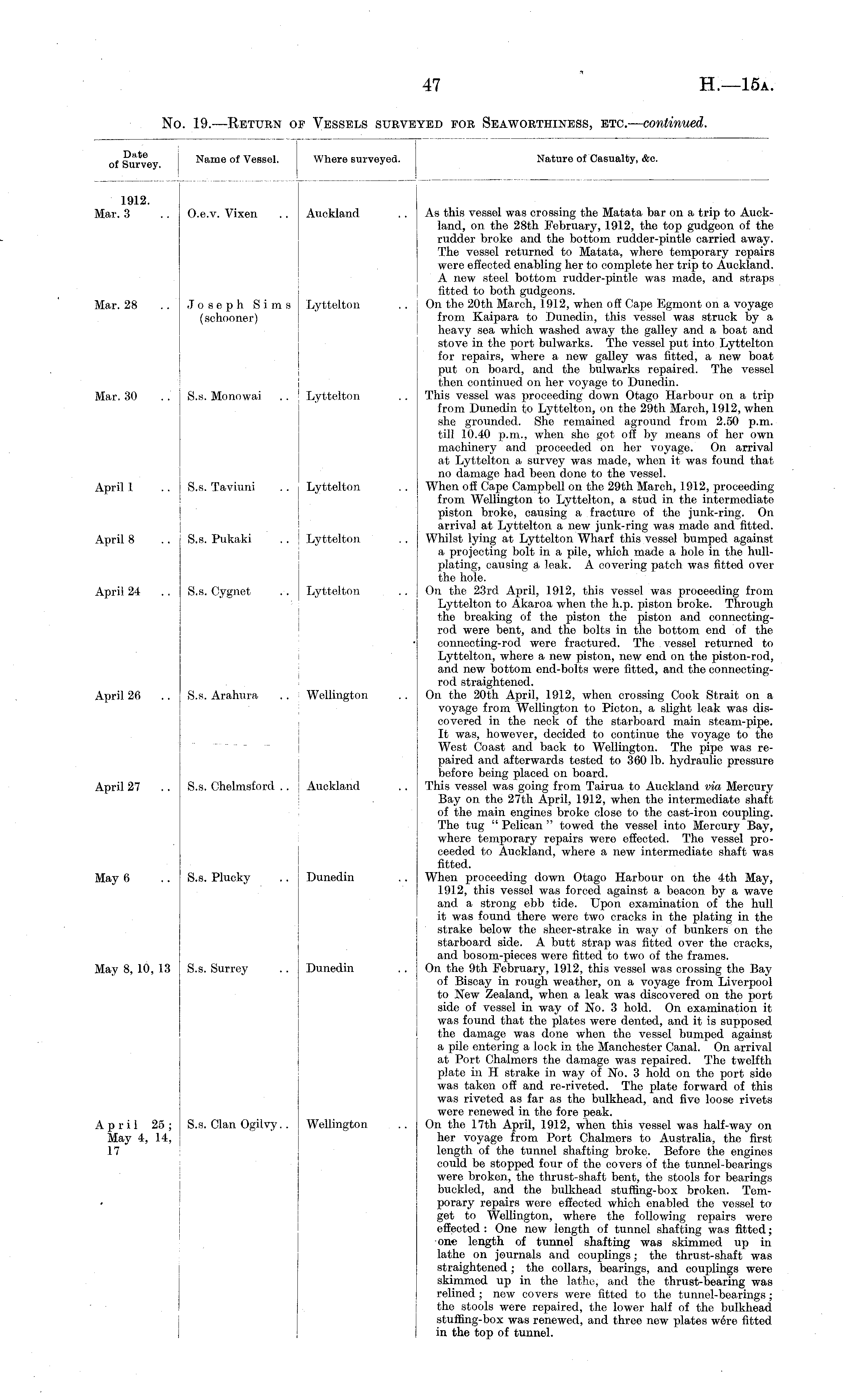 Date of Survey. Name of Vessel. Where surveyed. Nature of Casualty, &c. 1912. tfar. 3 O.e.v. Vixen Auckland As this vessel was crossing the Matata bar on a trip to Auckland, on the 28th February, 1912, the top gudgeon of the rudder broke and the bottom rudder-pintle carried away. The vessel returned to Matata, where temporary repairs were effected enabling her to complete her trip to Auckland. A new steel bottom rudder-pintle was made, and straps fitted to both gudgeons. On the 20th March, 1912, when off Cape Egmont on a voyage from Kaipara to Dunedin, this vessel was struck by a heavy sea which washed away the galley and a boat and stove in the port bulwarks. The vessel put into Lyttelton for repairs, where a new galley was fitted, a new boat put on board, and the bulwarks repaired.. The vessel then continued on her voyage to Dunedin. This vessel was proceeding down Otago Harbour on a trip from Dunedin to Lyttelton, on the 29th March, 1912, when she grounded. She remained aground from 2.50 p.m. till 10.40 p.m., when she got off by means of her own machinery and proceeded on her voyage. On arrival at Lyttelton a survey was made, when it was found that no damage had been done to the vessel. When off Cape Campbell on the 29th March, 1912, proceeding from Wellington to Lyttelton, a stud in the intermediate piston broke, causing a fracture of the junk-ring. On arrival at Lyttelton a new junk-ring was made and fitted. Whilst lying at Lyttelton Wharf this vessel bumped against a projecting bolt in a pile, which made a hole in the hullplating, causing a leak. A covering patch was fitted over the hole. On the 23rd April, 1912, this vessel was proceeding from Lyttelton to Akaroa when the h.p. piston broke. Through the breaking of the piston the piston and connectingrod were bent, and the bolts in the bottom end of the connecting-rod were fractured. The vessel returned to Lyttelton, where a new piston, new end on the piston-rod, and new bottom end-bolts were fitted, and the connectingrod straightened. On the 20th April, 1912, when crossing Cook Strait on a voyage from Wellington to Picton, a slight leak was discovered in the neck of the starboard main steam-pipe. It was, however, decided to continue the voyage to the West Coast and back to Wellington. The pipe was repaired and afterwards tested to 360 lb. hydraulic pressure before being placed on board. This vessel was going from Tairua to Auckland via Mercury Bay on the 27th April, 1912, when the intermediate shaft of the main engines broke close to the oast-iron coupling. The tug " Pelican " towed the vessel into Mercury Bay, where temporary repairs were effected. The vessel proceeded to Auckland, where a new intermediate shaft was fitted. When proceeding down Otago Harbour on the 4th May, 1912, this vessel was forced against a beacon by a wave and a strong ebb tide. Upon examination of the hull it was found there were two cracks in the plating in the strake below the sheer-strake in way of bunkers on the starboard side. A butt strap was fitted over the cracks, and bosom-pieces were fitted to two of the frames. On the 9th February, 1912, this vessel was crossing the Bay of Biscay in rough weather, on a voyage from Liverpool to New Zealand, when a leak was discovered on the port side of vessel in way of No. 3 hold. On examination it was found that the plates were dented, and it is supposed the damage was done when the vessel bumped against a pile entering a lock in the Manchester Canal. On arrival at Port Chalmers the damage was repaired. The twelfth plate in H strake in way of No. 3 hold on the port side was taken off and re-riveted. The plate forward of this was riveted as far as the bulkhead, and five loose rivets were renewed in the fore peak. On the 17th April, 1912, when this vessel was half-way on her voyage from Port Chalmers to Australia, the first length of the tunnel shafting broke. Before the engines could be stopped four of the covers of the tunnel-bearings were broken, the thrust-shaft bent, the stools for bearings buckled, and the bulkhead stuffing-box broken. Temporary repairs were effected which enabled the vessel to get to Wellington, where the following repairs were effected : One new length of tunnel shafting was fitted; one length of tunnel shafting was skimmed up in lathe on journals and couplings; the thrust-shaft was straightened ; the collars, bearings, and couplings were skimmed up in the lathe, and the thrust-bearing was relined ; new covers were fitted to the tunnel-bearings ; the stools were repaired, the lower half of the bulkhead stuffing-box was renewed, and three new plates were fitted in the top of tunnel. tar. 28 Joseph Sims (schooner) Lyttelton far. 30 S.s. Monowai .. ' Lyttelton S.s. Taviuni Lyttelton t pril 1 L pril 8 S.s. Pukaki .. | Lyttelton .pril 24 S.s. Cygnet Lyttelton t pril 26 S.s. Arahura Wellington .pril 27 S.s. Chelmsford . . Auckland [ay 6 S.s. Plucky Dunedin S.s. Surrey Dunedin [ay 8, 10, 13 p r i 1 25 ; May 4, 14, 17 S.s. Clan Ogilvy.. Wellington