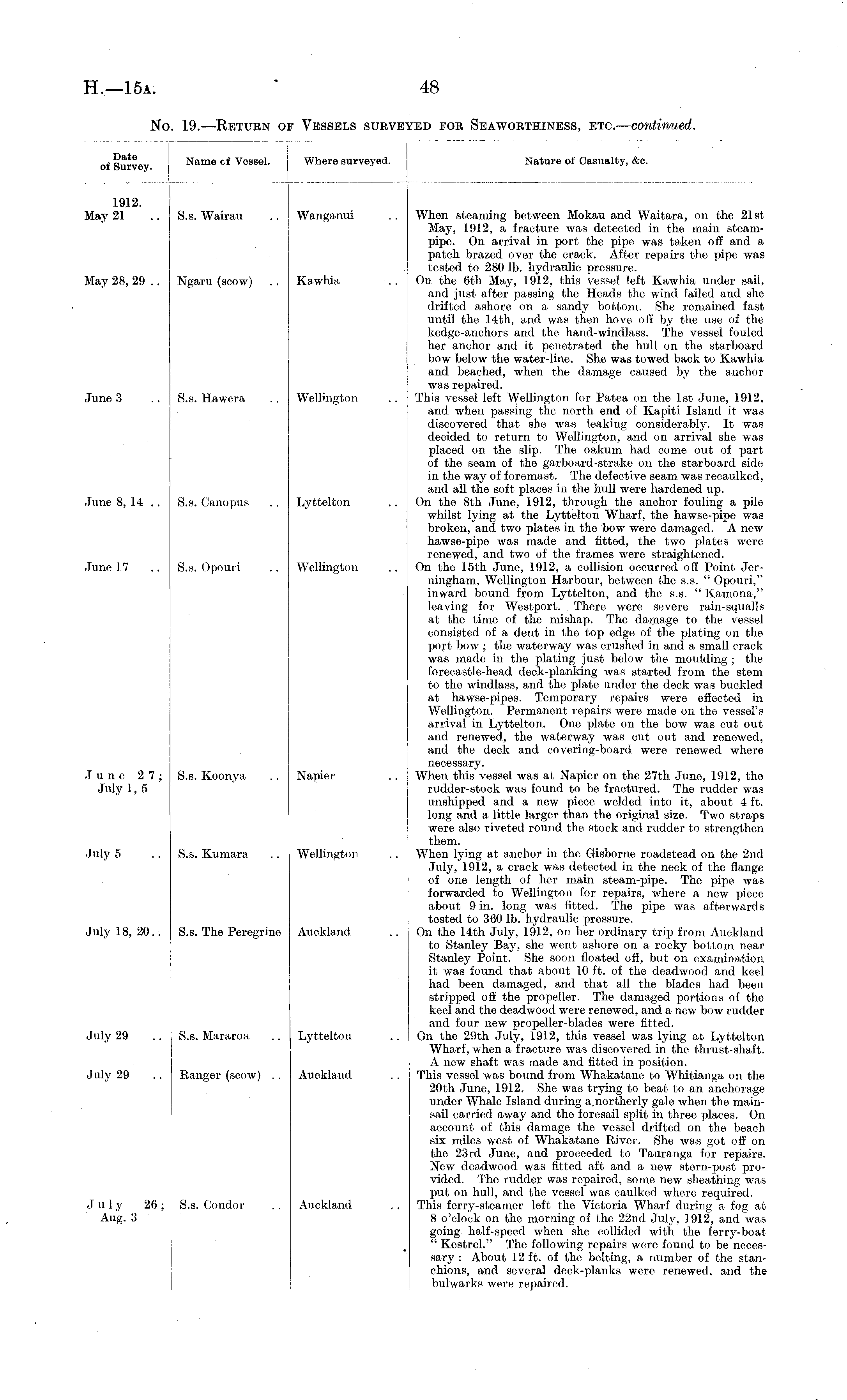 Date of Survey. Name cf Vessel. Where surveyed. Nature ol Casualty, &c. 1912. [ay 21 1912. *y 21 S.s. Wairau S.s. Wairau Wanganui When steaming between Mokau and Waitara, on the 21st May, 1912, a fracture was detected in the main steampipe. On arrival in port the pipe was taken off and a patch brazed over the crack. After repairs the pipe was tested to 280 lb. hydraulic pressure. On the 6th May, 1912, this vessel left Kawhia under sail, and just after passing the Heads the wind failed and she drifted ashore on a sandy bottom. She remained, fast until the 14th, and was then hove off by the use of the kedge-anchors and the hand-windlass. The vessel fouled her anchor and it penetrated the hull on the starboard bow below the water-line. She was towed back to Kawhia and beached, when the damage caused by the anchor was repaired. This vessel left Wellington for Patea on the 1st June, 1912, and when passing the north end of Kapiti Island it was discovered that she was leaking considerably. It was decided to return to Wellington, and on arrival she was placed on the slip. The oakum had come out of part of the seam of the garboard-strake on the starboard side in the way of foremast. The defective seam was recanlked, and all the soft places in the hull were hardened up. On the 8th June, 1912, through the anchor fouling a pile whilst lying at the Lyttelton Wharf, the hawse-pipe was broken, and two plates in the bow were damaged. A new hawse-pipe was made and fitted, the two plates were renewed, and two of the frames were straightened. On the 15th June, 1912, a collision occurred off Point Jerningham, Wellington Harbour, between the s.s. " Opouri," inward bound from Lyttelton, and the s.s. " Kamona," leaving for Westport. There were severe rain-squalls at the time of the mishap. The damage to the vessel consisted of a dent in the top edge of the plating on the port bow ; the waterway was crushed in and a small crack was made in the plating just below the moulding ; the forecastle-head deck-planking was started from the stem to the windlass, and the plate under the deck was buckled at hawse-pipes. Temporary repairs were effected in Wellington. Permanent repairs were made on the vessel's arrival in Lyttelton. One plate on the bow was cut out and renewed, the waterway was cut out and renewed, and the deck and covering-board were renewed where [ay 28, 29 .. iy 28, 29 .. Ngaru (scow) Ngaru (scow) Kawhia Fune 3 S.s. Hawera Wellington S.s. Canopus Lyttelton June 8, 14 .. June 17 S.s. Opouri Wellington June 27; July 1,5 July 5 Fuly 18, 20.. S.s. Koonya S.s. Kumara S.s. The Peregrine S.s. Mararoa Napier Wellington Auckland Lyttelton necessary. When this vessel was at Napier on the 27th June, 1912, the rudder-stock was found to be fractured. The rudder was unshipped and a new piece welded into it, about 4 ft. long and a little larger than the original size. Two straps were also riveted round the stock and rudder to strengthen them. When lying at anchor in the Gisborne roadstead on the 2nd July, 1912, a crack was detected in the neck of the flange of one length of her main steam-pipe. The pipe was forwarded to Wellington for repairs, where a new piece about 9 in. long was fitted. The pipe was afterwards tested to 360 lb. hydraulic pressure. On the 14th July, 1912, on her ordinary trip from Auckland to Stanley Bay, she went ashore on a rocky bottom near Stanley Point. She soon floated off, but on examination it was found that about 10 ft. of the deadwood and keel had been damaged, and that all the blades had been stripped off the propeller. The damaged portions of the keel and the deadwood were renewed, and a new bow rudder and four new propeller-blades were fitted. On the 29th July, 1912, this vessel was lying at Lyttelton Wharf, when a fracture was discovered in the thrust-shaft. A new shaft was made and fitted in position. This vessel was bound from Whakatane to Whitianga on the 20th June, 1912. She was trying to beat to an anchorage under Whale Island during a.northerly gale when the mainsail carried away and the foresail split in three places. On account of this damage the vessel drifted on the beach six miles west of Whakatane River. She was got off on the 23rd June, and proceeded to Tauranga for repairs. New deadwood was fitted aft and a new stern-post provided. The rudder was repaired, some new sheathing was put on hull, and the vessel was caulked where required. This ferry-steamer left the Victoria Wharf during a fog at 8 o'clock on the morning of the 22nd July, 1912, and was going half-speed when she collided with the ferry-boat " Kestrel." The following repairs were found to be necessary : About 12 ft. of the belting, a number of the stanchions, and several deck-planks were renewed, and the bulwarks were repaired. July 29 July 29 Ranger (scow) . . Auckland J uly 26; Aug. 3 S.s. Condor Auckland