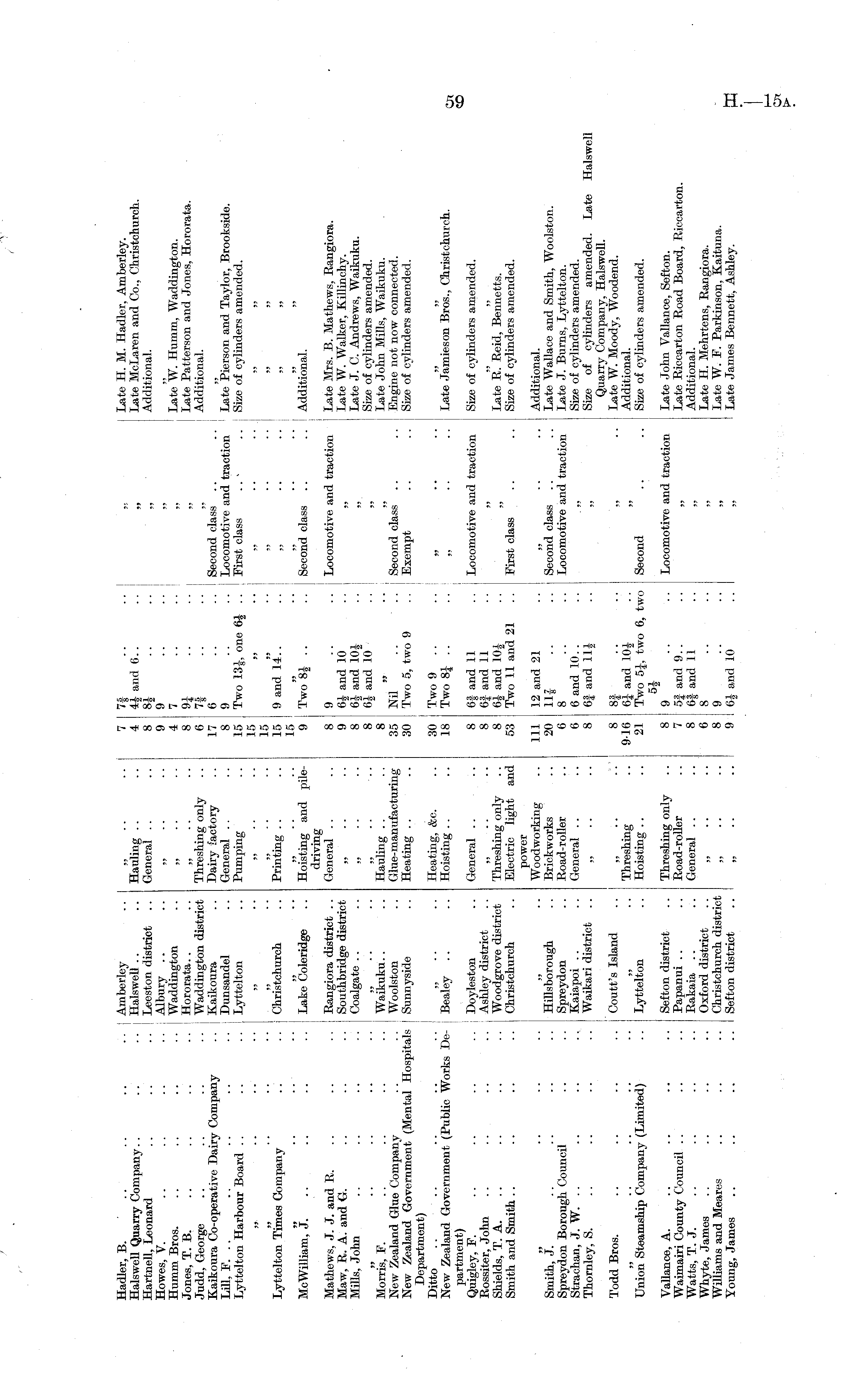 Hadler, B. .. .. .. .. j Amberley Halswell Quarry Company.. .. .. I Halswell .. Hartnell, Leonard .. .. ■ • ! Leeston district Howes, V. .. .. .. .. i Albury .. Humm Bros. .. .. .. .. j Waddington Jones, T. B. .. .. .. .. Hororata.. Judd, George .. .. .. ..' Waddington district Kaikoura Co-operative Dairy Company .. j Kaikoura Lill, F. .. .. .. .. .. I Dunsandel Lyttelton Harbour Board .. .. .. Lyttelton Lyttelton Times Company .. .. j Christehurch Hauling General Threshing only Dairy factory General Pumping 7 4 8 9 4 8 6 17 8 15 15 15 15 15 9 7f .. .. ! ,. Late H. M. Hadler, Amberley. 4f and 6.. .. J „ Late McLaren and Co., Christchurch. 8i .. .. ! „ Additional. 9 .... I 7 .. .. ! ,, j Late W. Humm, Waddington. 9J .. .. I „ I Late Patterson and Jones, Hororata. 7-§ .. .. ! ,, i Additional. 6 .. .. i Second class .. .. ,, 9 .. .. J Locomotive and traction Late Pierson and Taylor, Brookside. Two 13 J, one 6§ . . First class .. l .. I Size of cylinders amended. Printing .. 9 and 14". .. | " .. .. " " Mo William, J. .. .. .. Lake Coleridge Hoisting and piledriving General Two 8J .. .. Second class .. .. ! Additional. Mathews, J. J. and R. .. .. . . t Rangiora district .. Maw, R. A. and G. .. .. ■ ■ Southbridge district Mills, John .. .. .. .. Coalgate Morris, F. .. .. .. .. j Waikuku New Zealand Glue Company .. .. Woolston New Zealand Government (Mental Hospitals i Sunnyside Department) Ditto .. .. .. .. .. „ New Zealand Government (Public Works De- j Bealey partment) Quigley, F. .. .. .. .. I Doyleston Rossiter, John .. .. .. ... Ashley district Shields, T. A. .. .. .. .. Woodgrove district Smith and Smith .. .. .. .. Christchurch Hauling Glue-manufacturing Heating 8 9 8 8 8 35 30 9 .. .. Locomotive and traction j Late Mrs. B. Mathews, Rangiora. 6J and 10 „ | Late W. Walker, Killinchy. 6J and 10J .. „ , Late J. C. Andrews, Waikuku. 6J and 10 ■ .. I ,, j Size of cylinders amended. „ .. ! ,, I Late John Mills, Waikuku. Nil .. • • I Second class .. .. 1 Engine not now connected. Two 5, two 9 .. I Exempt .. .. j Size of cylinders amended. Heating, &c. Hoisting 30 18 Two 9 .. .. „ Two 8J .. .. ,, .. .. Late Jamieson Bros., Christchurch. General 8 8 8 53 6f and 11 .. j Locomotive and traction Size of cylinders amended. 6f and 11 6J and 10J .. „ Late R. Reid, Bennetts. Two 11 and 21 . . First class .. .. Size of cylinders amended. Threshing onlyElectric light and Smith, J. .. .. ■ ■ ■ ■ Hillsborough Spreydon Borough Council .. .. Spreydon Strachan, J. W. .. .. .. .. Kaiapoi Thornley, S. .. .. .. .. Waikari district .. power Woodworking Brickworks Road-roller General 111 20 6 6 8 12 and 21 .. I „ .. .. I Additional. llf .. .. Second class .. .. Late Wallace and Smith, Woolston. 8 .. .. Locomotive and traction Late J. Burns, Lyttelton. 6 and 10.. .. „ Size of cylinders amended. 6f and 11J . . „ Size of cylinders amended. Late Halswi Quarry Company, Halswell. 8| .. .. I „ .. I Late W. Moody, Woodend. 6J and 10J .. „ i Additional. Two 5J, two 6, two Second .. .. Size of cylinders amended. 9 .. .. Locomotive and traction Late John Vallance, Sefton. 5§ and 9.. .. „ | Late Ricearton Road Board, Riccarton. 6| and 11 .. „ Additional. 8 .... ,, j Late H. Mehrtens, Rangiora. 9 .. .. „ Late W. F. Parkinson, Kaituna. 6J and 10 „ Late James Bennett, Ashley. Todd Bros. .. .. .. .. Coutt's Island Threshing Hoisting 8 916 21 Union Steamship Company (Limited) .. Lyttelton Vallance, A. .. .. .. .. Sefton district Waimairi County Council .. .. • ■ I Papanui Watts, T. J. .. .. .. .. i Rakaia Whyte, James .. .. .. .. Oxford district Williams and Meares .. .. .. Christchurch district Young, James .. .. .. .. Sefton district Threshing only Road-roller General .. 8 7 8 6 8 9