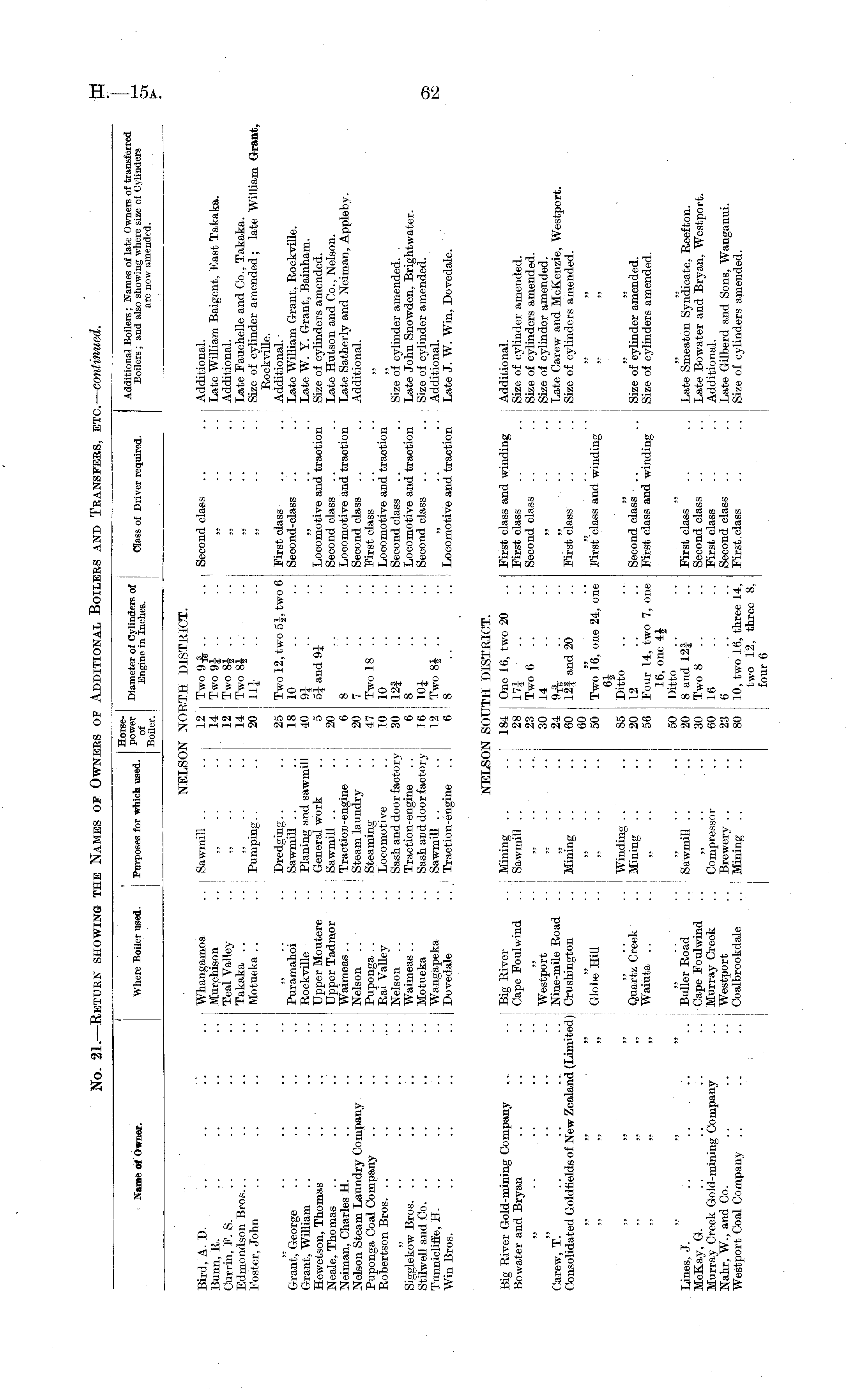 Name of Owner. I Where Boiler used. HorsePtoses for which used. P™« - Boiler. Class of Driver required. Additional Boilers; Names of lato Owners of transferred Boilers ; and also showing where size of Cylinders are now amendfd. NELSON NORTH DISTRICT. Jird, A. D. .. .. .". .. Whangamoa 3unn, R. .. .. .. .. Murchison 3urrin, F. S. .. .. .. .. Teal Valley idmondson Bros... .. .. .. Takaka .. Foster, John .. .. .. .. Motueka .. .. Sawmill .. .. i 12 "i Two 9* .. .. I 14 Two 9| .. .. J „ .. .. I 12 Two 8f .. .. I 14 Two 8J .. . . Pumping.. .. I 20 j 11£ .. Second class Additional. Late William Baigent, East Takaka. Additional. Late Fauchelle and Co., Takaka. Size of cylinder amended; late William Grant. Rockville. Additional. ■ Late William Grant, Rockville. Late W. Y. Grant, Bainham. Size of cylinders amended. Late Hutson and Co., Nelson. Late Satherly and Neiman, Appleby. Additional. Jrant, George .. .. .. .. Puraniahoi >rant, William .. .. .. .. ! Rockville ilewetson, Thomas .. .. .. j Upper Moutere Sleale, Thomas .. .. .. .. i Upper Tadmor Nfeiman, Charles H. .. .. .. j Waimeas .. Sfelson Steam Laundry Company .. .. j Nelson Puponga Coal Company .. .. .. Puponga .. Robertson Bros. .. .. .. ... Rai Valley ,, .. .. .. .. Nelson Sgglekow Bros. .. .. .. .. | Waimeas .. Stilwell and Co. .. .. .. .. I Motueka Punniciiffe, H. .. .. .. I Wangapeka /Vin Bros. .. .. .. .'. | Dovedale .. Dredging.. .. j 25 Two 12, two 5f, two 6 .. ! Sawmill .. .. j 18 10 .. I Planing and sawmill 40 9J .. j General work .. j 5 5J and 9J .. I Sawmill .. ... 20 .. i Traction-engine .. | 6 8 .. j Steam laundry .. i 20 7 .. J Steaming .. | 47 Two 18 .. .. I Locomotive .. 10 10 .. i Sash and door factory I 30 12f .. J Traction-engine .. 6 | 8 .. ! Sash and door factory 16 • 10 J . . j Sawmill .. ..' j 12 Two 8J .,. .. } Traction-engine .. I 6 8 First class Second-class Locomotive and traction Second class Locomotive and traction Second class First class Locomotive and traction Second class Locomotive and traction Second class Size of cylinder amended. . Late John Snowden, Brightwater. Size of cylinder amended. Additional. Late J. W. Win, Dovedale. Locomotive and traction NELSON SOUTH DISTRICT. First class and winding First class Second class Additional. Size of cylinder amended. Size of cylinders amended. Size of cylinder amended. Late Carew and MeKenzie, Westport. Size of cylinders amended. iig River Gold-mining Company ... .. | Big River riowater and Bryan .. .. .. I Cape Foulwind ,, .. .. .. Westport Jarew, T. .. .. .. .. Nine-mile Road Consolidated Goldfieldsof New Zealand (Limited): Crushington " " : Globe"Hill „ „ Quartz Creek „ „ ,, Waiuta .. Lines, J. .. .. ... .. Buller Road fcKay, G. .. .. .. . . Cape Foulwind Murray Creek Gold-mining Company .. Murray Creek W., and Co. .. .. .. Westport Vestport Coal Company .. .. .. Coalbrookdale .. Mining .. .. 184 One 16, two 20 .. .. ; Sawmill . . .. 28 17J 23 Two 6 .. ... „ .. .. 30 14 .. j .. .. 24 9& .. ! Mining .. .. 60 12} and 20 ... „ .. .. 60 .. „ .. .. 50 Two 16, one 24, one .. ! Winding .. .. 85 Ditto .. I Mining .. .. 20 12 .. „ .. .. 56 j Four 14, two 7, one 16, one 4| .. „ .. .. 50 Ditto . . I Sawmill .. .. 20 8 and 12| .. j „ .. .. 30 Two 8 .. . . I Compressor .. 60 16 .. I Brewery .. .. 23 6 .. Mining .. .. 80 10, two 16, three 14, two 12, three 8, four 6 First class First class and winding Second class First class and winding Size of cylinder amended. Size of cylinders amended. First class Second class First class Second class First class Late Smeaton Syndicate, Reefton. Late Bowater and Bryan, Westport. Additional. Late Gilberd and Sons, Wanganui. Size of cylinders amended.