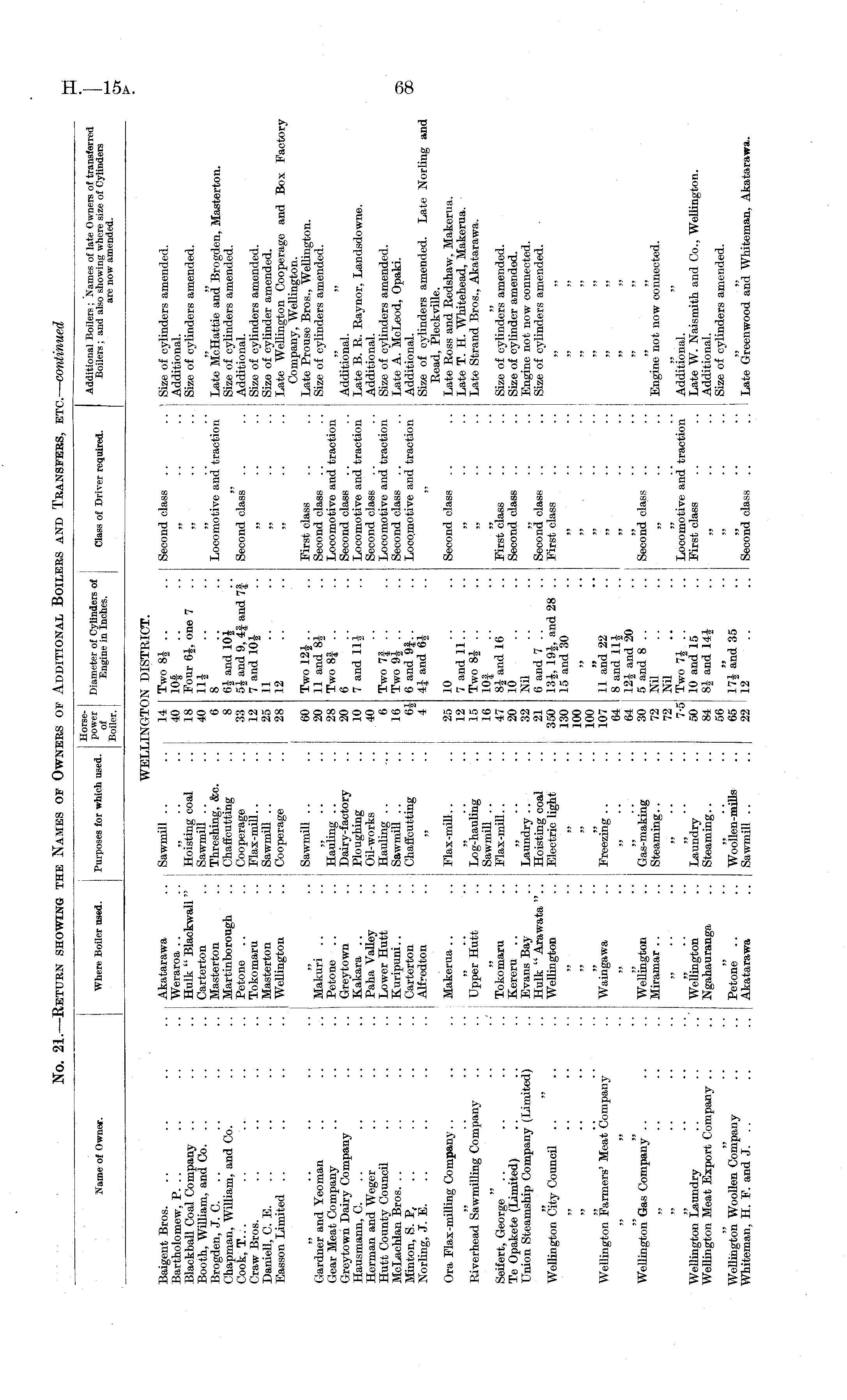 of Ownec. Where Boiler used. J Purposes for which used. P™~ "^ * I Boiler, j Class of Driver required. Additional Boilers ; Barnes of late Owners of transferred Boilers ; and also showing where size of Cylinders are now amended. WEL] JNGTO »N DISTRICT. Baigent Bros. Bartholomew, P. .. Blackball Coal Company Booth, William, and Co. Brogden, J. C. Chapman, William, and Co. Cook, T... Craw Bros. Daniell, C. E. Easson Limited Gardner and Yeoman Gear Meat Company Greytown Dairy Company Hausmann, C. Herman and Weger Hutt County Council MeLachlan Bros. Minton, S. P, Nbrling, J. E. .. . Akatarawa .. . Sawmill .. .. j Weraroa .. .. I „ .. I Hulk " Blaekwall " j Hoisting coal .. j Carterton .. j Sawmill .. .. j Masterton .. \ Threshing, &c. Martinborough .. j Chaficutting Petone .. .. j Cooperage Tokomaru .. Flax-mill.. Masterton .. j Sawmill .. Wellington .. j Cooperage „ .. ! Sawmill .. Makuri .. .,. „ Petone .. .. j Hauling .. Greytown .. j Dairy-factory Kakara .. .. . Ploughing Paha Valley .. j Oil-works Lower Hutt .. | Hauling .. Kuripuni.. .. i Sawmill .. .. ! Carterton .. ! ChafEcutting .. i Alfredton .. j „ 14 40 18 40 6 8 33 12 25 28 60 20 28 20 10 40 6 16 4 Two 8J .. 10f Four 6J, one 7 iii 8 6| and 101 5| and 9, 4f and 7| 7 and 10| 11 12 Second class Locomotive and traction Second class Size of cylinders amended. Additional. Size of cylinders amended. Late McHattie and Brogden, Masterton. Size of cylinders amended. Additional. Size of cylinders amended. Size of cylinder amended. Late Wellington Cooperage and Box Factor Company, Wellington. Late Prouse Bros., Wellington. Size of cylinders amended. Two 12J .. 11 and 8J Two 8| .. 6 7 and 11J First class Second class Locomotive and traction Second class Locomotive and traction Second class Locomotive and traction Second class Loco.motive and traction Additional. Late B. R. Raynor, Landsdowne. Additional. Size of cylinders amended. Late A. McLeod, Opaki. Additional. Size of cylinders amended. Late Norling an( Read, Pleekville. Late Ross and Redshaw, Makerua. Late T. H. Whitehead, Makerua. Late Strand Bros., Akatarawa. Two 7| .. Two 91 .. 6 and 9|.. 4| and 6J Ora Flax-milling Company.. Riverhead Sawmilling Company Seifert, George Te Opakete (Limited) Union Steamship Company (Limited) Wellington City Council Makerua .. .. | Flax-mill.. .. ! Upper Hutt .. \ Log-hauling . .■ j ,, .. ! Sawmill .. .. I Tokomaru .. I Flax-mill.. Kereru .. .. „ Evans Bay .. | Laundry .. Hulk " Aiawata ".. j Hoisting coal Wellington .. j Electric light 25 12 15 16 47 20 32 21 350 ! 130 : 100 ! loo I 107 64 64 30 72 72 7-5 50 84 56 65 22 10 7 and 11.. Two 81 .. 10f 8J and 16 10 Nil 6 and 7 .. 131, 19J, and 28 .. 15 and 30 Second class First class Second class Size of cylinders amended. Size of cylinder amended. Engine not now connected. Size of cylinders amended. Second class First class ■ • ,, • • Wellington Farmers' Meat Company Wellington Gas Company Waingawa .. Freezing .. Wellington .. Gas-making Miramar .. .. Steaming.. 11 and 22 8 and 111 121 and 20 5 and 8 .. Nil Nil Two 71 .. 10 and 15 81 and 141 Second class SJ ,, Engine not now connected. Wellington Laundry Wellington Meat Export Company .. Wellington .. Laundry Ngahauranga .. Steaming.. Locomotive and traction First class Additional. Late W. Naismith and Co., Wellington. Additional. Size of cylinders amended. ,, Wellington Woollen Company Whiteman, H. F. and J. . . Petone .. .. Woollen-mills Akatarawa .. Sawmill .. 171 and 35 12 Second class Late Greenwood and Whiteman, Akatarawa.