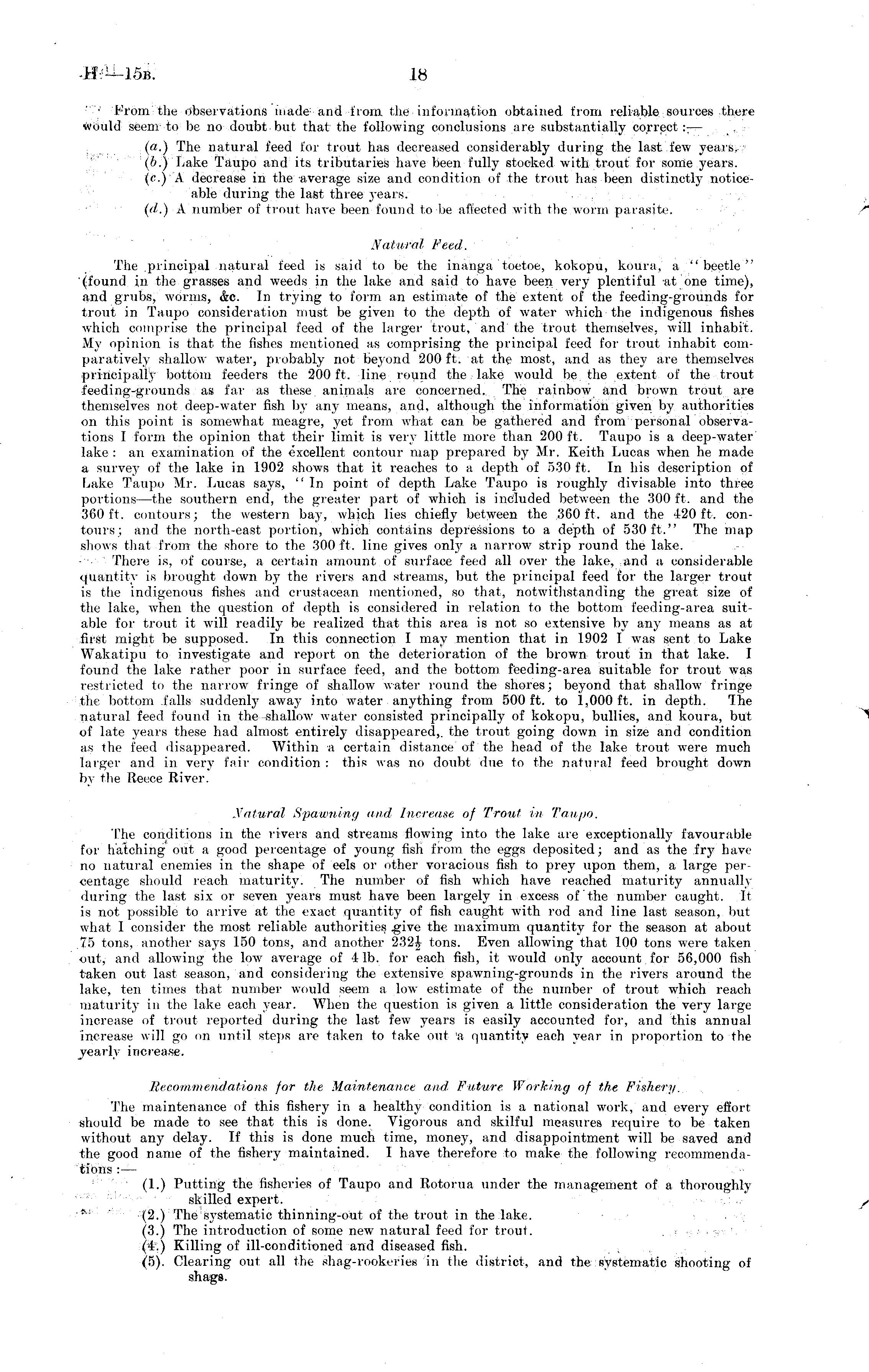 From the observations made : and from the information obtained from reliable sources there would seem to be no doubt but that tho following conclusions are substantially correct:: — (a.) The natural feed for trout has decreased considerably during the last few years. (6.) Lake Taupo and its tributaries have been fully stocked with trout for some years. («.) A decrease in the average size and condition of the trout has been distinctly noticeable during the last three .years. ..-.,- -(d.) A number of trout have been found to be affected with the worm parasite. Natural Feed. The .principal natural feed is said to bo the inanga toetoe, kokopu, koura, a " beetle " (found in the grasses and weeds in the lake and said to have been very plentiful at one time), and grubs, worms, &c. In trying to form an estimate of the extent of the feeding-grounds for trout in Taupo consideration must be given to the depth of water which the indigenous fishes which comprise the principal feed of the larger trout, and the trout themselves, will inhabit. My opinion is that the fishes mentioned as comprising the principal feed for trout inhabit comparatively shallow water, probably not beyond 200 ft. at the most, and as they are themselves principally bottom feeders the 200 ft. line round the lake would be. the extent of the trout feeding-grounds as far as these, animals are concerned. The rainbow and brown trout are themselves not deep-water fish by any means, and, although the information given by authorities on this point is somewhat meagre, yet from what can be gathered and from personal observations I form the opinion that their limit is very little more than 200 ft. Taupo is a deep-water lake : an examination of the excellent contour map prepared by Mr. Keith Lucas when he made a survey of the lake in 1902 shows that it reaches to a depth of 530 ft. In his description of Lake Taupo Mr. Lucas says, " In point of depth Lake Taupo is roughly divisable into three portions—the southern end, the greater part of which is included between the 300 ft. and the 360 ft. contours; the western bay, which lies chiefly between the 360 ft. and the 420 ft. contours; and the north-east portion, which contains depressions to a depth of 530 ft." The map shows that from the shore to the 300 ft. line gives only a narrow strip round the lake. - - There is, of course, a certain amount of surface feed all over the lake, and a considerable quantity is brought down by the rivers and streams, but the principal feed for the larger trout is the indigenous fishes and crustacean mentioned, so that, notwithstanding the great size of the lake, when the question of depth is considered in relation to the bottom feeding-area suitable for trout it will readily be realized that this area is not so extensive by any means as at first might be supposed. In this connection I may mention that in 1902 I was sent to Lake Wakatipu to investigate and report on the deterioration of the brown trout in that lake. I found the lake rather poor in surface feed, and the bottom feeding-area suitable for trout was restricted to the narrow fringe of shallow water round the shores; beyond that shallow fringe the bottom falls suddenly away into water anything from 500 ft. to 1,000 ft. in depth. The natural feed found in the shallow water consisted principally of kokopu, bullies, and koura, but of late years these had almost entirely disappeared,, the trout going down in size and condition as the feed disappeared. Within a certain distance of the head of the lake trout were much larger and in very fair condition : this was no doubt due to the natural feed brought down by the Recce River. Natural Spawning and Increase of Trout in 'fanpo. The conditions in the rivers and streams flowing into the lake are exceptionally favourable for hatching out a good percentage of young fish from the eggs deposited; and as the fry have no natural enemies in the shape of eels or other voracious fish to prey upon them, a large percentage should reach maturity. The number of fish which have reached maturity annually during the last six or seven years must have been largely in excess of the number caught. It is not possible to arrive at the exact quantity of fish caught with rod and line last season, but what I consider the most reliable authorities give the maximum quantity for the season at about .75 tons, another says 150 tons, and another 232J tons. Even allowing that 100 tons were taken out, and allowing the low average of 4 lb. for each fish, it would only account for 56,000 fish taken out last season, and considering the extensive spawning-grounds in the rivers around the lake, ten times that number would seem a low estimate of the number of trout which reach maturity in the lake each year. When tho question is given a little consideration the very large increase of trout reported during the last few years is easily accounted for, and this annual increase will go on until steps are taken to take out a quantity each year in proportion to the yearly increase. Recommendations for the Maintenance and Future Working of the Fishery. The maintenance of this fishery in a healthy condition is a national work, and every effort should be made to see that this is done. Vigorous and skilful measures require to be taken without any delay. If this is done much time, money, and disappointment will be saved and the good name of the fishery maintained. I have therefore to make the following recommendations :— (1.) Putting the fisheries of Taupo and Rotorua under the management of a thoroughly skilled expert. '"'"' (2.) The systematic thinning-out of the trout in the lake. (3.) The introduction of some new natural feed for trout. (4.) Killing of ill-conditioned and diseased fish. (5). Clearing out all the shag-rookeries in the district, and the systematic shooting of shags.