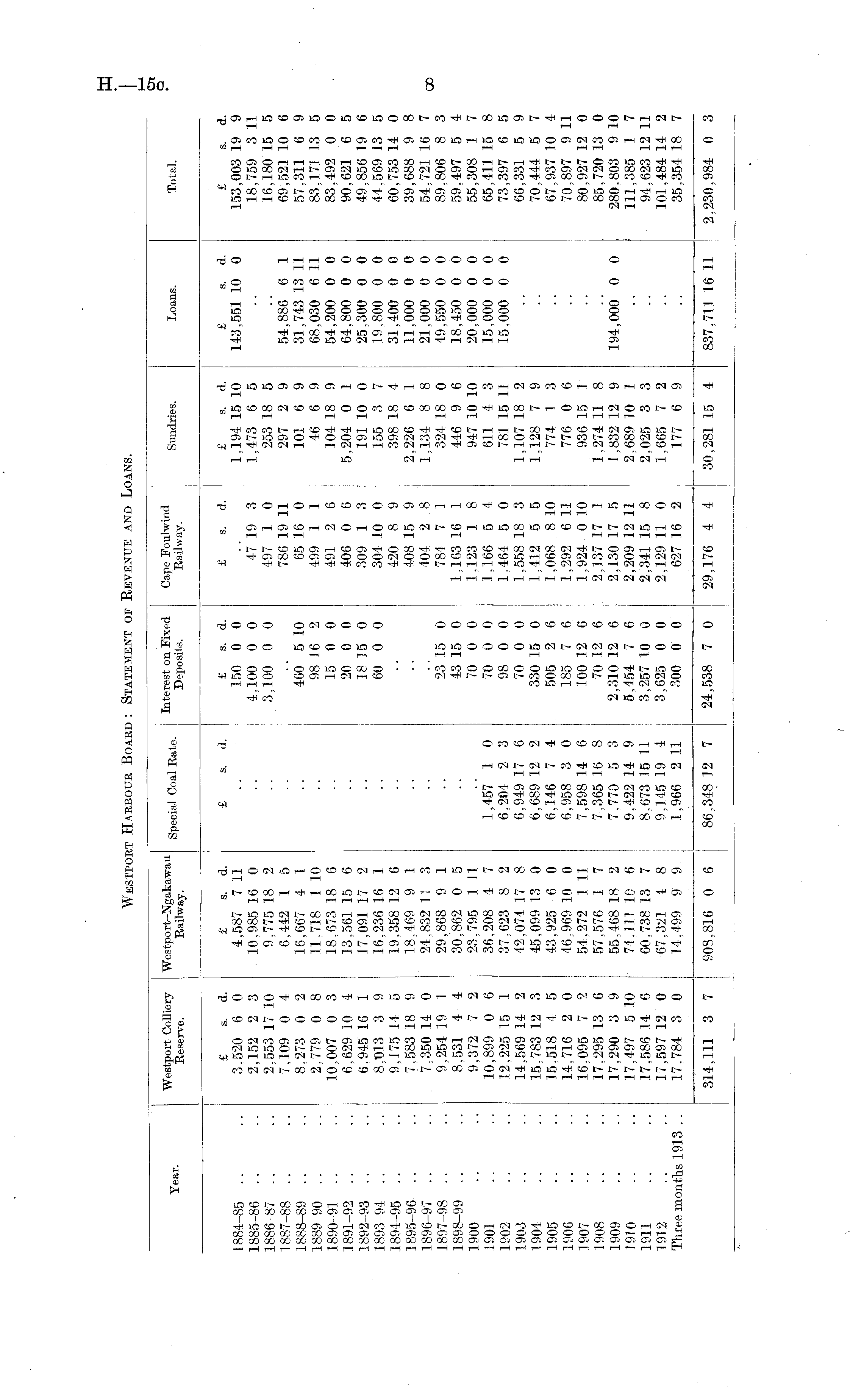 Year. Westport Colliery Reserve. Westport-Ngakawau Railway. Special Coal Rate. Interest on Fixed Deposits. Cape Foulwind Railway. Sundries. Loans. Total. 1884-85 1885-86 1886-87 1887-88 1888-89 1889-90 1890-91 1891-92 1892-93 1893-94 1894-95 1895-96 1896-97 1897-98 1898-99 1900 1901 1902 1903 1904 1905 1906 1907 1908 1909 1910 1911 1912 Three months 1913 .. £ s. d. 3.520 6 0 2,152 2 3 2,553 17 10 7,109 0 4 8,273 0 2 2,779 0 8 10,007 0 3 6,629 10 4 6.945 16 1 8,013 3 9 9,175 14 5 7,583 18 9 7,350 14 0 9,254 19 1 8.531 4 4 9.372 7 2 10.899 0 6 12.225 15 1 14,569 14 2 15.783 12 3 15,518 4 5 14,716 2 0 16,095 7 2 17,295 13 6 17,290 3 9 17,497 5 10 17,586 14 6 17,597 12 0 17.784 3 0 £ s. d. 4,587 7 11 10,985 16 0 9.775 18 2 6.442 1 5 16,667 4 1 11.718 1 10 18.673 18 6 13,561 15 6 17,091 17 2 16.236 16 1 19.358 12 6 18,469 9 1 24,832 11 3 29,868 9 1 30,862 0 5 23,795 1 11 36,208 4 7 37,623 8 2 42,074 17 8 45,099 13 0 43,925 6 0 46,969 10 0 54.272 1 11 57,576 1 7 55,468 18 2 74,111 10 6 60,738 13 7 67.321 I 8 14,499 9 9 £ s. d. £ s. d. 150 0 0 4,100 0 0 3.100 0 0 460 5 10 98 16 2 15 0 0 20 0 0 18 15 0 60 0 0 23 15 0 43 15 0 70 0 0 70 0 0 98 0 0 70 0 0 330 15 0 505 2 6 185 7 6 100 12 6 70 12 6 2,310 12 6 5,454 7 6 3,257 10 0 3,625 0 0 300 0 0 £ s. d. 47 19 3 497 1 0 786 19 11 65 16 0 499 1 1 491 2 6 406 0 6 309 1 3 304 10 0 420 8 9 408 15 9 404 2 8 784 7 1 1,163 16 1 1.123 1 8 1,166 5 4 1,464 5 0 1,558 18 3 1.412 5 5 1,068 8 10 1,292 6 11 1,924 0 10 2,137 17 1 2,130 17 5 2.209 12 11 2,341 15 8 2,129 11 0 627 16 2 £ s. d. 1,194 15 10 1,473 6 5 253 18 5 297 2 9 101 6 9 46 6 9 104 18 9 5.204 0 1 191 10 0 155 3 7 398 18 4 2,226 6 1 1,134 8 8 324 18 0 446 9 6 947 10 10 611 4 3 781 15 11 1,107 18 2 1,128 7 9 774 1 3 776 0 6 936 15 1 1,274 11 8 1,832 12 9 2.689 10 1 2.025 3 3 1,665 7 2 177 6 9 £ s. d. 143,551 10 0 54.886 6 1 31,743 13 11 68,030 6 11 54,200 0 0 64,800 0 0 25.300 0 0 19.800 0 0 31,400 0 0 11,000 0 0 21.000 0 0 49,550 0 0 18,450 0 0 20.000 0 0 15,000 0 0 15,000 0 0 £ s. d. 153,003 19 9 18,759 3 11 16,180 15 5 69,521 10 6 57,311 6 9 83,171 13 5 83,492 0 0 90,621 6 5 49,856 19 6 44,569 13 5 60,753 14 0 39,688 9 8 54,721 16 7 89,806 8 3 59,497 5 4 55,308 1 7 65,411 15 8 73,397 6 5 66,331 5 9 70,444 5 7 67,937 10 4 70,897 9 11 80,927 12 0 85,720 13 0 280,803 9 10 111,385 1 7 94,623 12 11 101,484 14 2 35,354 18 7 1,457 1 0 6,204 2 3 6,949 17 6 6,689 12 2 6,146 7 4 6,958 3 0 7,598 14 6 7,365 16 8 7,770 5 3 9.422 14 9 8,673 15 11 9.145 19 4 1,966 2 11 194,000 0 0 314,111 3 7 903,816 0 6 86,348 12 7 24,538 7 0 29,176 4 430,281 15 4 837,711 16 11 2,230,984 0