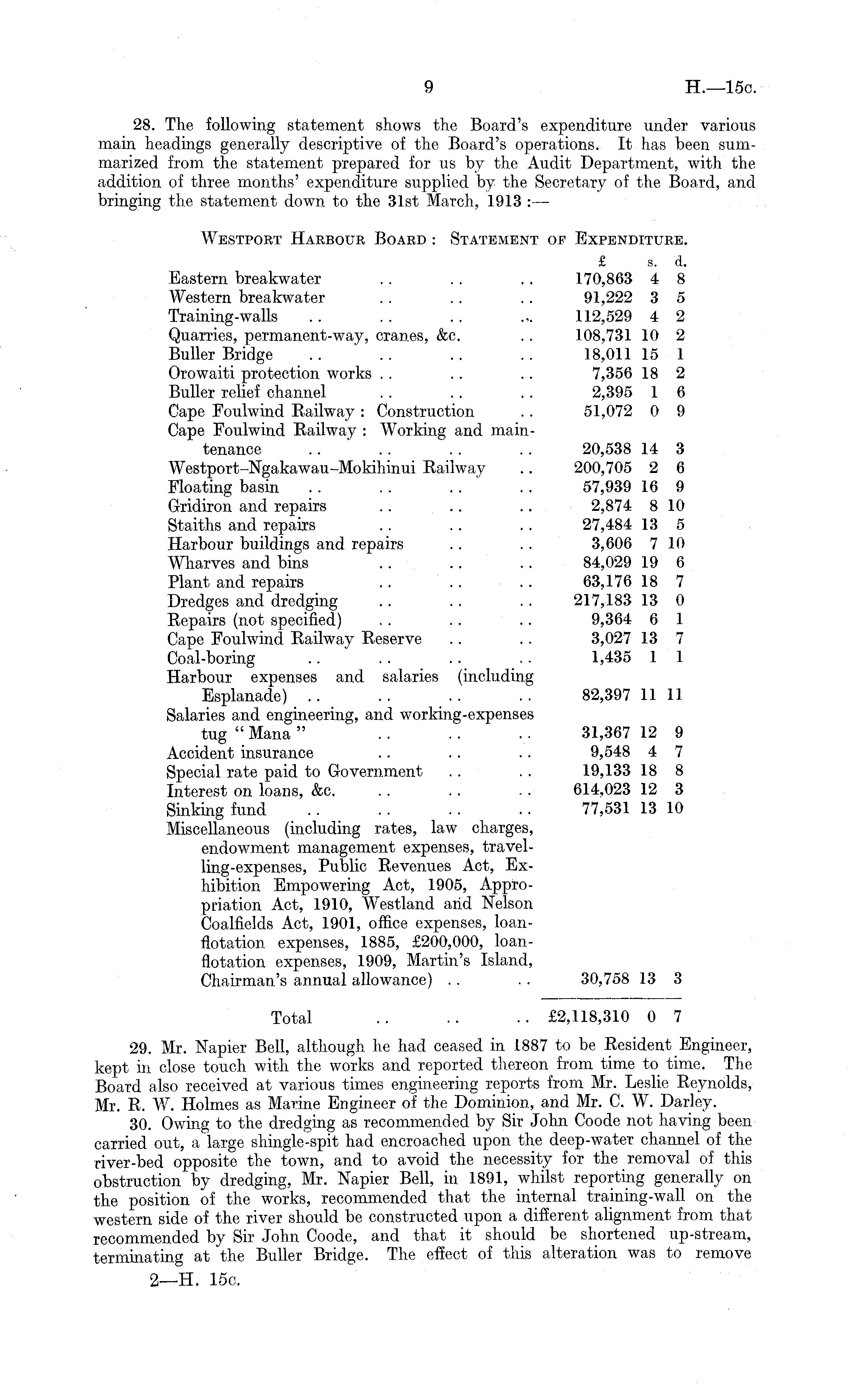28. The following statement shows the Board's expenditure under various main headings generally descriptive of the Board's operations. It has been summarized from the statement prepared for us by the Audit Department, with the addition of three months' expenditure supplied by the Secretary of the Board, and bringing the statement down to the 31st March, 1913 : — Westport Harbour Board : Statement op Expenditure. £ s. d. Eastern breakwater . . .. .. 170,863 4 8 Western breakwater .. .. .. 91,222 3 5 Training-walls .. . . .. ... 112,529 4 2 Quarries, permanent-way, cranes, &c. .. 108,731 10 2 Buller Bridge .. .. .. .. 18,01115 1 Orowaiti protection works . . .. .. 7,356 18 2 Buller relief channel . . . . . . 2,395 1 6 Cape Foulwind Railway : Construction .. 51,072 0 9 Cape Foulwind Railway : Working and maintenance .. .. . . . . 20,538 14 3 Westport-Ngakawau-Mokihinui Railway .. 200,705 2 6 Floating basin .. .. .. .. 57,939 16 9 Gridiron and repairs . . .. .. 2,874 8 10 Staiths and repairs .. . . .. 27,484 13 5 Harbour buildings and repairs .. . . 3,606 710 Wharves and bins .. .. . . 84,029 19 6 Plant and repairs . . . . .. 63,176 18 7 Dredges and dredging .. . . .. 217,183 13 0 Repairs (not specified) . . .. .. 9,364 6 1 Cape Foulwind Railway Reserve .. . . 3,027 13 7 Coal-boring .. .. .. . . 1,435 1 1 Harbour expenses and salaries (including Esplanade) .. .. .. .. 82,397 11 11 Salaries and engineering, and working-expenses tug "Mana" .. .. .. 31,367 12 9 Accident insurance .. .. . . 9,548 4 7 Special rate paid to Government . . . . 19,133 18 8 Interest on loans, &c. .. .. .. 614,023 12 3 Sinking fund .. .. .. .. 77,531 13 10 Miscellaneous (including rates, law charges, endowment management expenses, travel-ling-expenses, Public Revenues Act, Exhibition Empowering Act, 1905, Appropriation Act, 1910, Westland arid Nelson Coalfields Act, 1901, office expenses, loanflotation expenses, 1885, £200,000, loanflotation expenses, 1909, Martin's Island, Chairman's annual allowance) .. . . 30,758 13 3 Total .. .. .. £2,118,310 0 7 29. Mr. Napier Bell, although he had ceased in 1887 to be Resident Engineer, kept in close touch with the works and reported thereon from time to time. The Board also received at various times engineering reports from Mr. Leslie Reynolds, Mr. R. W. Holmes as Marine Engineer of the Dominion, and Mr. C. W. Darley. 30. Owing to the dredging as recommended by Sir John Coode not having been carried out, a large shingle-spit had encroached upon the deep-water channel of the river-bed opposite the town, and to avoid the necessity for the removal of this obstruction by dredging, Mr. Napier Bell, in 1891, whilst reporting generally on the position of the works, recommended that the internal training-wall on the western side of the river should be constructed upon a different alignment from that recommended by Sir John Coode, and that it should be shortened up-stream, terminating at the Buller Bridge. The effect of this alteration was to remove