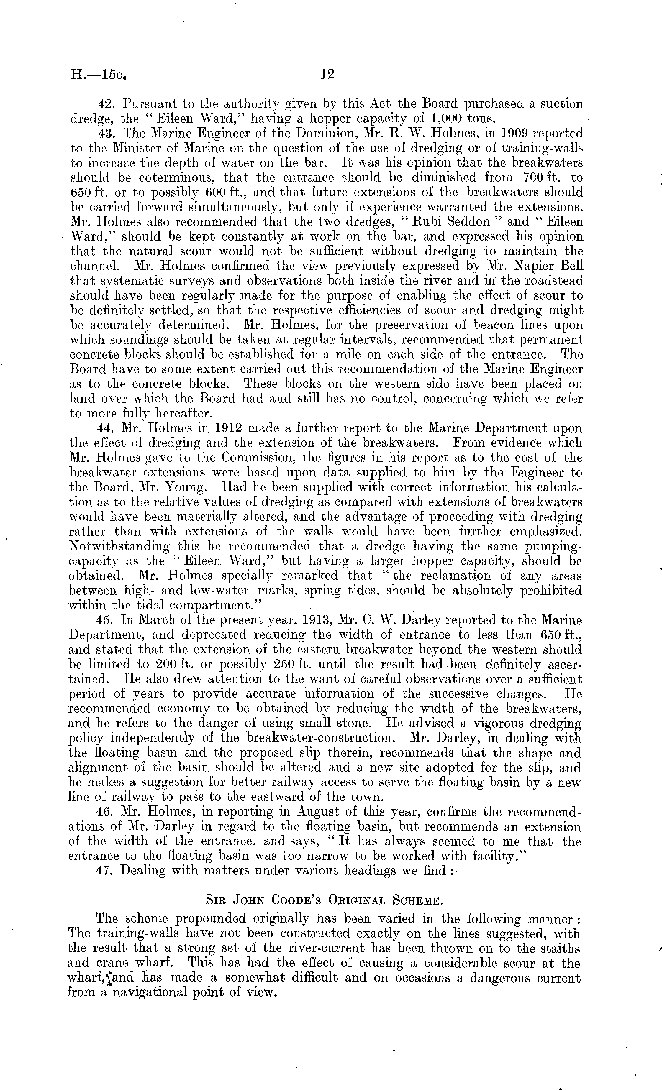 42. Pursuant to the authority given by this Act the Board purchased a suction dredge, the " Eileen Ward," having a hopper capacity of 1,000 tons. 43. The Marine Engineer of the Dominion, Mr. R. W. Holmes, in 1909 reported to the Minister of Marine on the question of the use of dredging or of training-walls to increase the depth of water on the bar. It was his opinion that the breakwaters should be coterminous, that the entrance should be diminished from 700 ft. to 650 ft. or to possibly 600 ft., and that future extensions of the breakwaters should be carried forward simultaneously, but only if experience warranted the extensions. Mr. Holmes also recommended that the two dredges, " Rubi Seddon " and " Eileen Ward," should be kept constantly at work on the bar, and expressed his opinion that the natural scour would not be sufficient without dredging to maintain the channel. Mr. Holmes confirmed the view previously expressed by Mr. Napier Bell that systematic surveys and observations both inside the river and in the roadstead should have been regularly made for the purpose of enabling the effect of scour to be definitely settled, so that the respective efficiencies of scour and dredging might be accurately determined. Mr. Holmes, for the preservation of beacon lines upon which soundings should be taken at regular intervals, recommended that permanent concrete blocks should be established for a mile on each side of the entrance. The Board have to some extent carried out this recommendation of the Marine Engineer as to the concrete blocks. These blocks on the western side have been placed on land over which the Board had and still has no control, concerning which we refer to more fully hereafter. 44. Mr. Holmes in 1912 made a further report to the Marine Department upon the effect of dredging and the extension of the breakwaters. From evidence which Mr. Holmes gave to the Commission, the figures in his report as to the cost of the breakwater extensions were based upon data supplied to him by the Engineer to the Board, Mr. Young. Had he been supplied with correct information his calculation as to the relative values of dredging as compared with extensions of breakwaters would have been materially altered, and the advantage of proceeding with dredging rather than with extensions of the walls would have been further emphasized. Notwithstanding this he recommended that a dredge having the same pumpingcapacity as the " Eileen Ward," but having a larger hopper capacity, should be obtained. Mr. Holmes specially remarked that " the reclamation of any areas between high- and low-water marks, spring tides, should be absolutely prohibited within the tidal compartment." 45. In March of the present year, 1913, Mr. C. W. Darley reported to the MarineDepartment, and deprecated reducing the width of entrance to less than 650 ft., and stated that the extension of the eastern breakwater beyond the western should be limited to 200 ft. or possibly 250 ft. until the result had been definitely ascertained. He also drew attention to the want of careful observations over a sufficient period of years to provide accurate information of the successive changes. He recommended economy to be obtained by reducing the width of the breakwaters, and he refers to the danger of using small stone. He advised a vigorous dredging policy independently of the breakwater-construction. Mr. Darley, in dealing with the floating basin and the proposed slip therein, recommends that the shape and alignment of the basin should be altered and a new site adopted for the slip, and he makes a suggestion for better railway access to serve the floating basin by a new line of railway to pass to the eastward of the town. 46. Mr. Holmes, in reporting in August of this year, confirms the recommendations of Mr. Darley in regard to the floating basin, but recommends an extension of the width of the entrance, and says, " It has always seemed to me that the entrance to the floating basin was too narrow to be worked with facility." 47. Dealing with matters under various headings we find :• — Sir John Coode's Original Scheme. The scheme propounded originally has been varied in the following manner : The training-walls have not been constructed exactly on the lines suggested, with the result that a strong set of the river-current has been thrown on to the staiths and crane wharf. This has had the effect of causing a considerable scour at the wharf,fand has made a somewhat difficult and on occasions a dangerous current from a navigational point of view.