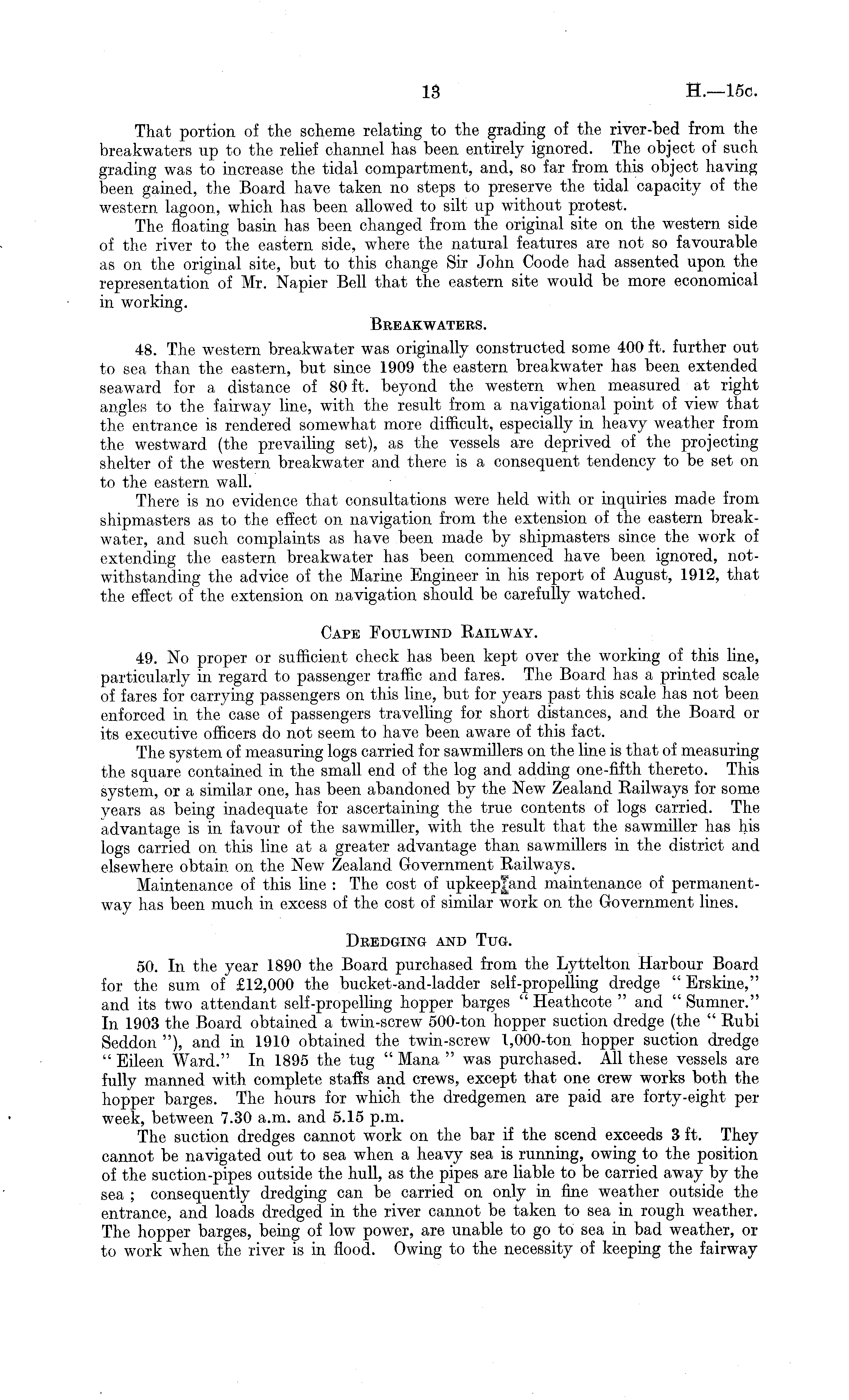 That portion of the scheme relating to the grading of the river-bed from the breakwaters up to the relief channel has been entirely ignored. The object of such grading was to increase the tidal compartment, and, so far from this object having been gained, the Board have taken no steps to preserve the tidal capacity of the western lagoon, which has been allowed to silt up without protest. The floating basin has been changed from the original site on the western side of the river to the eastern side, where the natural features are not so favourable as on the original site, but to this change Sir John Coode had assented upon the representation of Mr. Napier Bell that the eastern site would be more economical in working. Breakwaters. 48. The western breakwater was originally constructed some 400 ft. further out to sea than the eastern, but since 1909 the eastern breakwater has been extended seaward for a distance of 80 ft. beyond the western when measured at right angles to the fairway line, with the result from a navigational point of view that the entrance is rendered somewhat more difficult, especially in heavy weather from the westward (the prevailing set), as the vessels are deprived of the projecting shelter of the western breakwater and there is a consequent tendency to be set on to the eastern wall. There is no evidence that consultations were held with or inquiries made from shipmasters as to the effect on navigation from the extension of the eastern breakwater, and such complaints as have been made by shipmasters since the work of extending the eastern breakwater has been commenced have been ignored, notwithstanding the advice of the Marine Engineer in his report of August, 1912, that the effect of the extension on navigation should be carefully watched. Cape Foulwind Railway. 49. No proper or sufficient check has been kept over the working of this line, particularly in regard to passenger traffic and fares. The Board has a printed scale of fares for carrying passengers on this line, but for years past this scale has not been enforced in the case of passengers travelling for short distances, and the Board or its executive officers do not seem to have been aware of this fact. The system of measuring logs carried for sawmillers on the line is that of measuring the square contained in the small end of the log and adding one-fifth thereto. This system, or a similar one, has been abandoned by the New Zealand Railways for some years as being inadequate for ascertaining the true contents of logs carried. The advantage is in favour of the sawmiller, with the result that the sawmiller has his logs carried on this line at a greater advantage than sawmillers in the district and elsewhere obtain on. the New Zealand Government Railways. Maintenance of this line : The cost of upkeep|and maintenance of permanentway has been much in excess of the cost of similar work on the Government lines. Dredging and Tug. 50. In the year 1890 the Board purchased from the Lyttelton Harbour Board for the sum of £12,000 the bucket-and-ladder self-propelling dredge " Erskine," and its two attendant self-propelling hopper barges " Heathcote " and "Sumner." In 1903 the Board obtained a twin-screw 500-ton hopper suction dredge (the " Rubi Seddon "), and in 1910 obtained the twin-screw 1,000-ton hopper suction dredge " Eileen Ward." In 1895 the tug " Mana " was purchased. All these vessels are fully manned with complete staffs and crews, except that one crew works both the hopper barges. The hours for which the dredgemen are paid are forty-eight per week, between 7.30 a.m. and 5.15 p.m. The suction dredges cannot work on the bar if the scend exceeds 3 ft. They cannot be navigated out to sea when a heavy sea is running, owing to the position of the suction-pipes outside the hull, as the pipes are liable to be carried away by the sea ; consequently dredging can be carried on only in fine weather outside the entrance, and loads dredged in the river cannot be taken to sea in rough weather. The hopper barges, being of low power, are unable to go to sea in bad weather, or to work when the river is in flood. Owing to the necessity of keeping the fairway