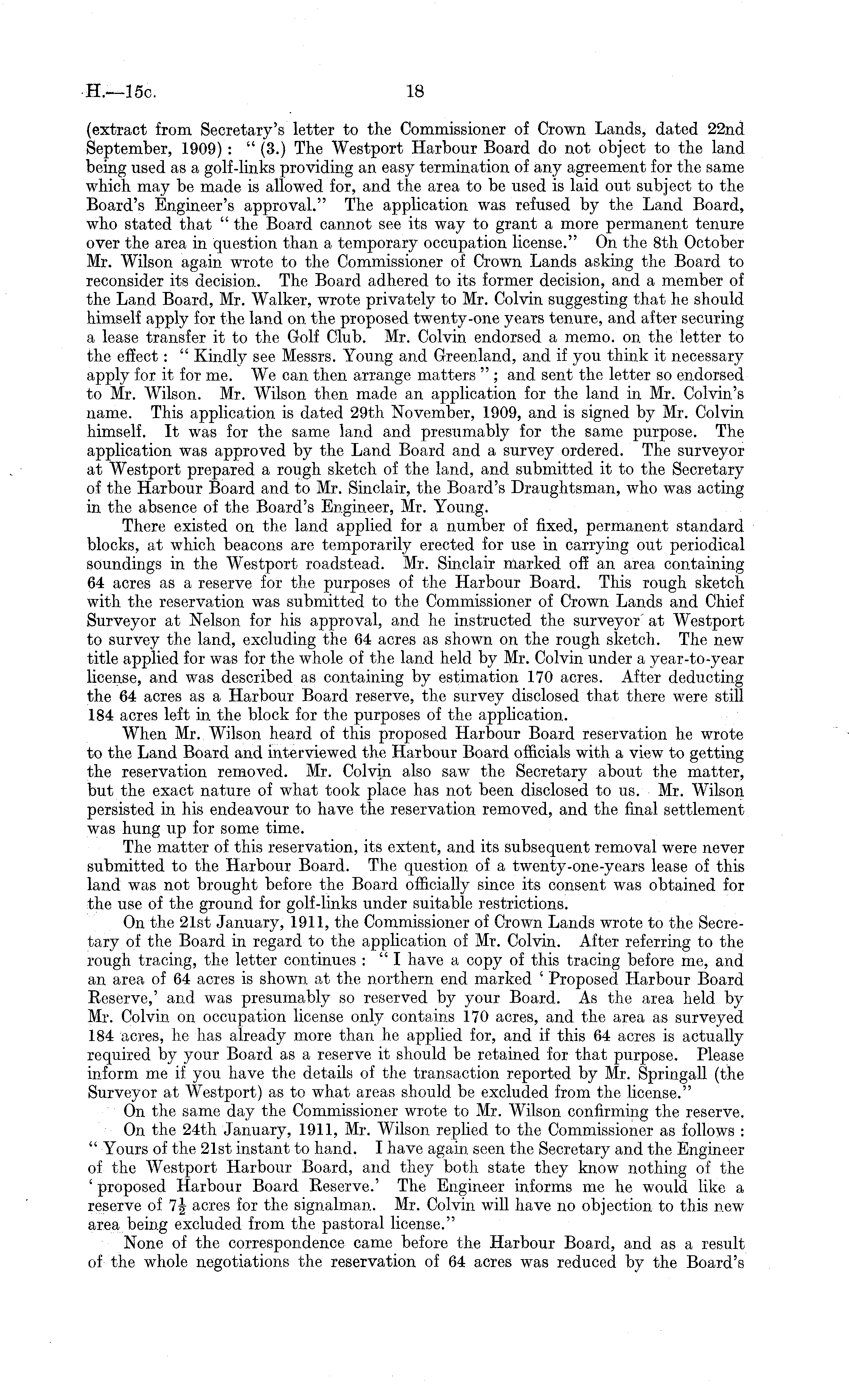 (extract from Secretary's letter to the Commissioner of Crown Lands, dated 22nd September, 1909) : " (3.) The Westport Harbour Board do not object to the land being used as a golf-links providing an easy termination of any agreement for the same which may be made is allowed for, and the area to be used is laid out subject to the Board's Engineer's approval." The application was refused by the Land Board, who stated that " the Board cannot see its way to grant a more permanent tenure over the area in question than a temporary occupation license." On the Bth October Mr. Wilson again wrote to the Commissioner of Crown Lands asking the Board to reconsider its decision. The Board adhered to its former decision, and a member of the Land Board, Mr. Walker, wrote privately to Mr. Colvin suggesting that he should himself apply for the land on the proposed twenty-one years tenure, and after securing a lease transfer it to the Golf Club. Mr. Colvin endorsed a memo, on the letter to the effect: " Kindly see Messrs. Young and Greenland, and if you think it necessary apply for it for me. We can then arrange matters " ; and sent the letter so endorsed to Mr. Wilson. Mr. Wilson then made an application for the land in Mr. Colvin's name. This application is dated 29th November, 1909, and is signed by Mr. Colvin himself. It was for the same land and presumably for the same purpose. The application was approved by the Land Board and a survey ordered. The surveyor at Westport prepared a rough sketch of the land, and submitted it to the Secretary of the Harbour Board and to Mr. Sinclair, the Board's Draughtsman, who was acting in the absence of the Board's Engineer, Mr. Young. There existed on the land applied for a number of fixed, permanent standard blocks, at which beacons are temporarily erected for use in carrying out periodical soundings in the Westport roadstead. Mr. Sinclair marked off an area containing 64 acres as a reserve for the purposes of the Harbour Board. This rough sketch with the reservation was submitted to the Commissioner of Crown Lands and Chief Surveyor at Nelson for his approval, and he instructed the surveyor at Westport to survey the land, excluding the 64 acres as shown on the rough sketch. The new title applied for was for the whole of the land held by Mr. Colvin under a year-to-year license, and was described as containing by estimation 170 acres. After deducting the 64 acres as a Harbour Board reserve, the survey disclosed that there were still 184 acres left in the block for the purposes of the application. When Mr. Wilson heard of this proposed Harbour Board reservation he wrote to the Land Board and interviewed the Harbour Board officials with a view to getting the reservation removed. Mr. Colvin also saw the Secretary about the matter, but the exact nature of what took place has not been disclosed to us. Mr. Wilson persisted in his endeavour to have the reservation removed, and the final settlement was hung up for some time. The matter of this reservation, its extent, and its subsequent removal were never submitted to the Harbour Board. The question of a twenty-one-years lease of this land was not brought before the Board officially since its consent was obtained for the use of the ground for golf-links under suitable restrictions. On the 21st January, 1911, the Commissioner of Crown Lands wrote to the Secretary of the Board in regard to the application of Mr. Colvin. After referring to the rough tracing, the letter continues : "I have a copy of this tracing before me, and an area of 64 acres is shown at the northern end marked ' Proposed Harbour Board Reserve,' and was presumably so reserved by your Board. As the area held by Mr. Colvin on occupation license only contains 170 acres, and the area as surveyed 184 acres, he has already more than he applied for, and if this 64 acres is actually required by your Board as a reserve it should be retained for that purpose. Please inform me if you have the details of the transaction reported by Mr. Springall (the Surveyor at Westport) as to what areas should be excluded from the license." On the same day the Commissioner wrote to Mr. Wilson confirming the reserve. On the 24th January, 1911, Mr. Wilson replied to the Commissioner as follows : " Yours of the 21st instant to hand. I have again seen the Secretary and the Engineer of the Westport Harbour Board, and they both state they know nothing of the ' proposed Harbour Board Reserve.' The Engineer informs me he would like a reserve of 1\ acres for the signalman. Mr. Colvin will have no objection to this new area being excluded from the pastoral license." None of the correspondence came before the Harbour Board, and as a result of the whole negotiations the reservation of 64 acres was reduced by the Board's