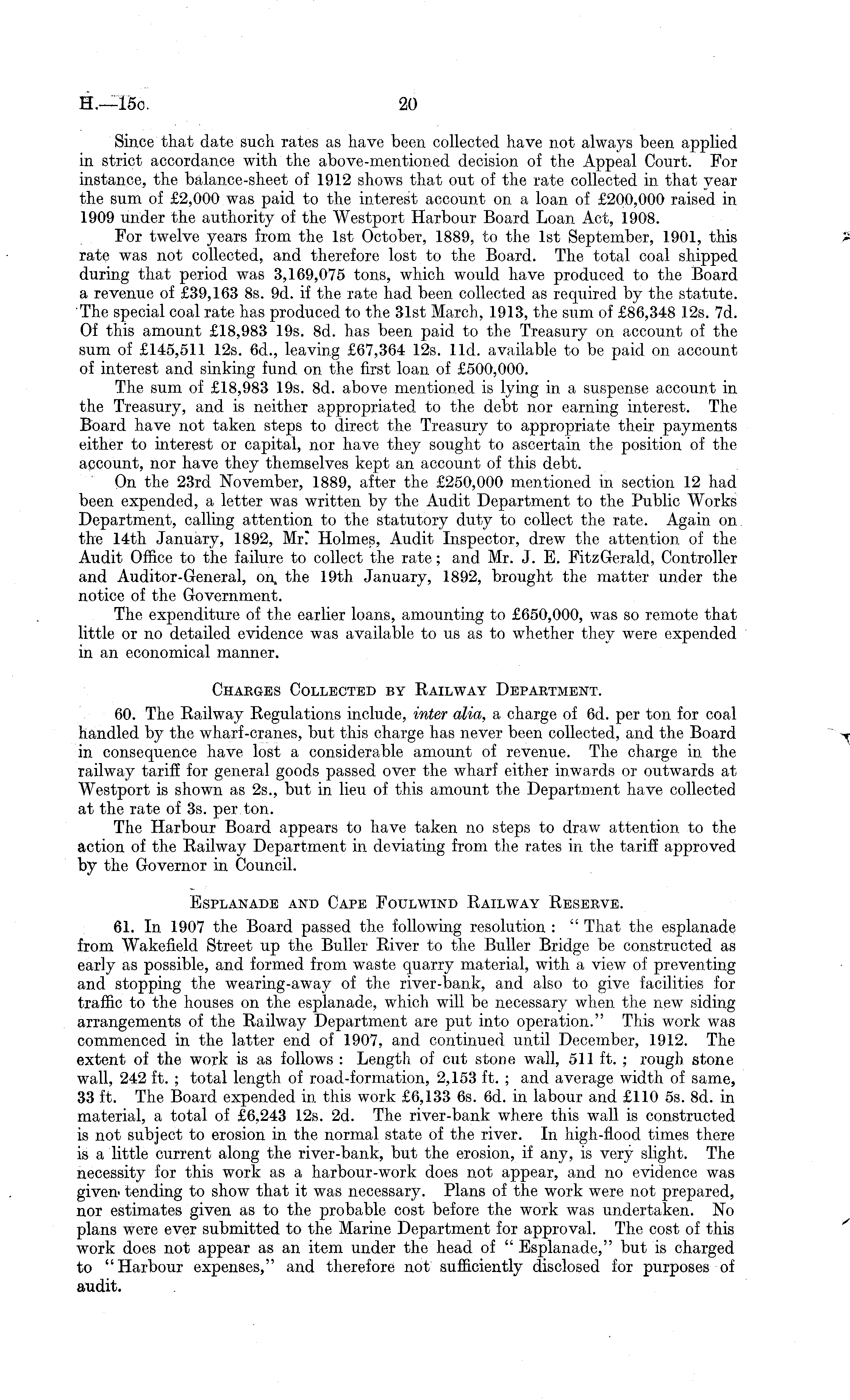 Since that date such rates as have been collected have not always been applied in strict accordance with the above-mentioned decision of the Appeal Court. For instance, the balance-sheet of 1912 shows that out of the rate collected in that year the sum of £2,000 was paid to the interest account on a loan of £200,000 raised in 1909 under the authority of the Westport Harbour Board Loan Act, 1908. For twelve years from the Ist October, 1889, to the Ist September, 1901, this rate was not collected, and therefore lost to the Board. The total coal shipped during that period was 3,169,075 tons, which would have produced to the Board a revenue of £39,163 Bs. 9d. if the rate had been collected as required by the statute. The special coal rate has produced to the 31st March, 1913, the sum of £86,348 12s. 7d. Of this amount £18,983 19s. Bd. has been paid to the Treasury on account of the sum of £145,511 12s. 6d., leaving £67,364 12s. lid. available to be paid on account of interest and sinking fund on the first loan of £500,000. The sum of £18,983 19s. Bd. above mentioned is lying in a suspense account in the Treasury, and is neither appropriated to the debt nor earning interest. The Board have not taken steps to direct the Treasury to appropriate their payments either to interest or capital, nor have they sought to ascertain the position of the account, nor have they themselves kept an account of this debt. On the 23rd November, 1889, after the £250,000 mentioned in section 12 had been expended, a letter was written by the Audit Department to the Public Works Department, calling attention to the statutory duty to collect the rate. Again on the 14th January, 1892, Mr" Holmes, Audit Inspector, drew the attention of the Audit Office to the failure to collect the rate; and Mr. J. E. FitzGerald, Controller and Auditor-General, on, the 19th January, 1892, brought the matter under the notice of the Government. The expenditure of the earlier loans, amounting to £650,000, was so remote that little or no detailed evidence was available to us as to whether they were expended in an economical manner. Charges Collected by Railway Department. 60. The Railway Regulations include, inter alia, a charge of 6d. per ton for coal handled by the wharf-cranes, but this charge has never been collected, and the Board in consequence have lost a considerable amount of revenue. The charge in the railway tariff for general goods passed over the wharf either inwards or outwards at Westport is shown as 25., but in lieu of this amount the Department have collected at the rate of 3s. per ton. The Harbour Board appears to have taken no steps to draw attention to the action of the Railway Department in deviating from the rates in the tariff approved by the Governor in Council. Esplanade and Cape Foulwind Railway Reserve. 61. In 1907 the Board passed the following resolution : " That the esplanade from Wakefield Street up the Buller River to the Buller Bridge be constructed as early as possible, and formed from waste quarry material, with a view of preventing and stopping the wearing-away of the river-bank, and also to give facilities for traffic to the houses on the esplanade, which will be necessary when the new siding arrangements of the Railway Department are put into operation." This work was commenced in the latter end of 1907, and continued until December, 1912. The extent of the work is as follows : Length of cut stone wall, 511 ft. ; rough stone wall, 242 ft. ; total length of road-formation, 2,153 ft. ; and average width of same, 33 ft. The Board expended in this work £6,133 6s. 6d. in labour and £110 ss. Bd. in material, a total of £6,243 12s. 2d. The river-bank where this wall is constructed is not subject to erosion in the normal state of the river. In high-flood times there is a little current along the river-bank, but the erosion, if any, is very slight. The necessity for this work as a harbour-work does not appear, and no evidence was given tending to show that it was necessary. Plans of the work were not prepared, nor estimates given as to the probable cost before the work was undertaken. No plans were ever submitted to the Marine Department for approval. The cost of this work does not appear as an item under the head of " Esplanade," but is charged to "Harbour expenses," and therefore not sufficiently disclosed for purposes of audit.