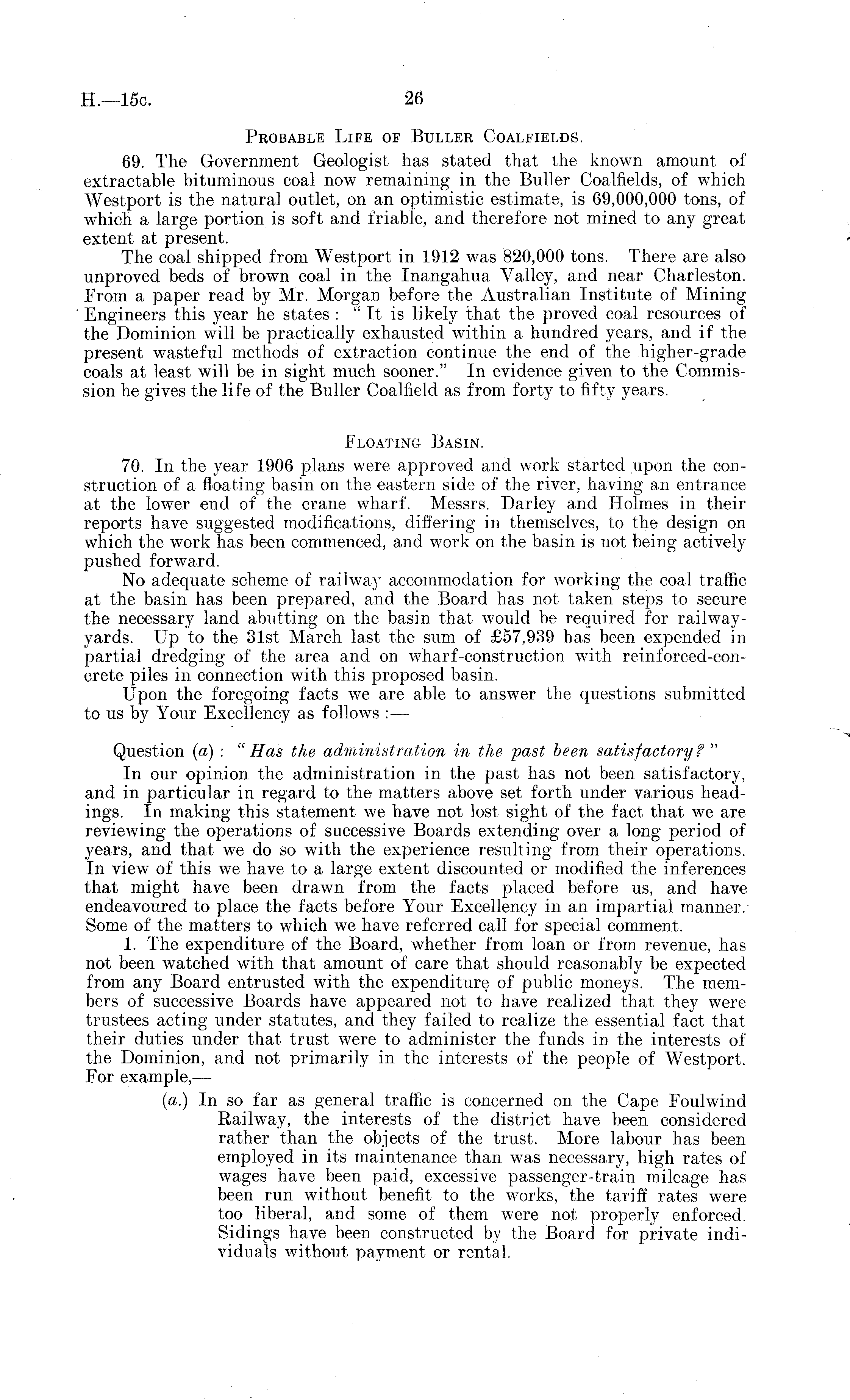 Probable Life of Buller Coalfields. 69. The Government Geologist has stated that the known amount of extractable bituminous coal now remaining in the Buller Coalfields, of which Westport is the natural outlet, on an optimistic estimate, is 69,000,000 tons, of which a large portion is soft and friable, and therefore not mined to any great extent at present. The coal shipped from Westport in 1912 was 820,000 tons. There are also unproved beds of brown coal in the Inangahua Valley, and near Charleston. From a paper read by Mr. Morgan before the Australian Institute of Mining Engineers this year he states : "It is likely that the proved coal resources of the Dominion will be practically exhausted within a hundred years, and if the present wasteful methods of extraction continue the end of the higher-grade coals at least will be in sight much sooner." In evidence given to the Commission he gives the life of the Buller Coalfield as from forty to fifty years. Floating Basin. 70. In the year 1906 plans were approved and work started upon the construction of a floating basin on the eastern side of the river, having an entrance at the lower end of the crane wharf. Messrs. Darley and Holmes in their reports have suggested modifications, differing in themselves, to the design on which the work has been commenced, and work on the basin is not being actively pushed forward. No adequate scheme of railway accommodation for working the coal traffic at the basin has been prepared, and the Board has not taken steps to secure the necessary land abutting on the basin that would be required for railwayyards. Up to the 31st March last the sum of £57,939 has been expended in partial dredging of the area and on wharf-construction with reinfbrced-con-crete piles in connection with this proposed basin. Upon the foregoing facts we are able to answer the questions submitted to us by Your Excellency as follows : — Question (a) : "Has the administration in the past been satisfactory? " In our opinion the administration in the past has not been satisfactory, and in particular in regard to the matters above set forth under various headings. In making this statement we have not lost sight of the fact that we are reviewing the operations of successive Boards extending over a long period of years, and that we do so with the experience resulting from their operations. In view of this we have to a large extent discounted or modified the inferences that might have been drawn from the facts placed before us, and have endeavoured to place the facts before Your Excellency in an impartial manner. Some of the matters to which we have referred call for special comment. 1. The expenditure of the Board, whether from loan or from revenue, has not been watched with that amount of care that should reasonably be expected from any Board entrusted with the expenditure of public moneys. The members of successive Boards have appeared not to have realized that they were trustees acting under statutes, and they failed to realize the essential fact that their duties under that trust were to administer the funds in the interests of the Dominion, and not primarily in the interests of the people of Westport. For example,— (a.) In so far as general traffic is concerned on the Cape Foulwind Railway, the interests of the district have been considered rather than the objects of the trust. More labour has been employed in its maintenance than was necessary, high rates of wages have been paid, excessive passenger-train mileage has been run without benefit to the works, the tariff rates were too liberal, and some of them were not properly enforced. Sidings have been constructed by the Board for private individuals without payment or rental.