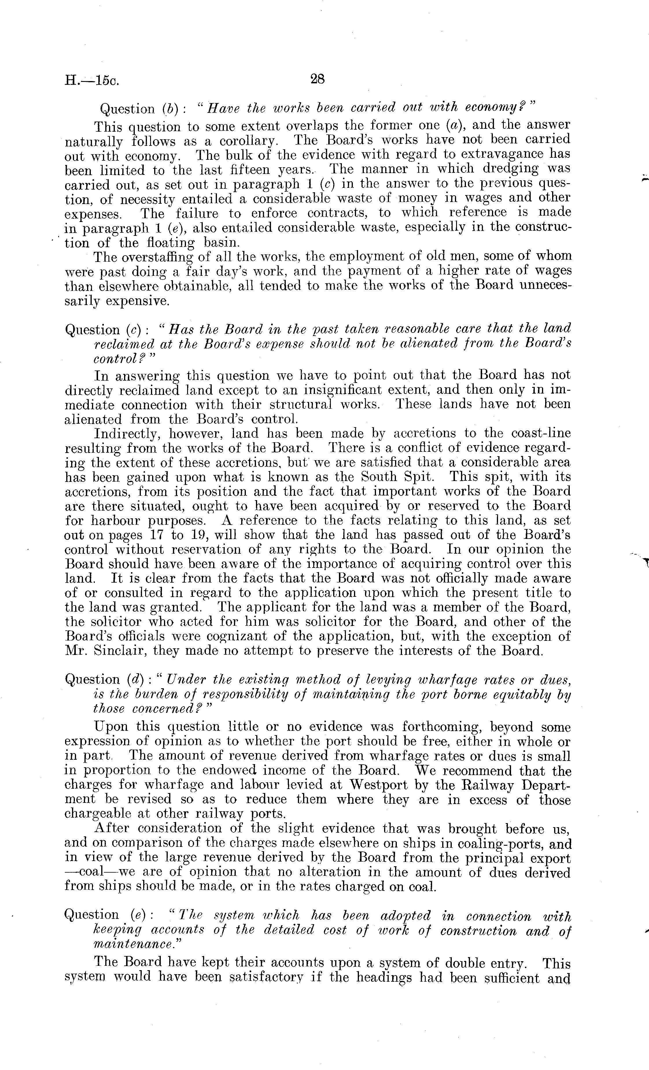 Question (b) : "Have the works been carried out with economyf" This question to some extent overlaps the former one (a), and the answer naturally follows as a corollary. The Board's works have not been carried out with economy. The bulk of the evidence with regard to extravagance has been limited to the last fifteen years. The manner in which dredging was carried out, as set out in paragraph 1 (c) in the answer to the previous question, of necessity entailed a considerable waste of money in wages and other expenses. The failure to enforce contracts, to which reference is made in paragraph 1 (c), also entailed considerable waste, especially in the construction of the floating basin. The overstaffing of all the works, the employment of old men, some of whom were past doing a fair day's work, and the payment of a higher rate of wages than elsewhere obtainable, all tended to make the works of the Board unnecessarily expensive. Question (c) : " Has the Board in the vast taken reasonable care that the land reclaimed at the Board's expense should not be alienated from the Board's control?" In answering this question we have to point out that the Board has not directly reclaimed land except to an insignificant extent, and then only in immediate connection with their structural works. These lands have not been alienated from the Board's control. Indirectly, however, land has been made by accretions to the coast-line resulting from the works of the Board. There is a conflict of evidence regarding the extent of these accretions, but we are satisfied that a considerable area has been gained upon what is known as the South Spit. This spit, with its accretions, from its position and the fact that important works of the Board are there situated, ought to have been acquired by or reserved to the Board for harbour purposes. A reference to the facts relating to this land, as set out on pages 17 to 19, will show that the land has passed out of the Board's control without reservation of any rights to the Board. In our opinion the Board should have been aware of the importance of acquiring control over this land. It is clear from the facts that the Board w r as not officially made aware of or consulted in regard to the application upon which the present title to the land was granted. The applicant for the land was a member of the Board, the solicitor who acted for him was solicitor for the Board, and other of the Board's officials were cognizant of the application, but, with the exception of Mr. Sinclair, they made no attempt to preserve the interests of the Board. Question (d) : " Under the existing method of levying wharfage rates or dues, is the burden of responsibility of maintaining the port borne equitably by those concerned ? " Upon this question little or no evidence was forthcoming, beyond some expression of opinion as to whether the port should be free, either in whole or in part. The amount of revenue derived from wharfage rates or dues is small in proportion to the endowed income of the Board. We recommend that the charges for wharfage and labour levied at Westport by the Railway Department be revised so as to reduce them where they are in excess of those chargeable at other railway ports. After consideration of the slight evidence that was brought before us, and on comparison of the charges made elsewhere on ships in coaling-ports, and in view of the large revenue derived by the Board from the principal export —coal—we are of opinion that no alteration in the amount of dues derived from ships should be made, or in the rates charged on coal. Question (c) : " The system which has been adopted in connection with keeping accounts of the detailed cost of work of construction and of maintenance." The Board have kept their accounts upon a system of double entry. This system would have been satisfactory if the headings had been sufficient and